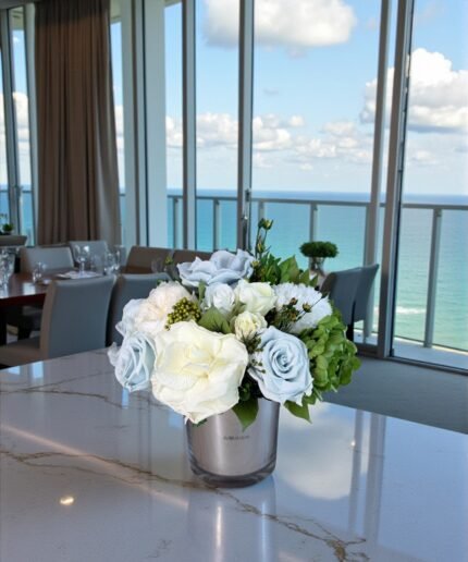 Juliette is small mirror glass vase arrangement embodies understated luxury and timeless sophistication. Soft creamy and baby blue roses unfold