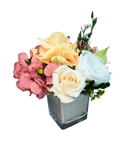 Kate is smallest mirror vase arrangement featuring delicate peach and white roses and deep pink hydrangeas in a square mirror