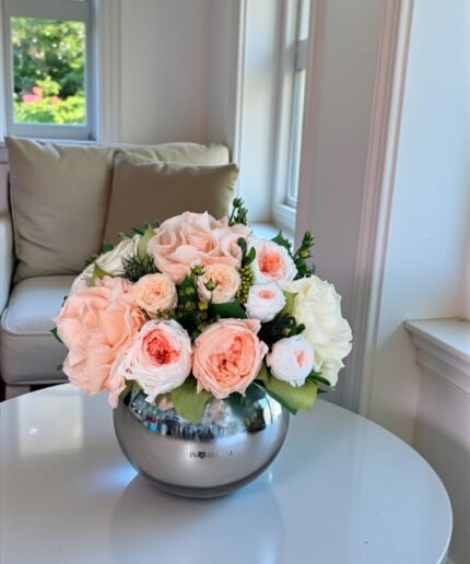 Juliette is small mirror glass vase arrangement embodies understated luxury and timeless sophistication. Soft ivory and blush roses unfold in