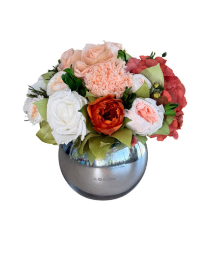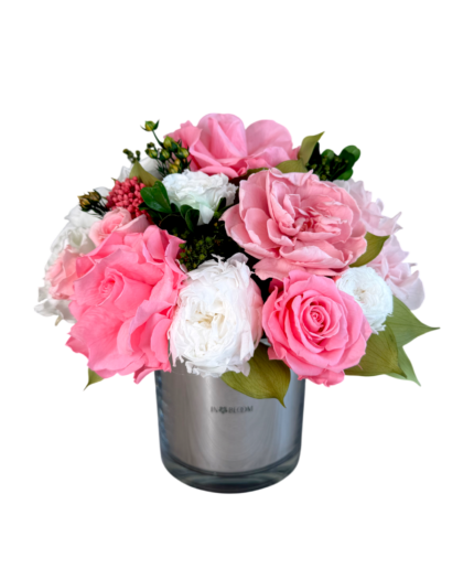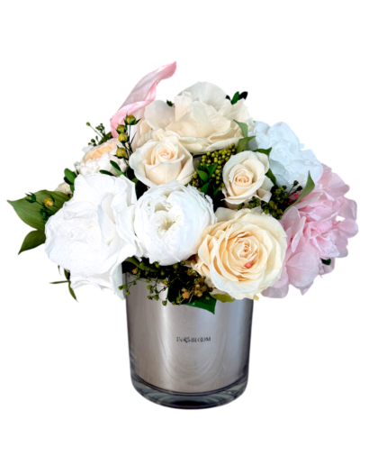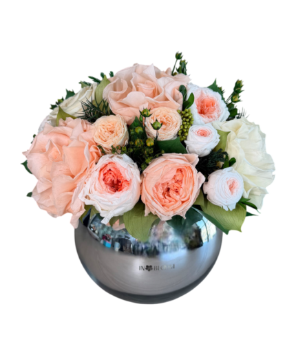 is a delicate celebration of floral artistry, blending soft romance with timeless elegance. Featuring bio-preserved premium garden roses, lilies, peonies