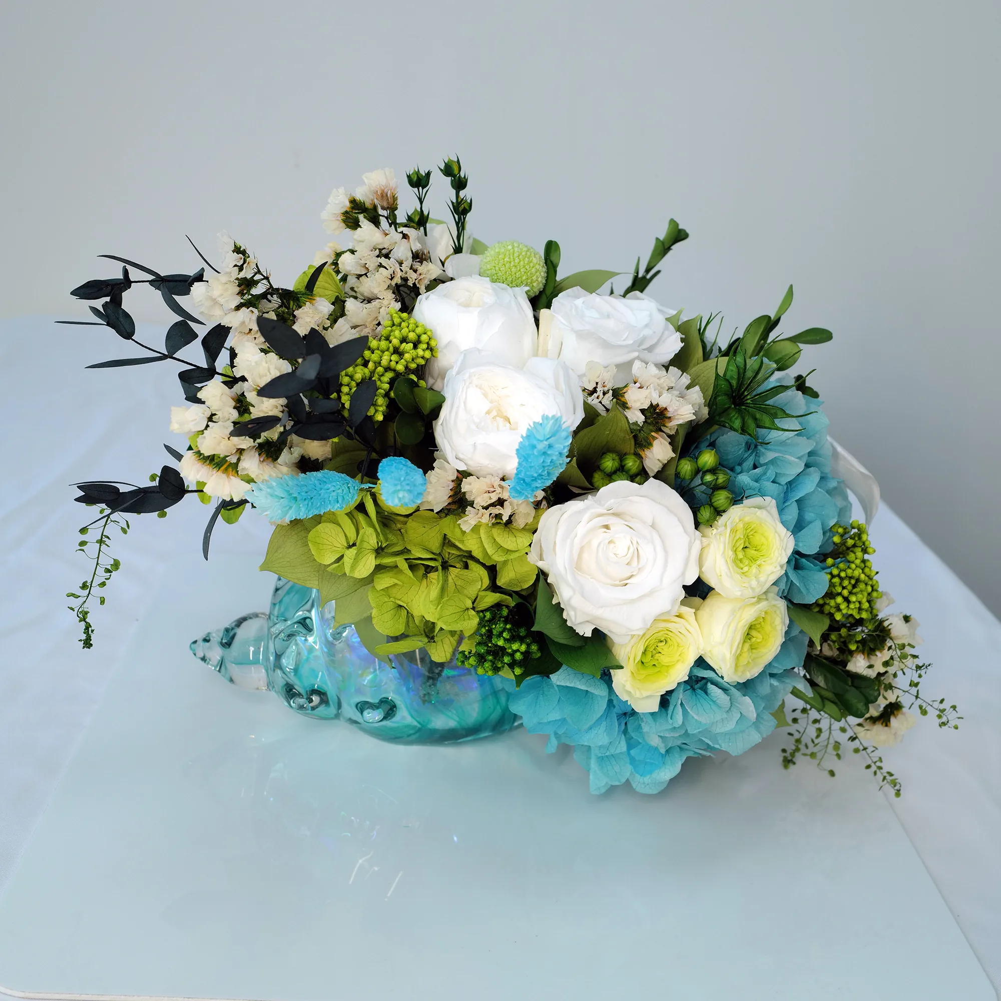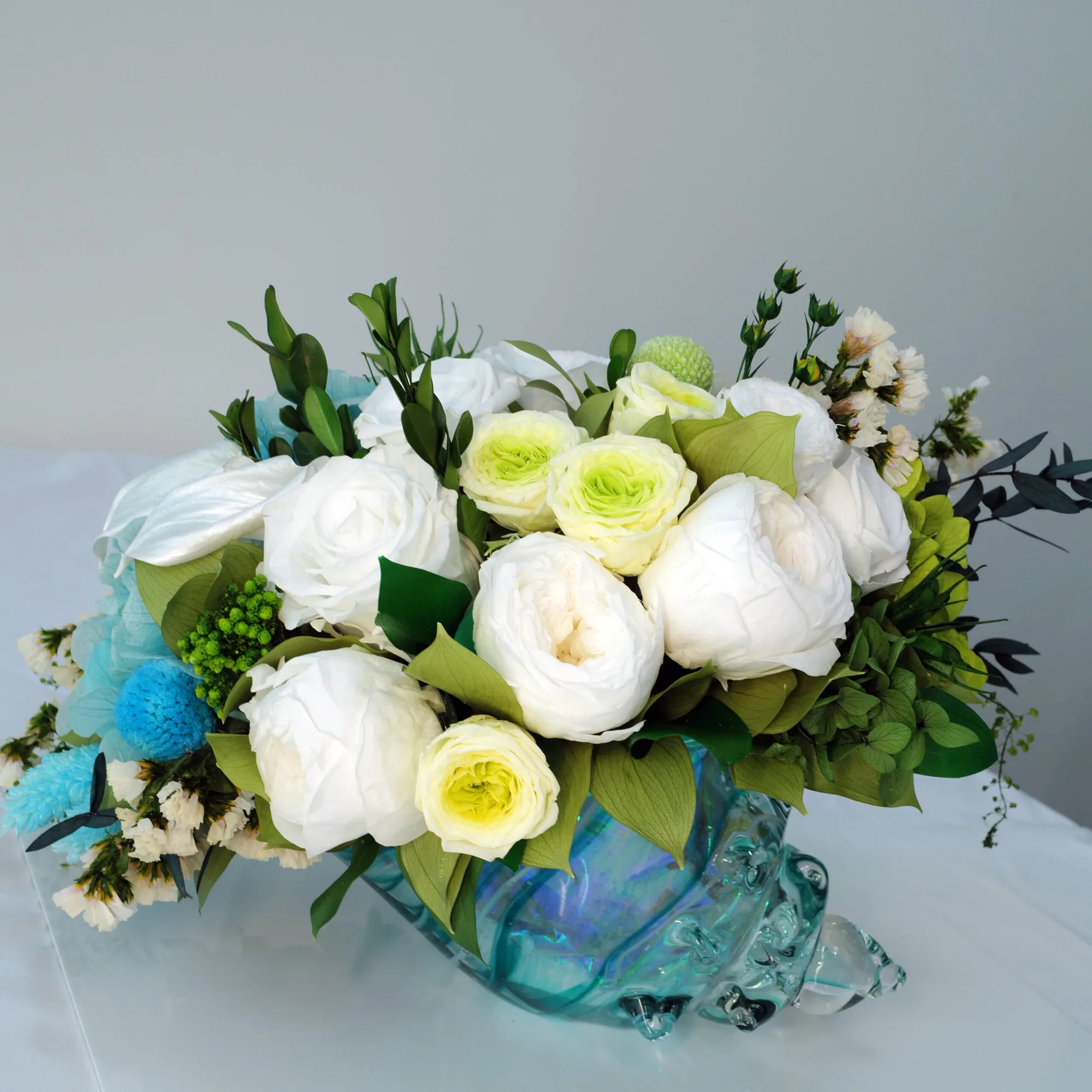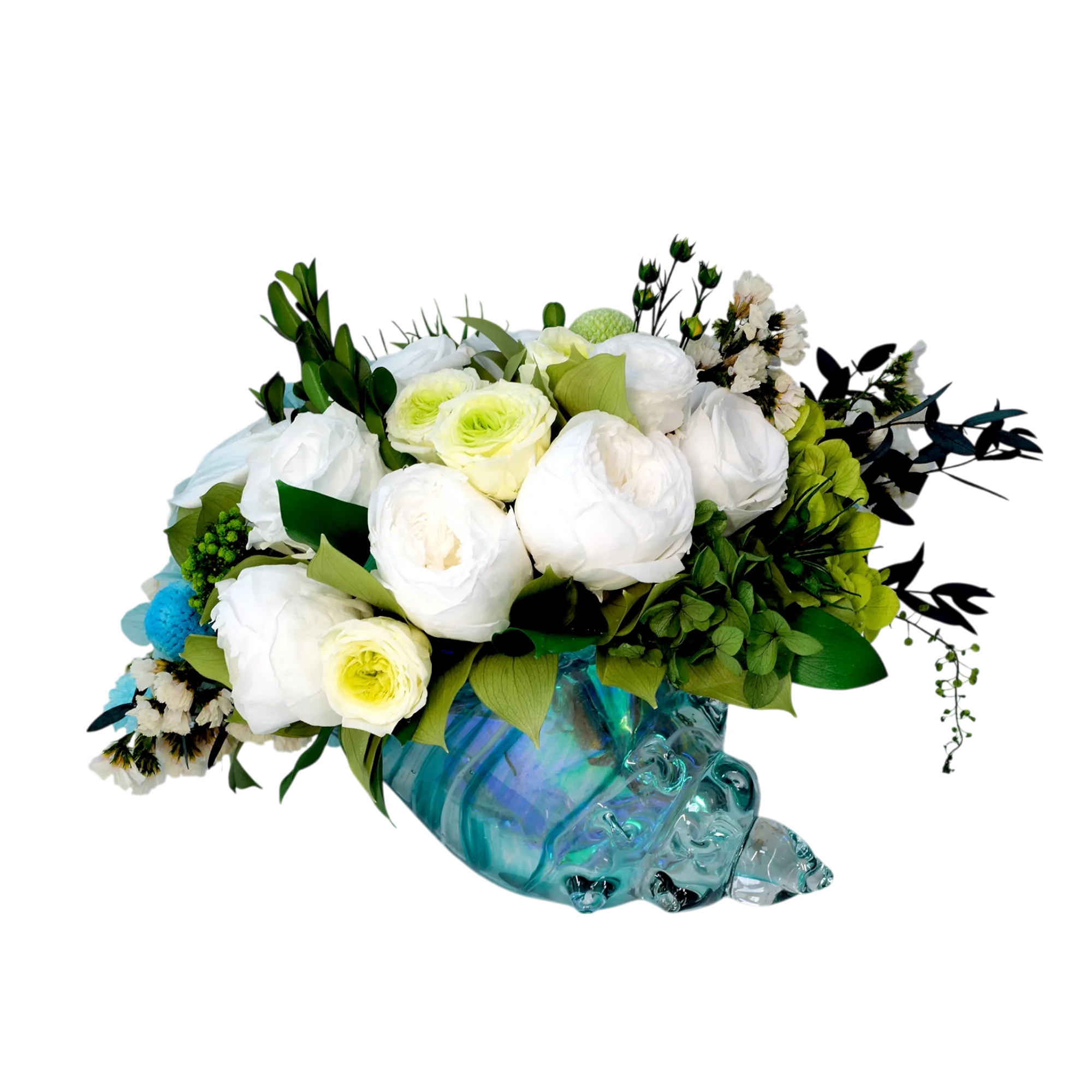 Blue Lagoon is a stunning bio-preserved arrangement in a unique designer glass vase in a shape of a shell. This exquisite piece features a harmonious mix of green and white eternal classic and garden roses, hydrangeas and a variety of greens. Perfect for adding a touch of refined beauty and sophistication to any space.