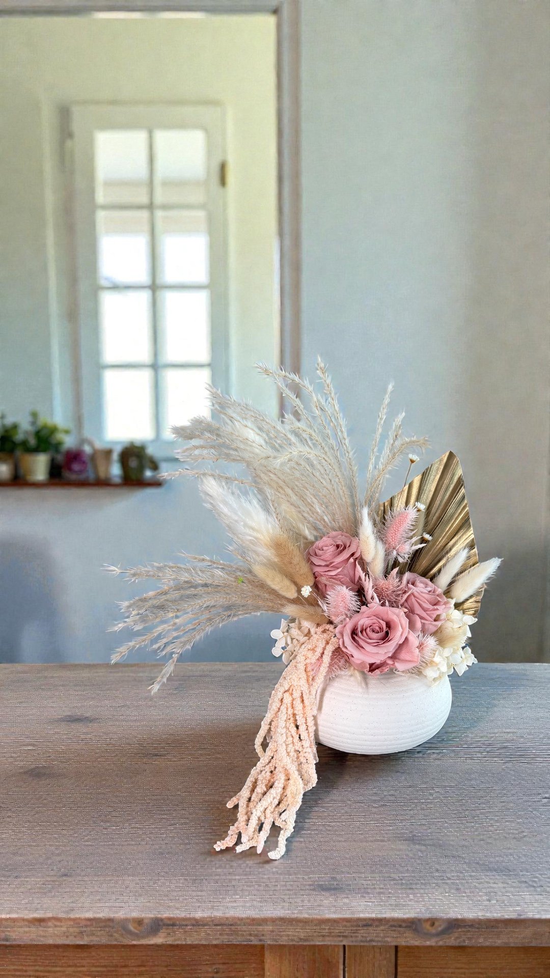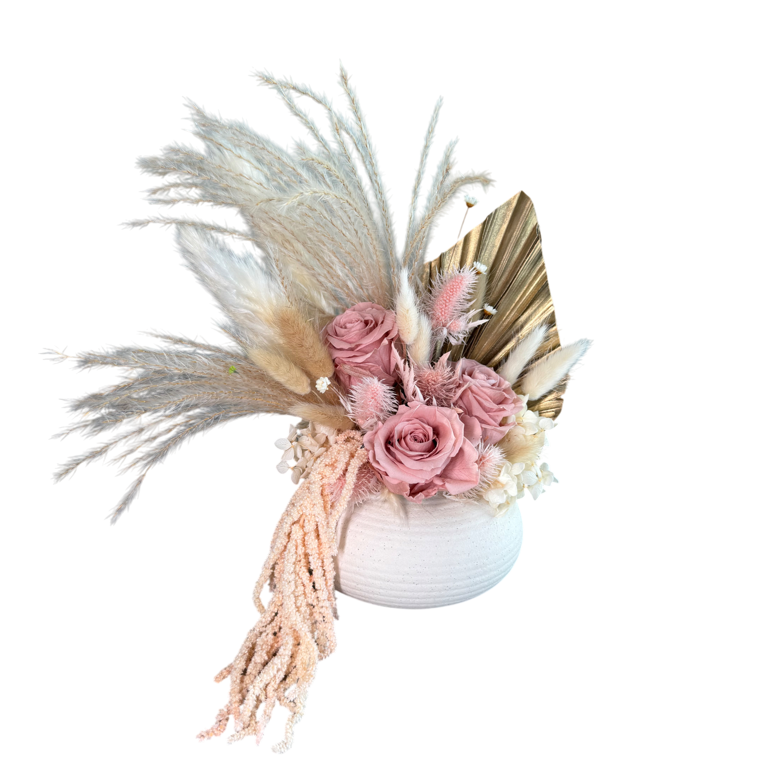 This piece is crafted exclusively from 100% natural flowers that have been bio-preserved to last up to one year without the need for water or maintenance. Please note that each arrangement is uniquely designed by our in-house florists, so natural variations in color, shape, and composition are to be expected.