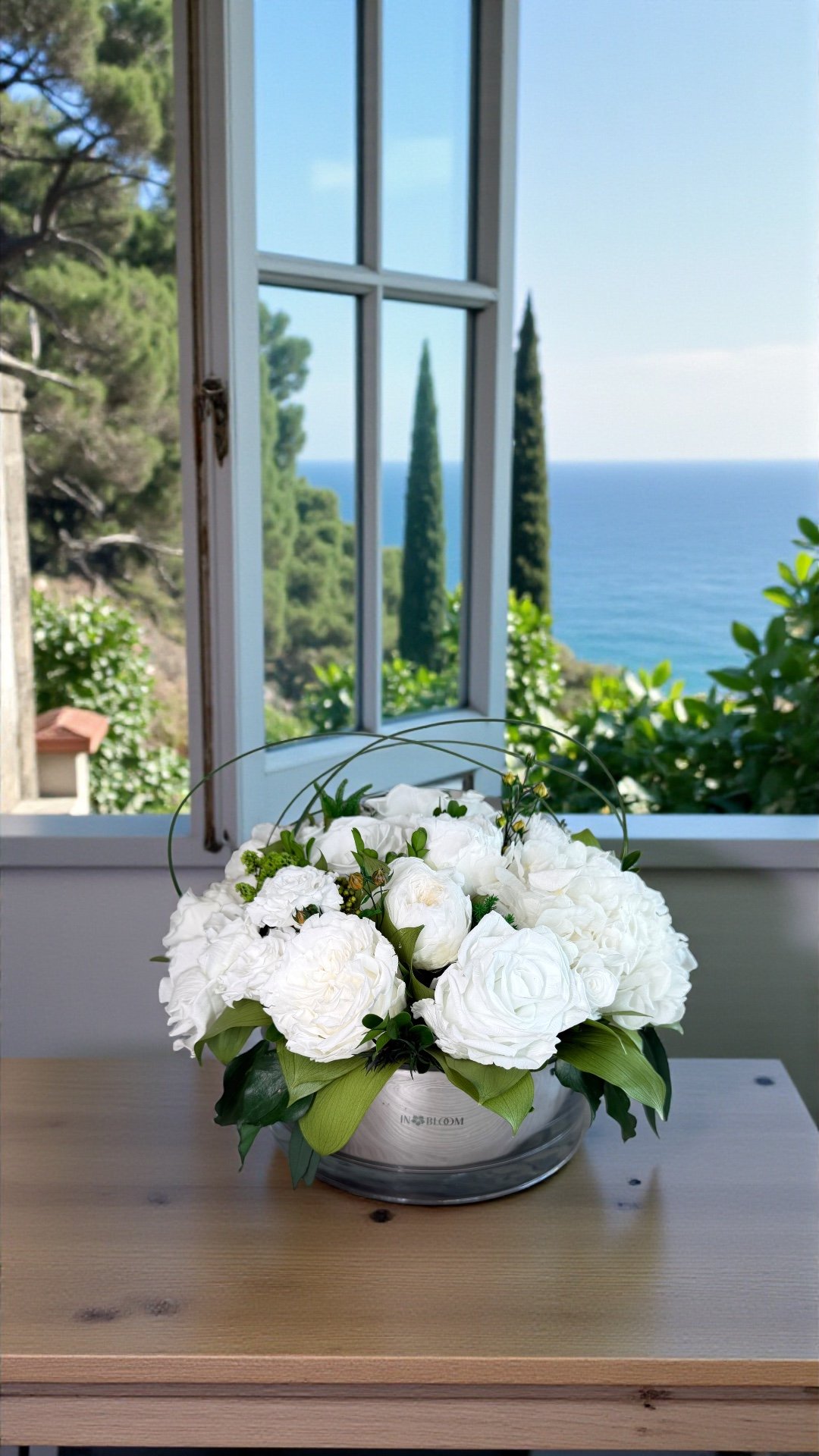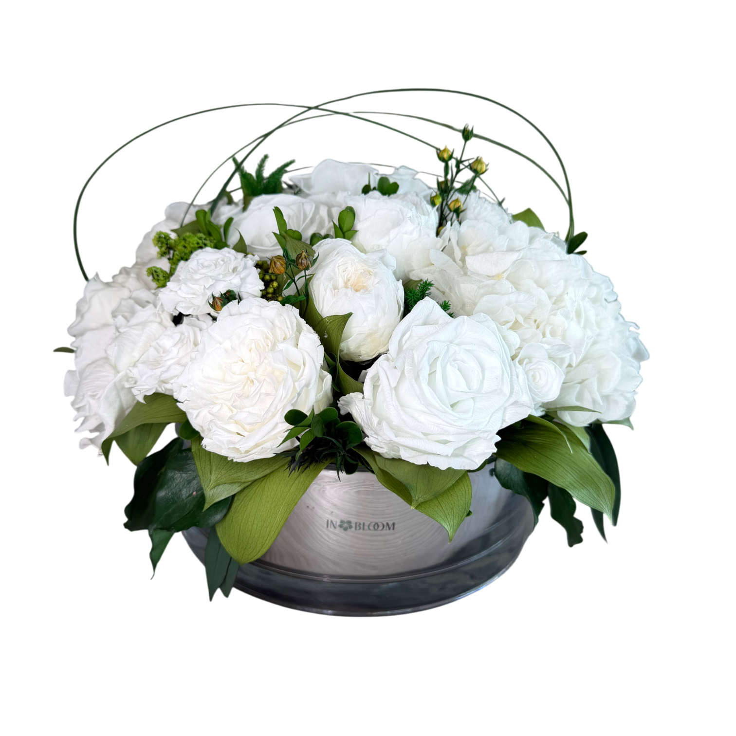 Grace is a delicate celebration of floral artistry, blending soft romance with timeless elegance. Featuring bio-preserved premium roses, orchids and hydrangeas this arrangement is complemented by italian ruscus and ivy leaves for a naturally flowing composition.