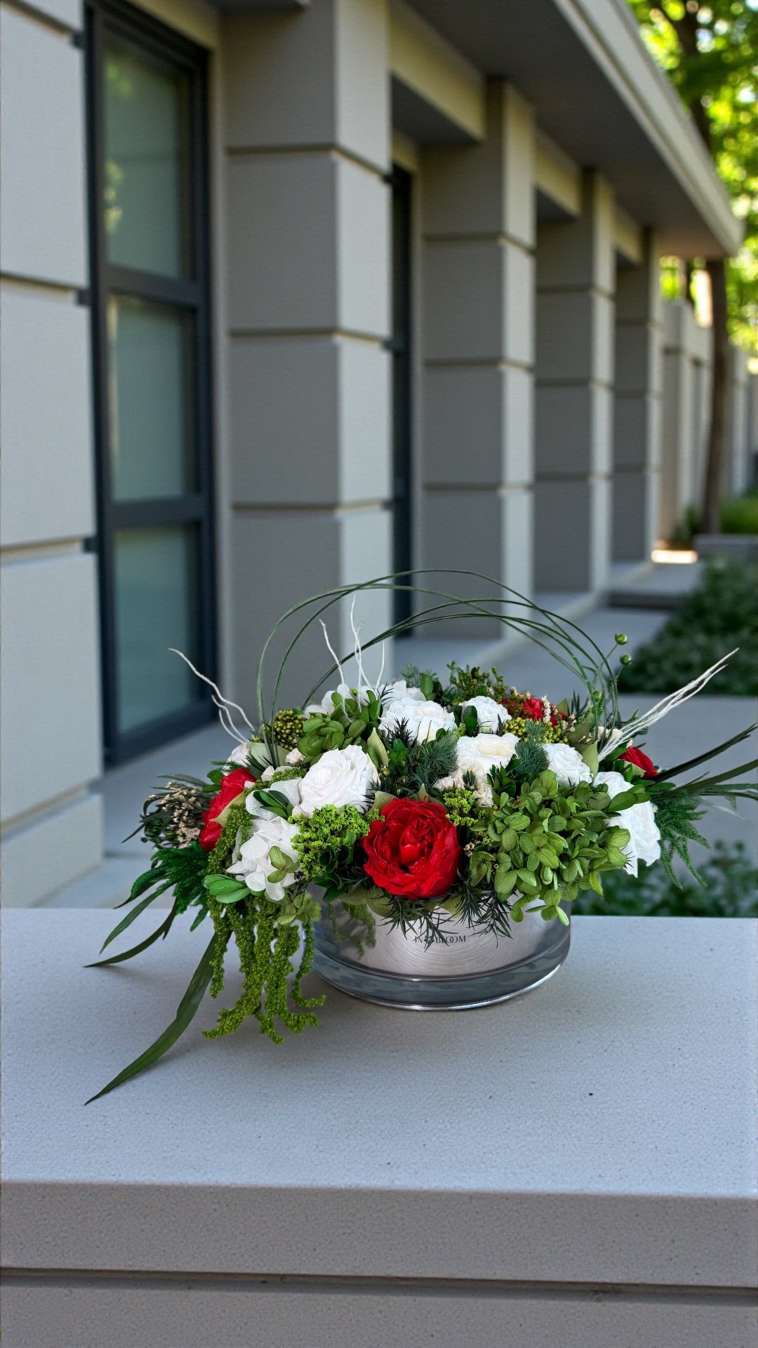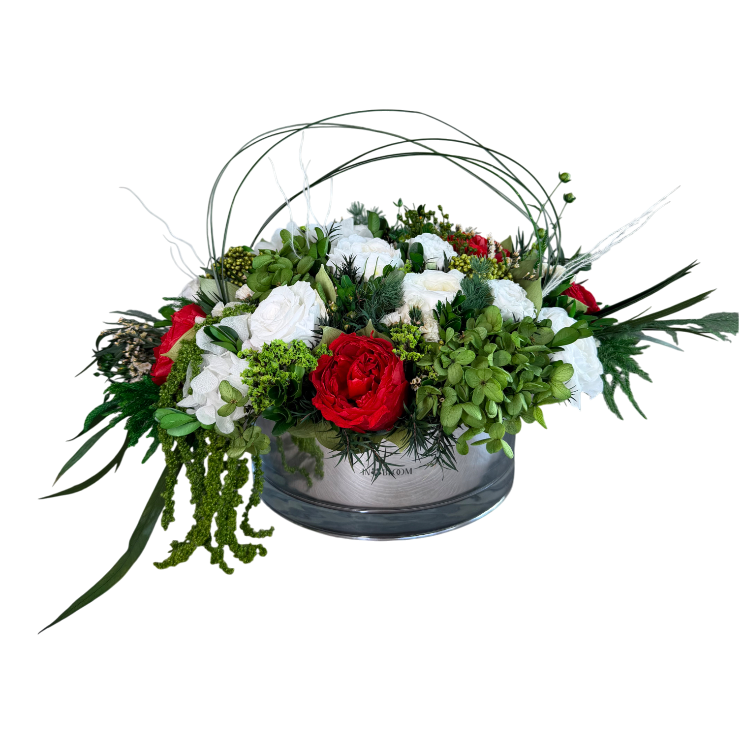 Grace is a delicate celebration of floral artistry, blending soft romance with timeless elegance. Featuring bio-preserved premium roses, lush callas, hydrangeas and garden roses, this arrangement is complemented by italian ruscus and ivy leaves for a naturally flowing composition.