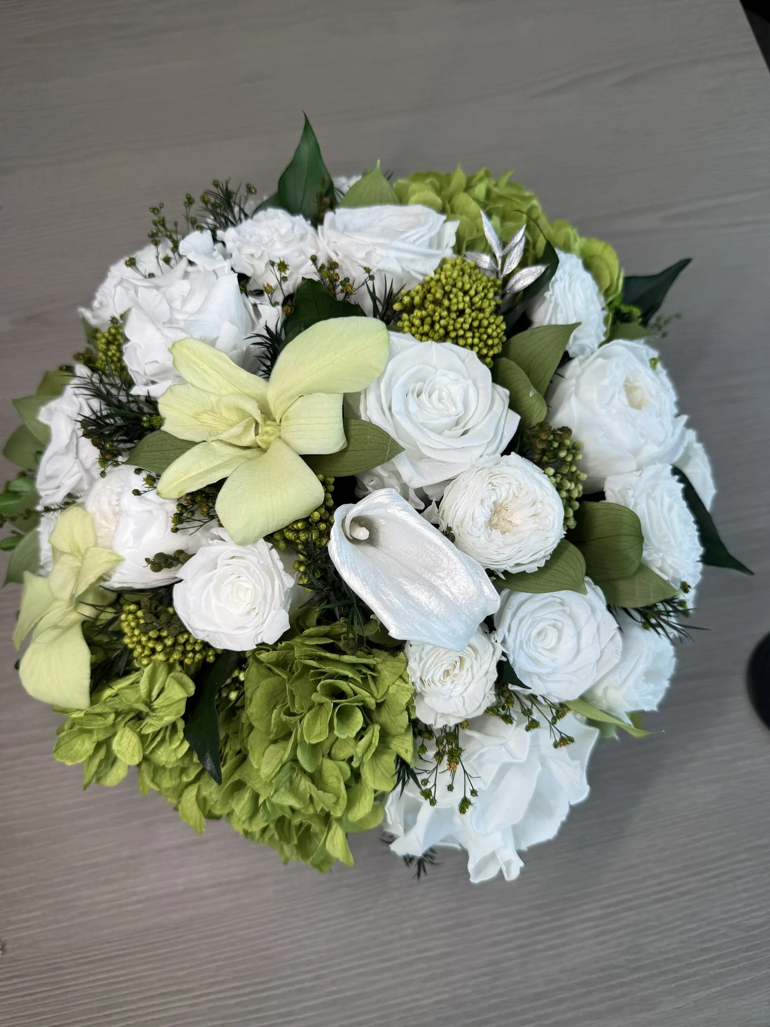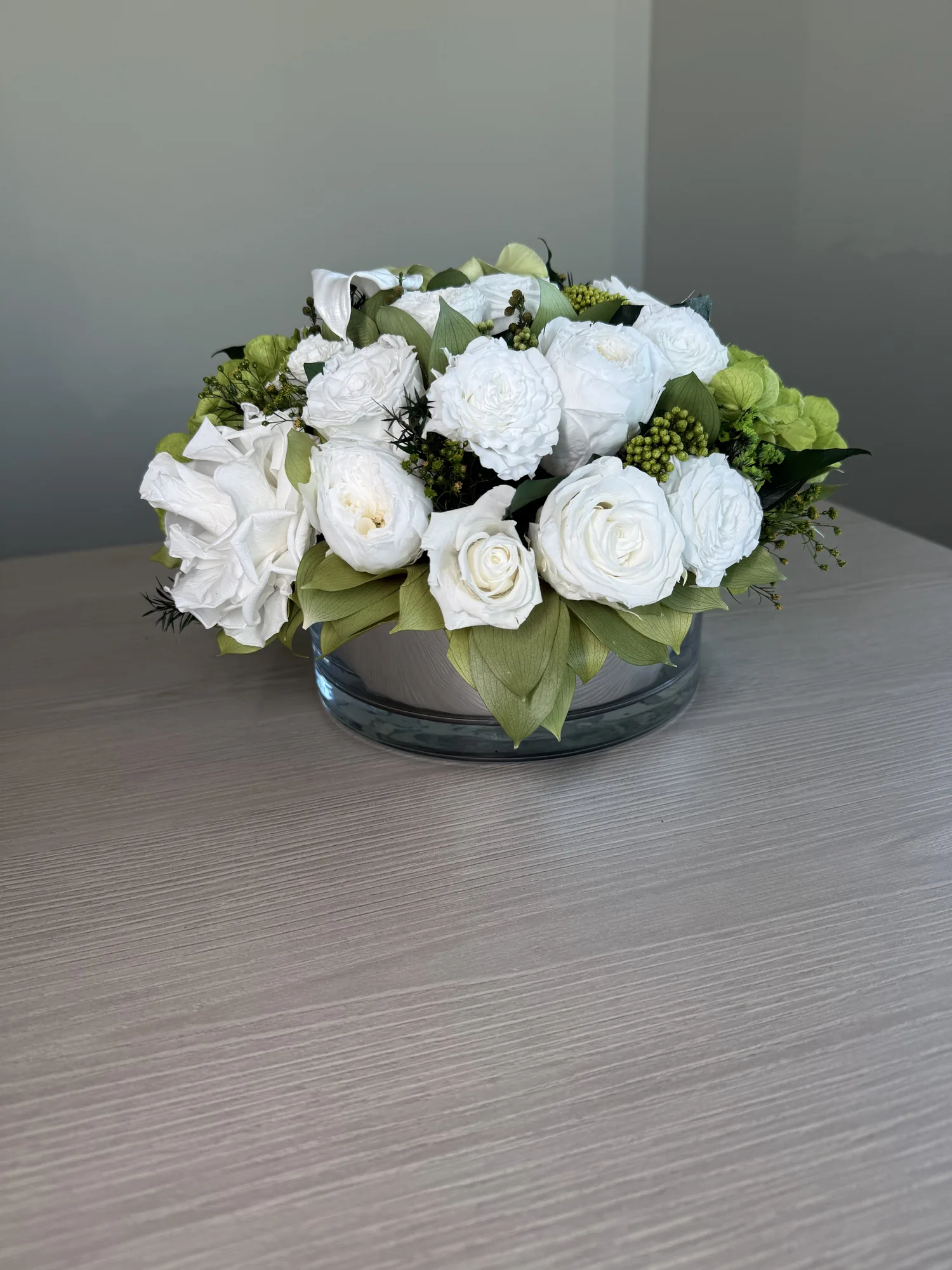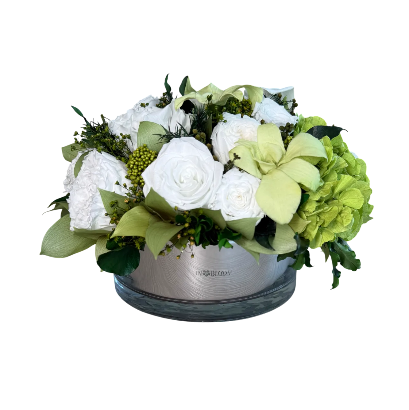 Grace is a delicate celebration of floral artistry, blending soft romance with timeless elegance. Featuring bio-preserved premium roses, orchids and hydrangeas this arrangement is complemented by italian ruscus and ivy leaves for a naturally flowing composition.
