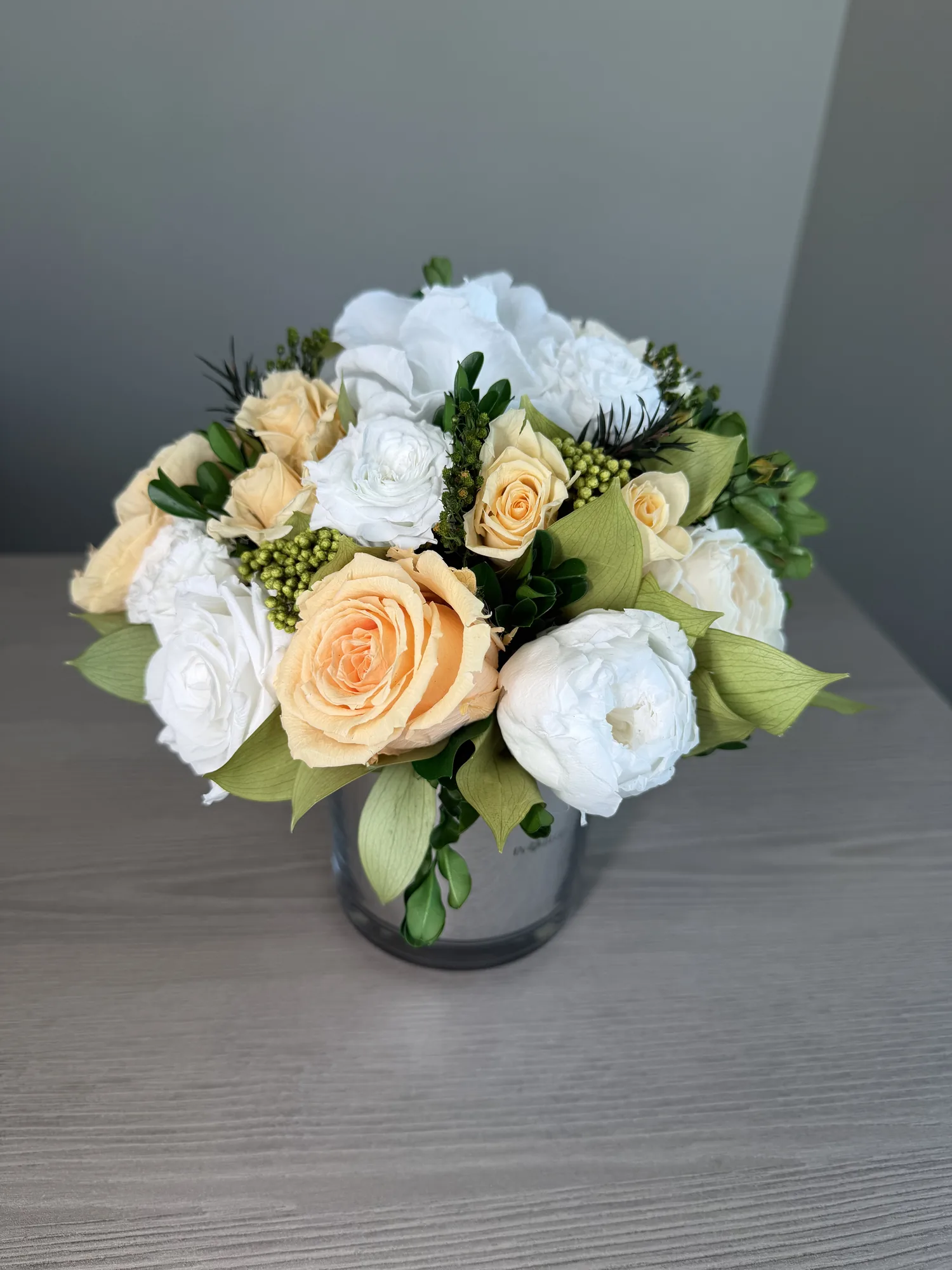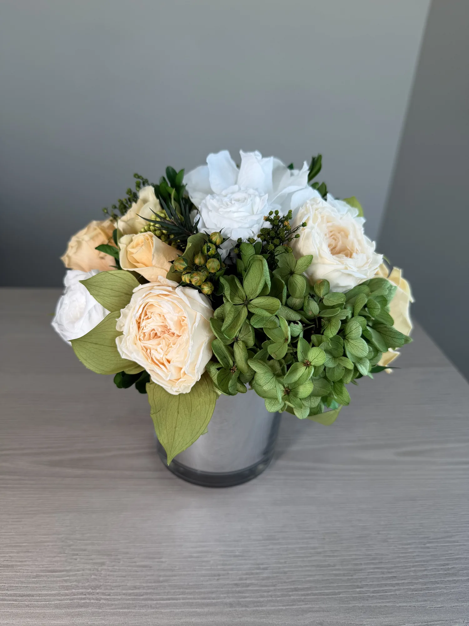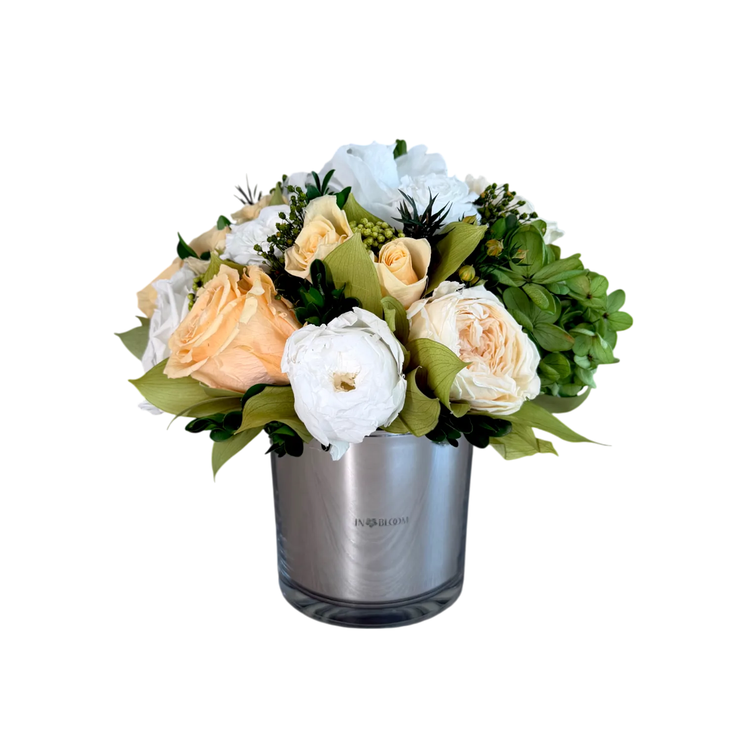 Juliette is small arrangement fulfilled with cream and blush roses that are layered with sculptural white blooms and verdant green accents, creating a composition that feels both refined and organic. Nestled in a mirror glass vessel, the arrangement balances warmth and modernity, echoing the serene coastal horizon beyond the glass.