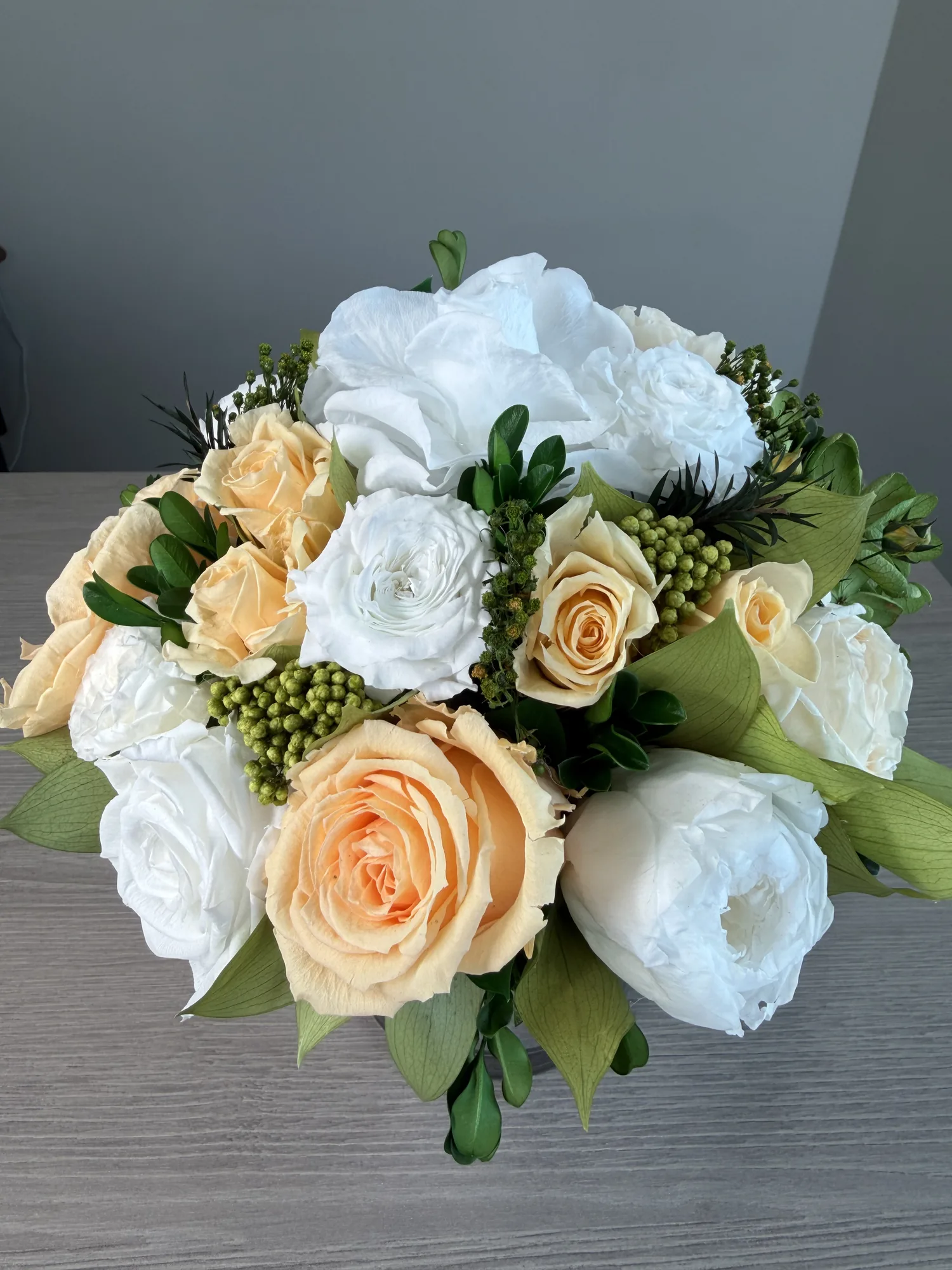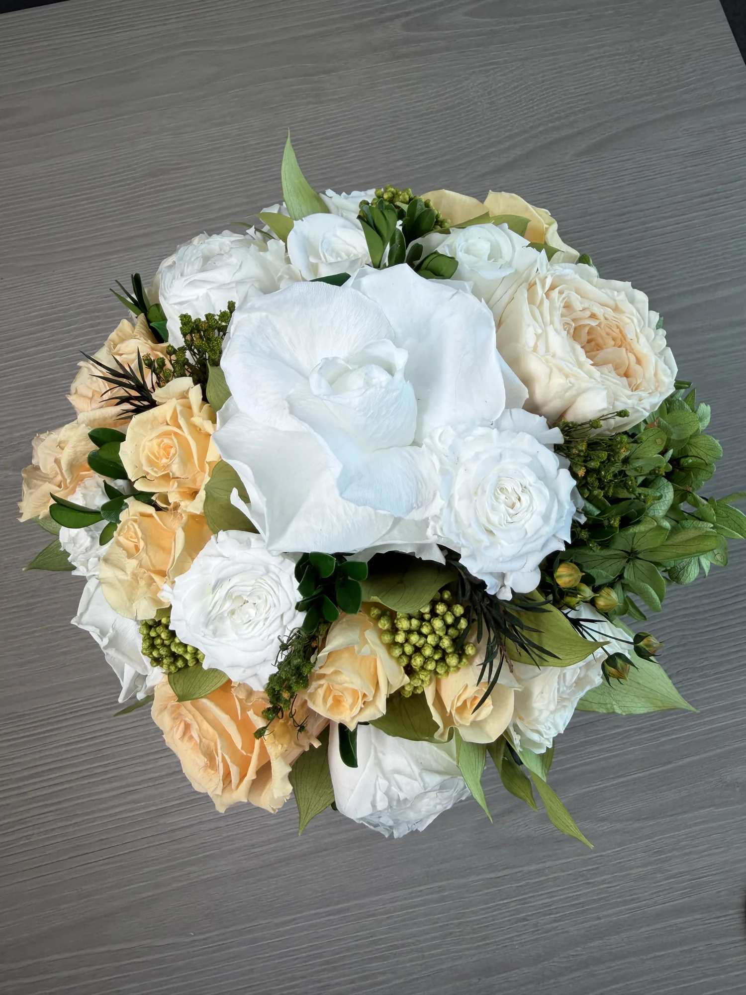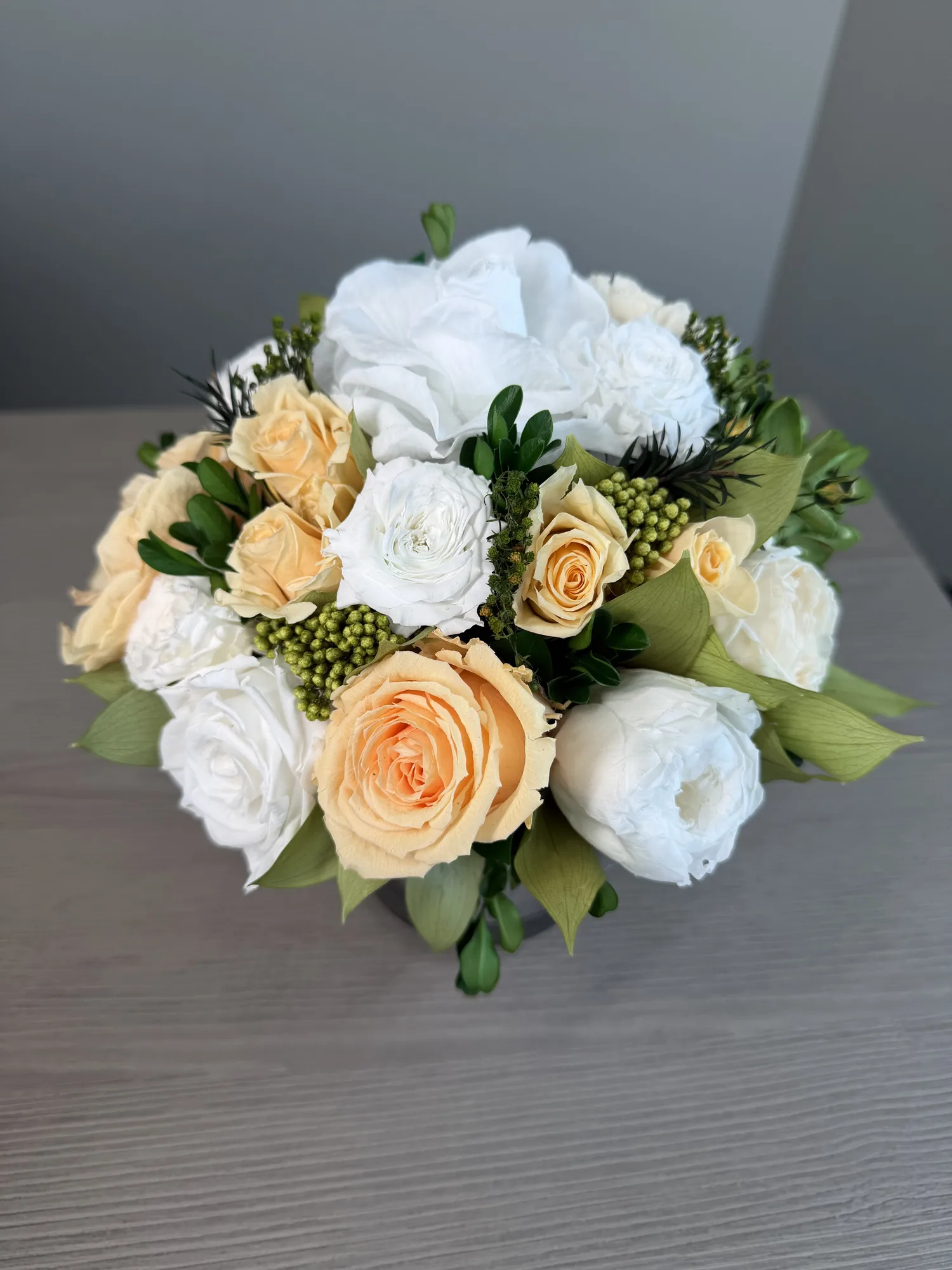 This piece is crafted exclusively from 100% natural flowers that have been bio-preserved to last up to one year without the need for water or maintenance. Please note that each arrangement is uniquely designed by our in-house florists, so natural variations in color, shape, and composition are to be expected.