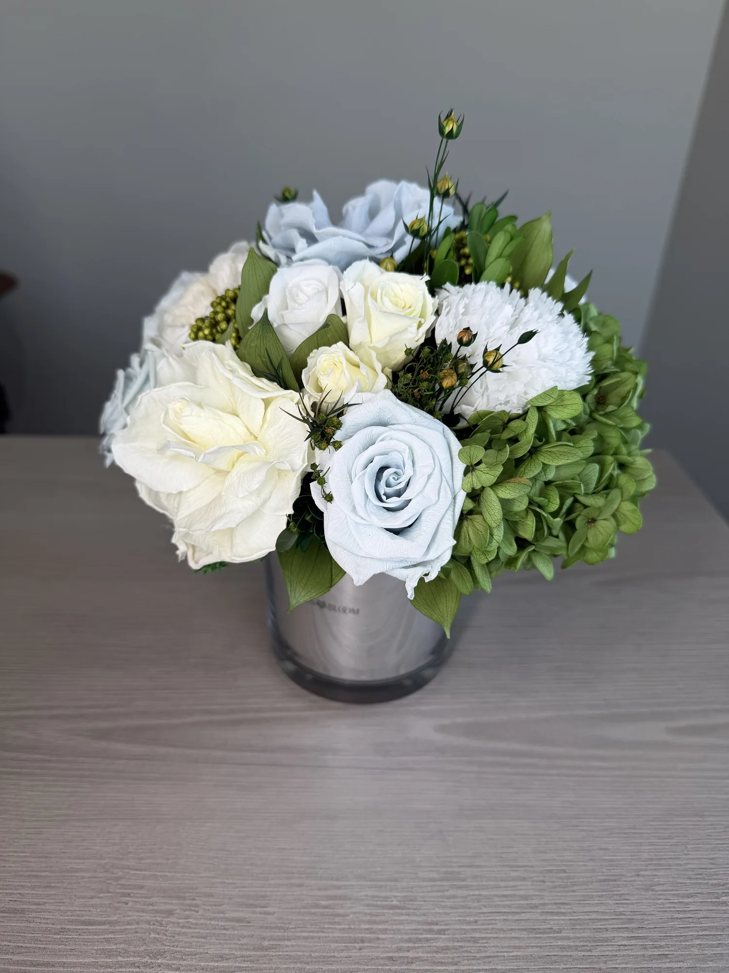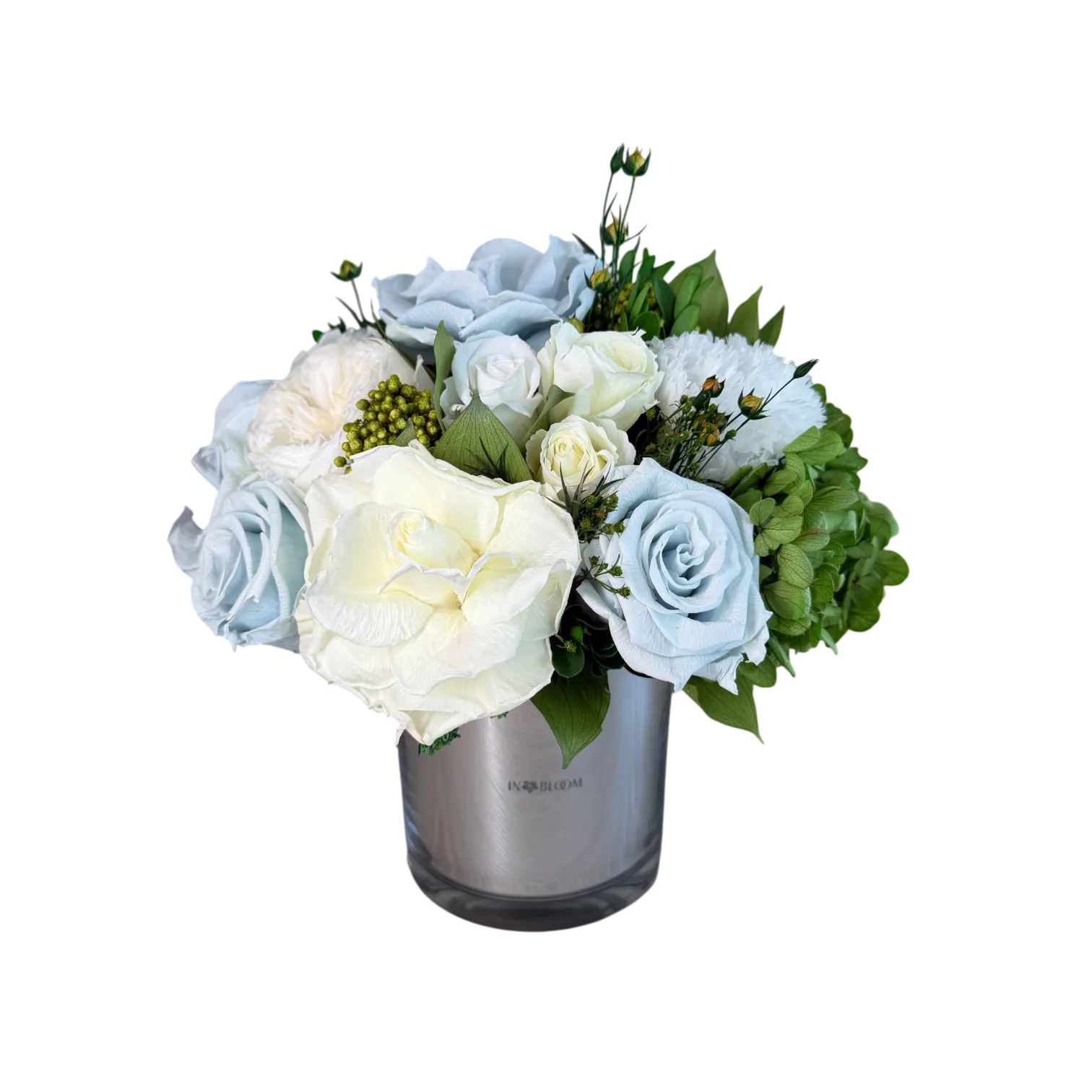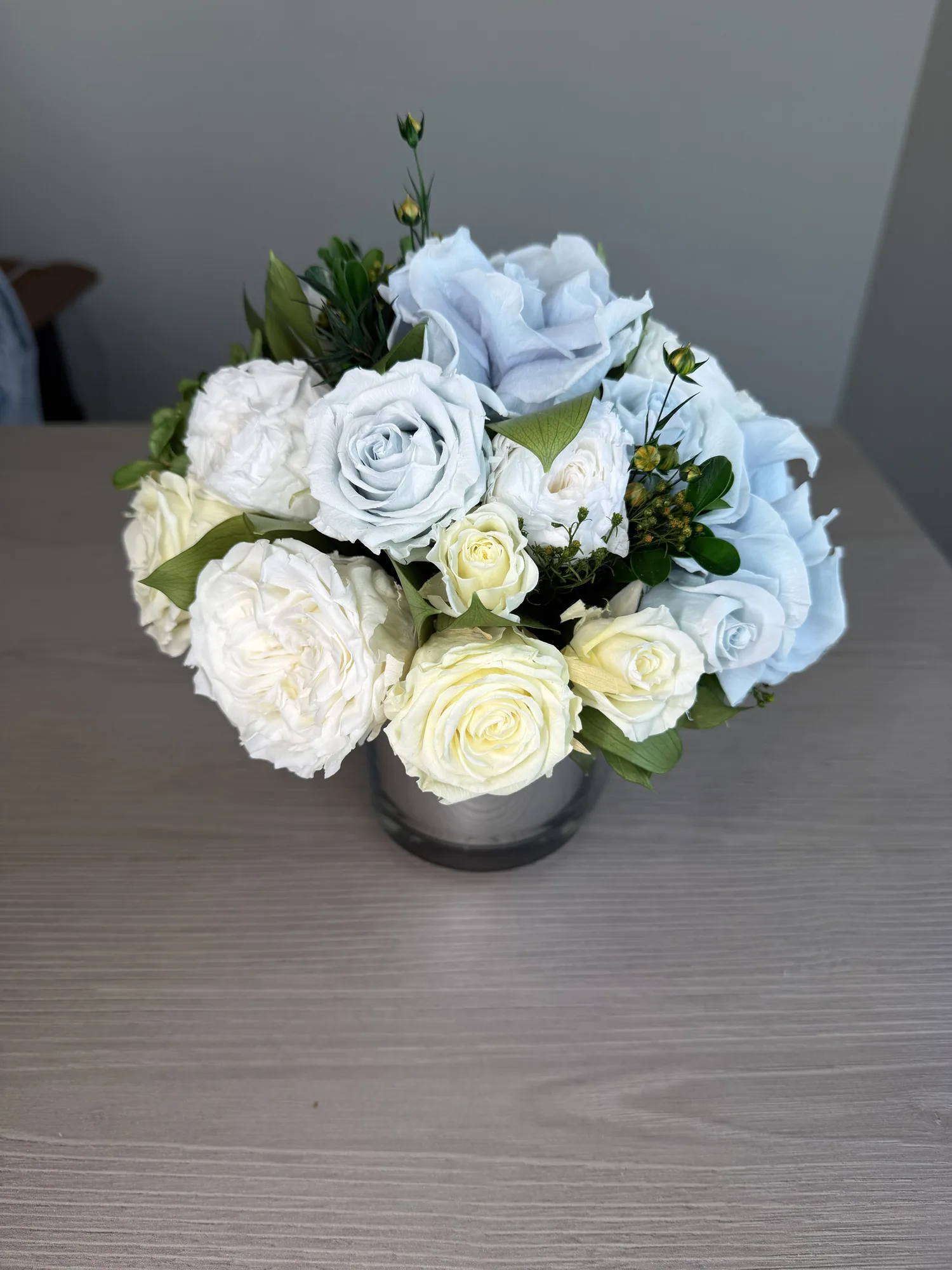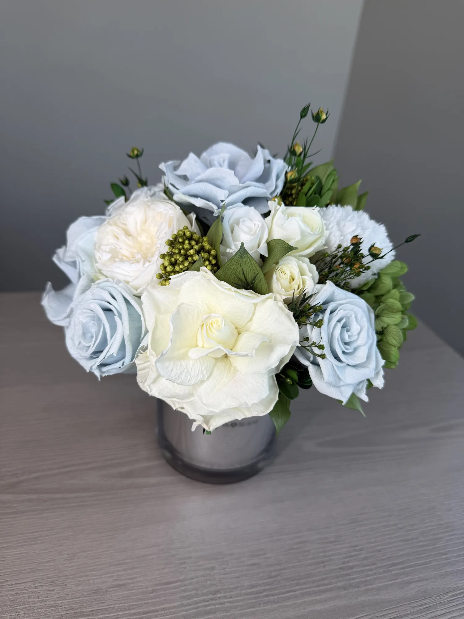 Juliette is small mirror glass vase arrangement embodies understated luxury and timeless sophistication. Soft creamy and baby blue roses unfold in perfect balance with sculptural white petals and refined accents of greenery, curated to evoke calm elegance and modern romance.