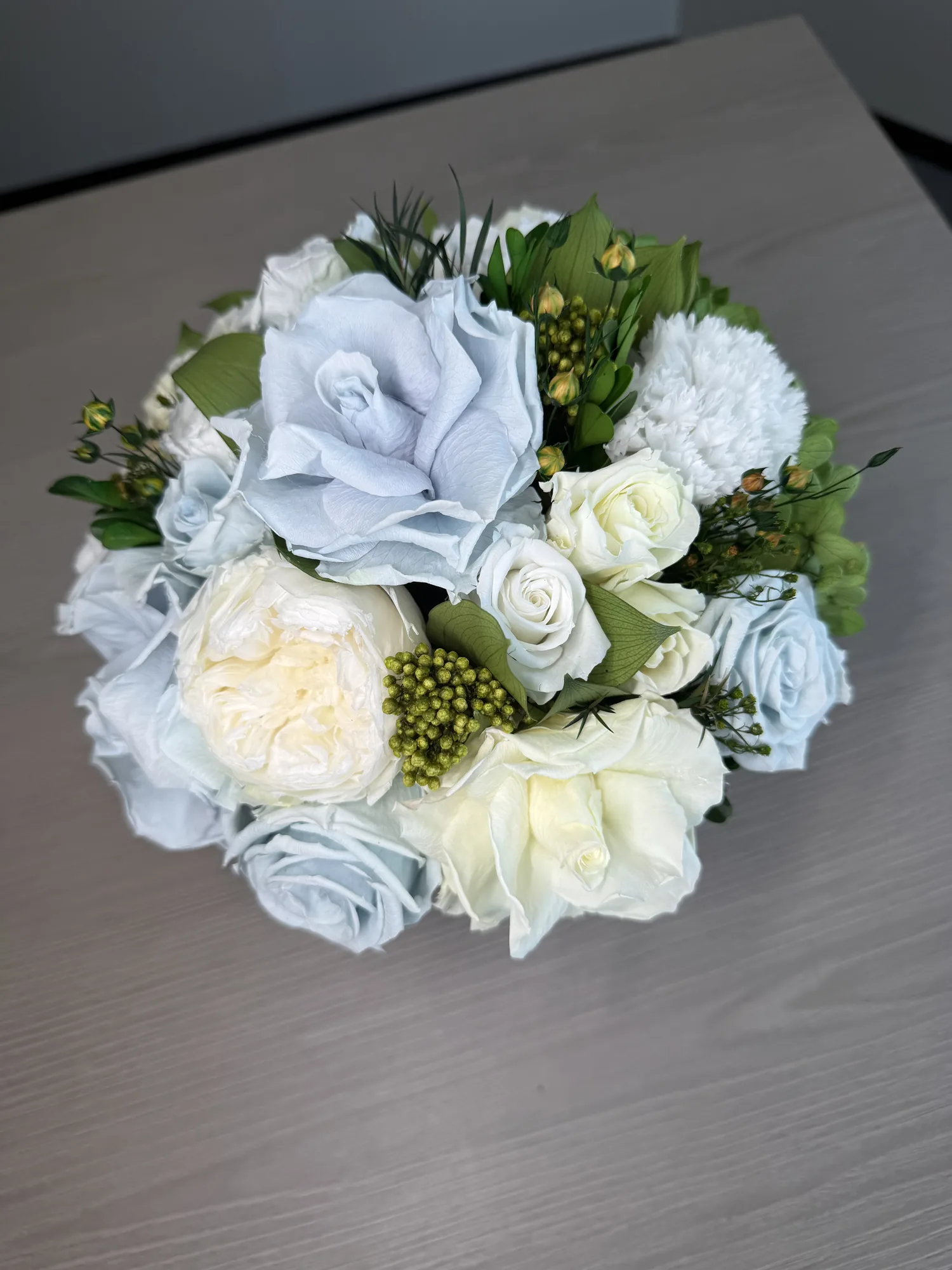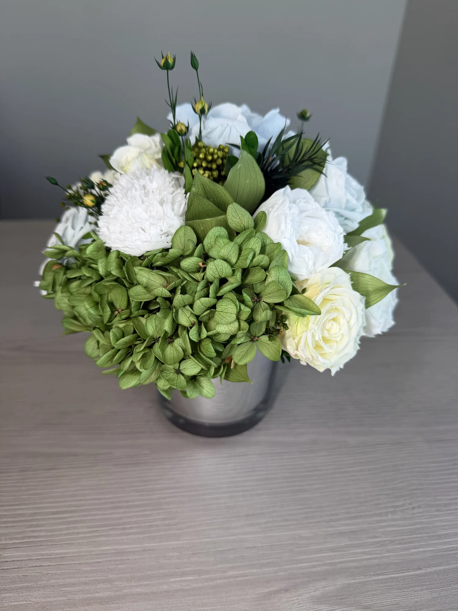 This piece is crafted exclusively from 100% natural flowers that have been bio-preserved to last up to one year without the need for water or maintenance. Please note that each arrangement is uniquely designed by our in-house florists, so natural variations in color, shape, and composition are to be expected.