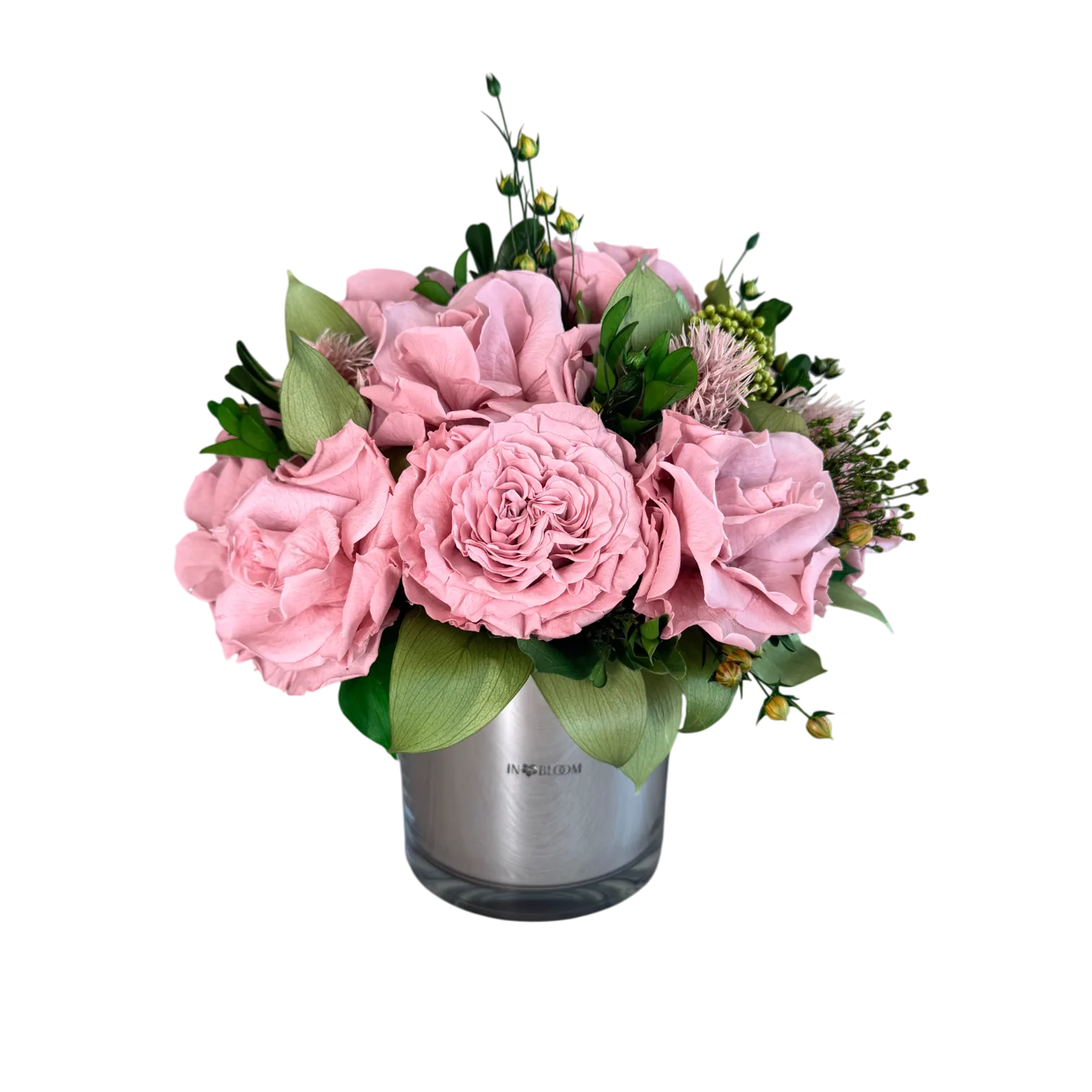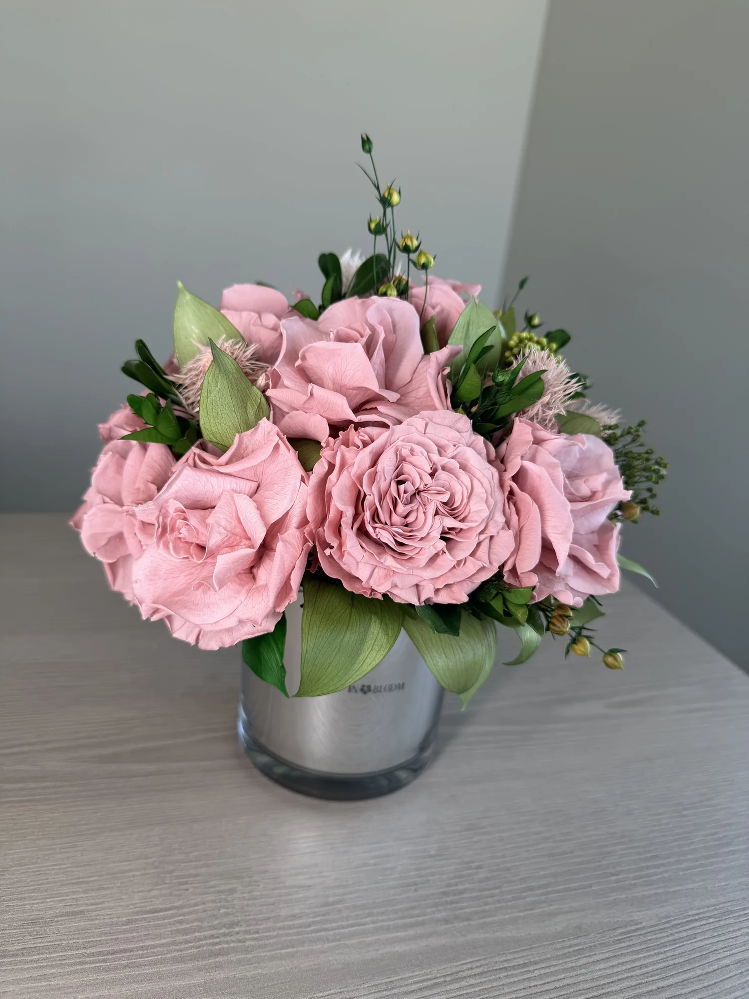 Juliette is small arrangement showcases gorgeous dusty-pink roses in full, sculptural bloom. Layered petals unfold with couture-like precision, framed by refined greenery and delicate textural accents that add depth and quiet intrigue.
