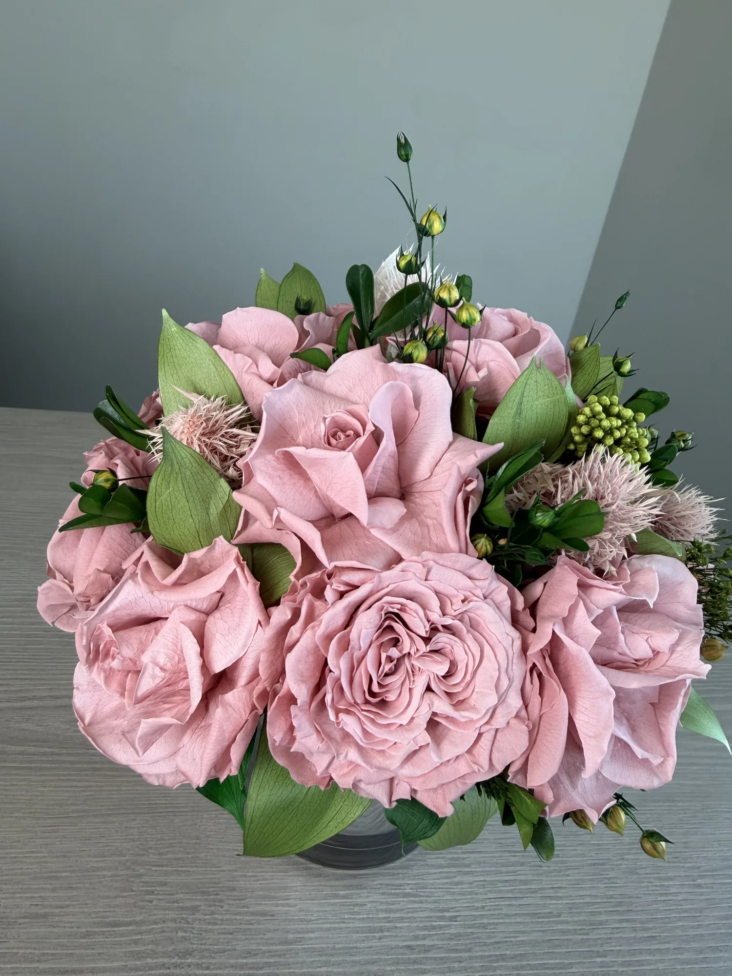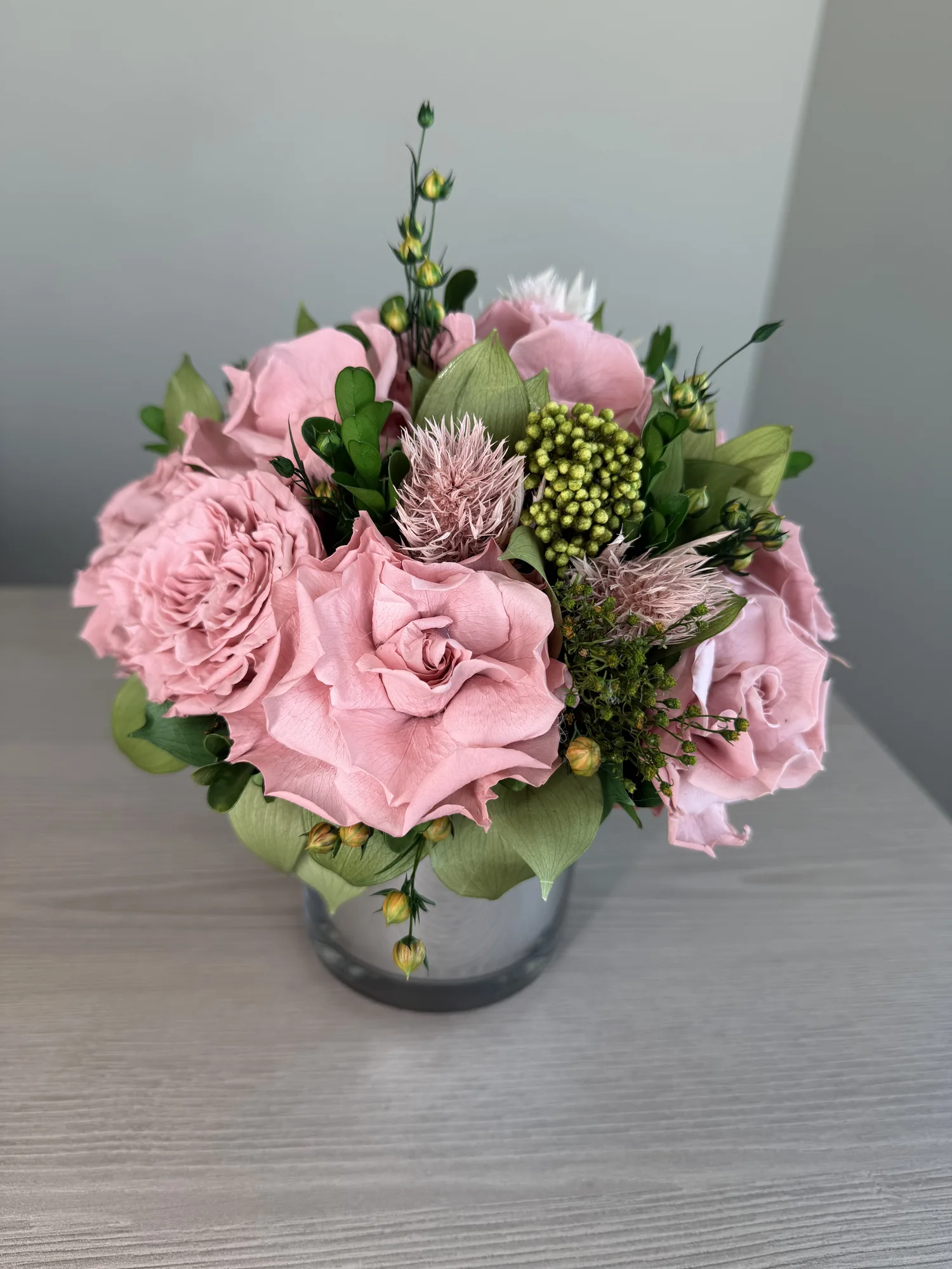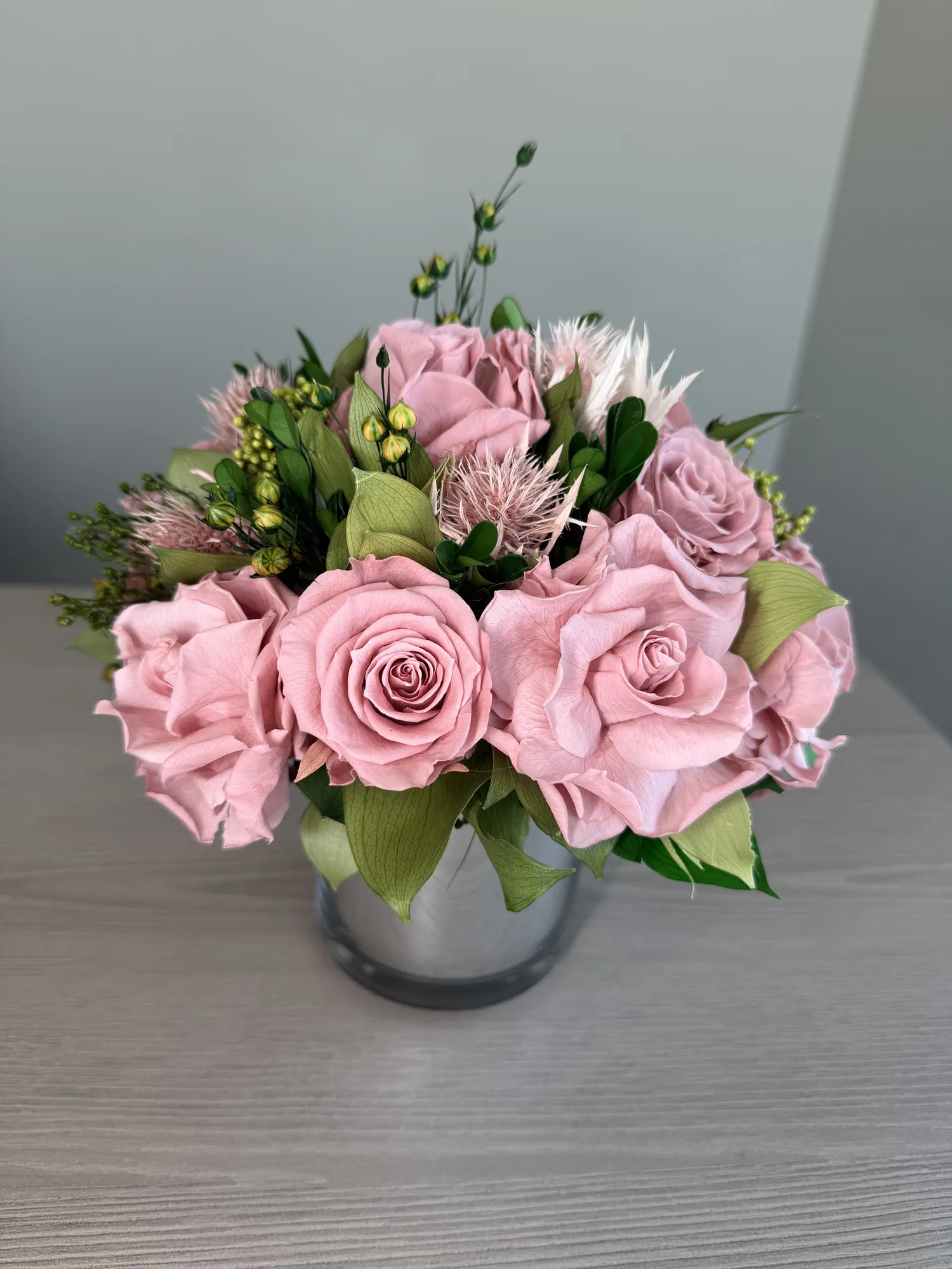 Juliette – Dusty Pink is a long-lasting preserved vase arrangement for Dubai interiors, offices, hotels, restaurants, yachts and private spaces, designed to stay elegant for over a year without water or daily care.