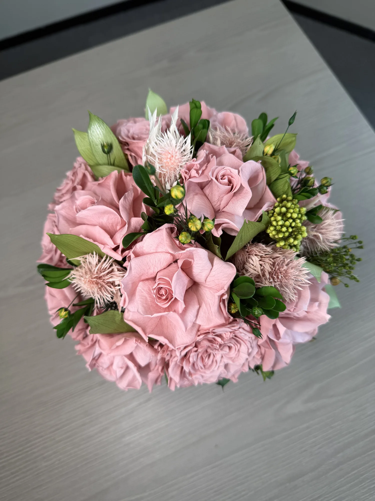 This piece is crafted exclusively from 100% natural flowers that have been bio-preserved to last up to one year without the need for water or maintenance. Please note that each arrangement is uniquely designed by our in-house florists, so natural variations in color, shape, and composition are to be expected.