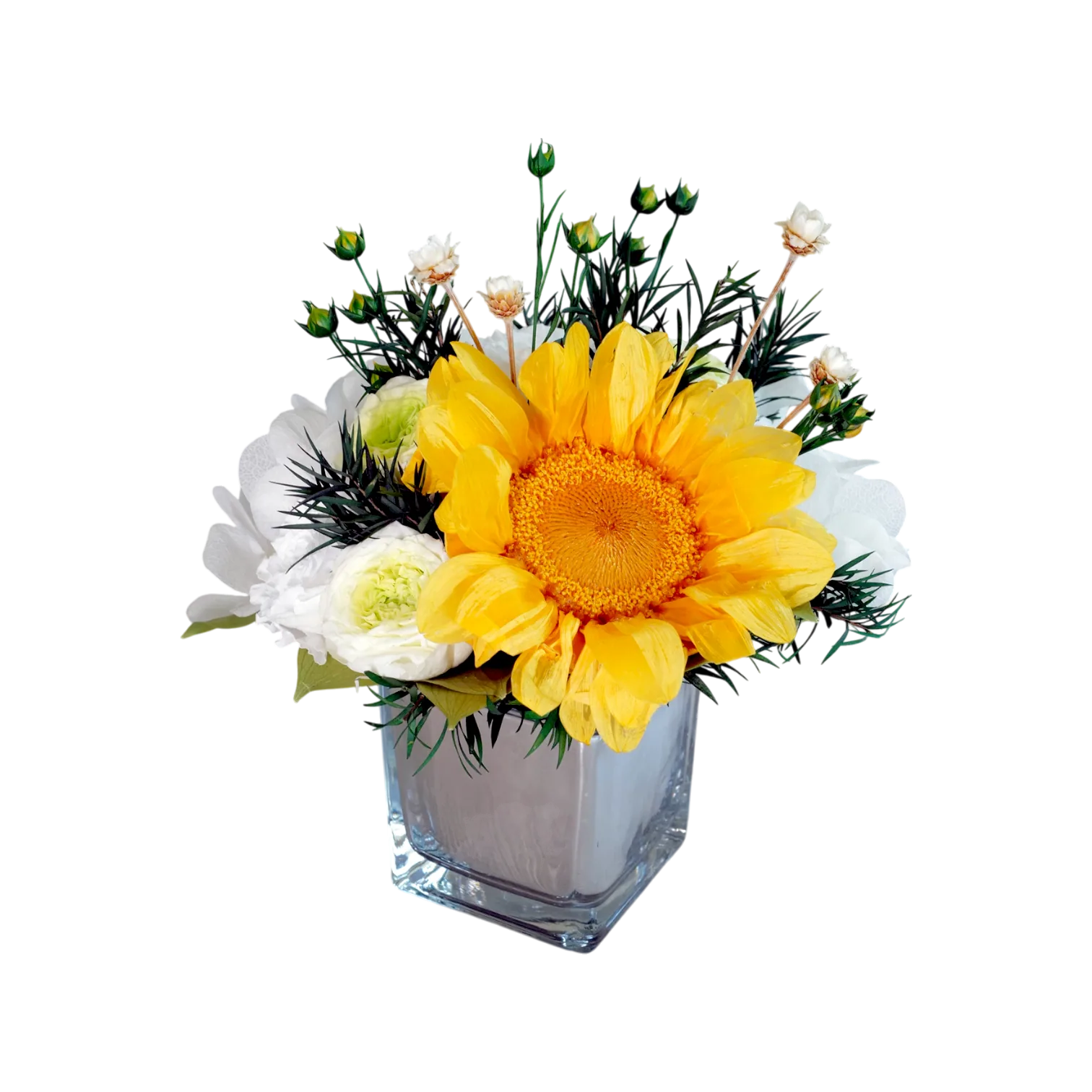 Kate is smallest mirror vase arrangement featuring delicate white and fresh green Austin roses & a gorgeous sunflower in a square mirror glass vase bursting with its shape and delicate color roses, hydrangeas and greens.