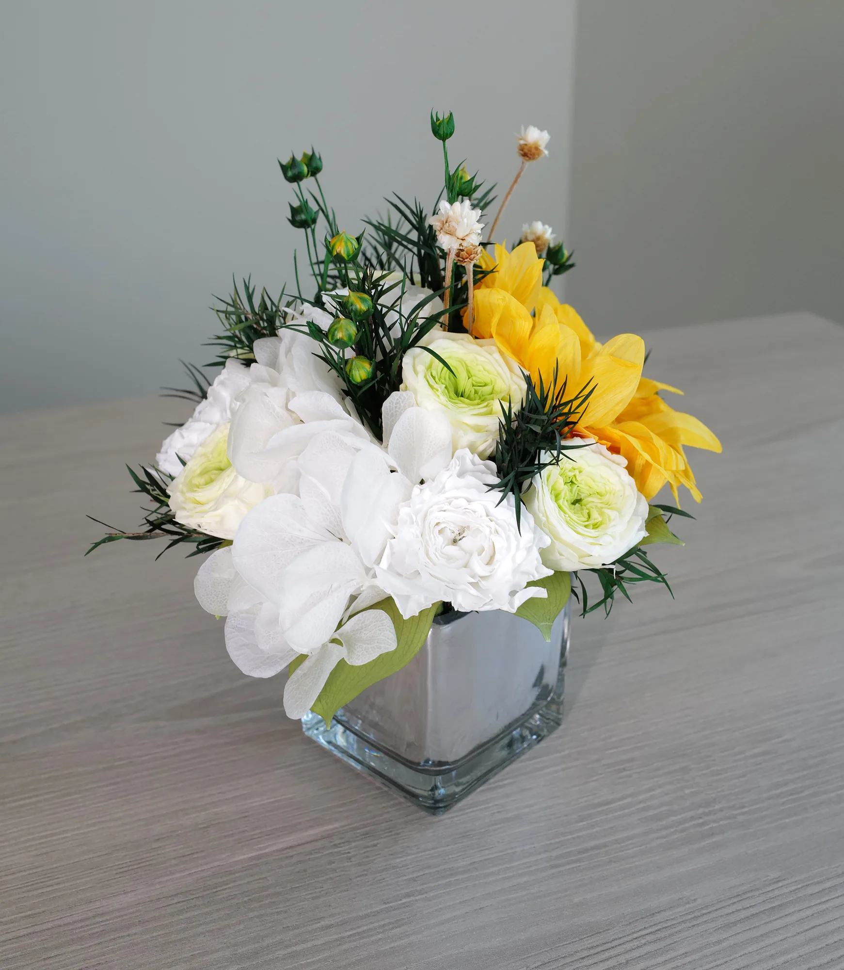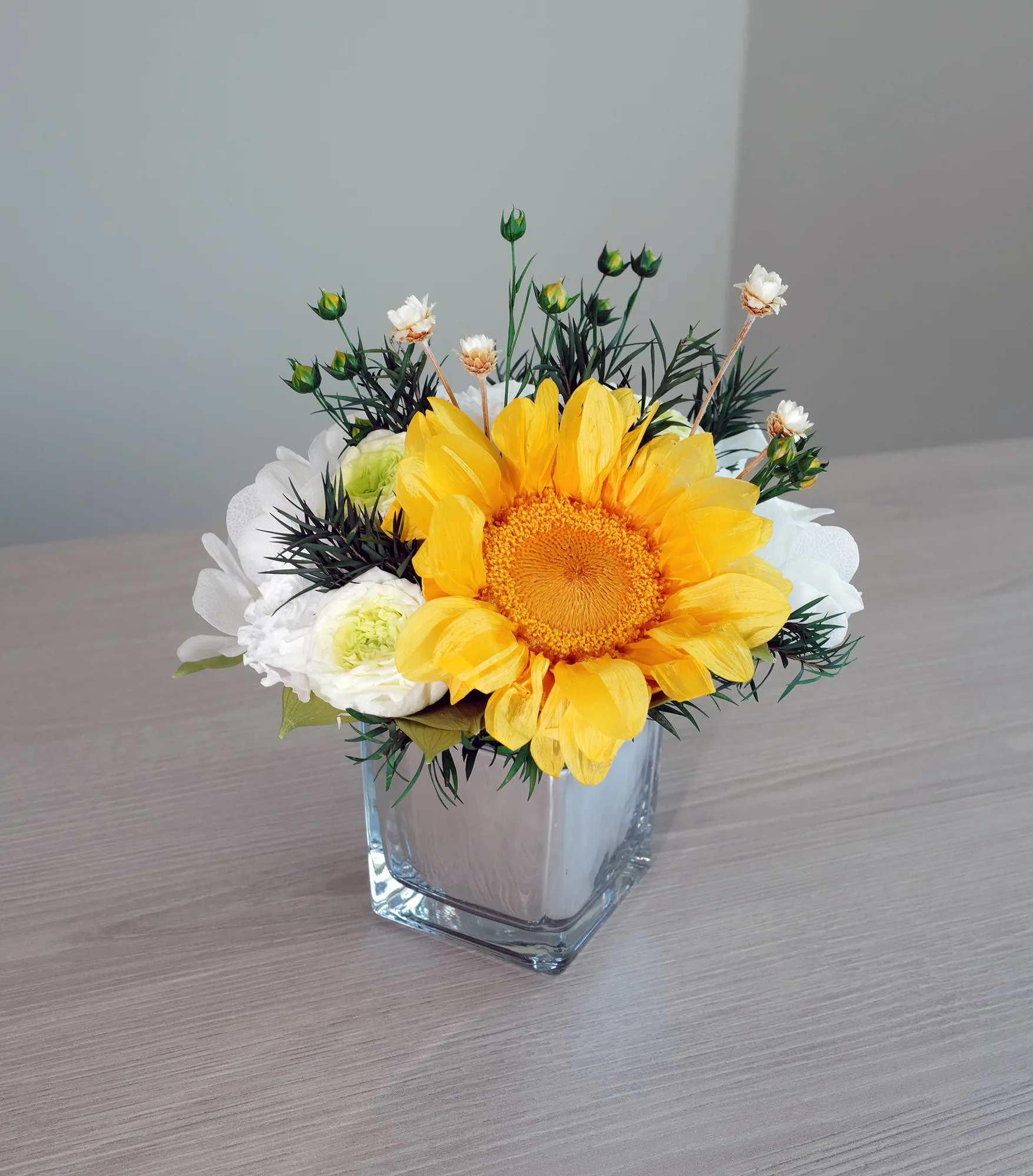 Katie – Sunflower is a small preserved mirror-vase arrangement for cheerful accents in compact spaces. It works well on desks, counters, bedside tables, restaurant tables and reception surfaces where a fresh-looking floral detail is needed without daily upkeep. The preserved roses, hydrangeas, greens and sunflower keep their decorative quality for more than a year in Dubai without water or trimming.