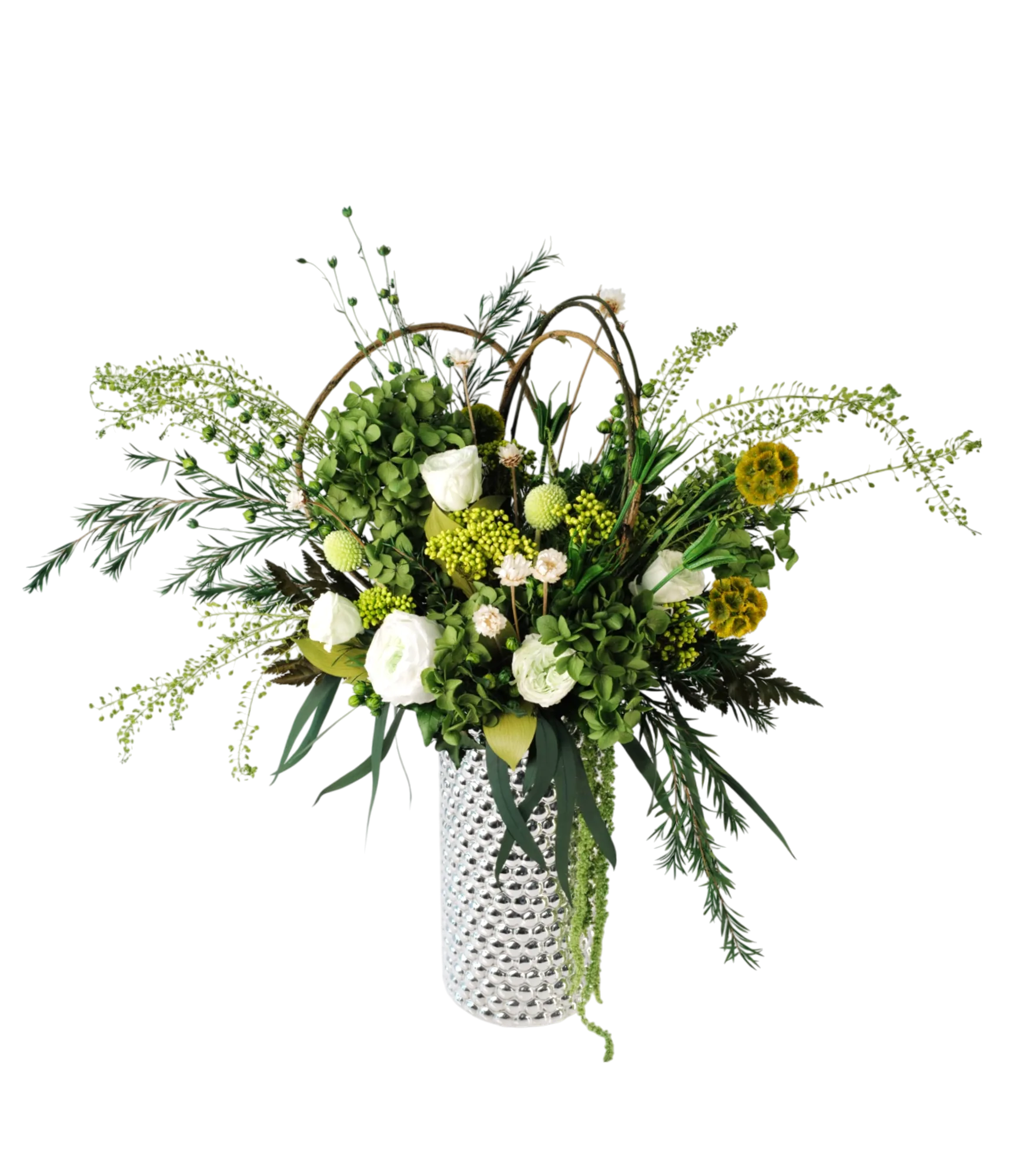 Lexie stunning bio-preserved arrangement, elegantly arranged in porcelain silver vase. This exquisite piece features a harmonious mix of green and white eternal garden roses, hydrangeas and a variety of greens. Perfect for adding a touch of refined beauty and sophistication to any space.