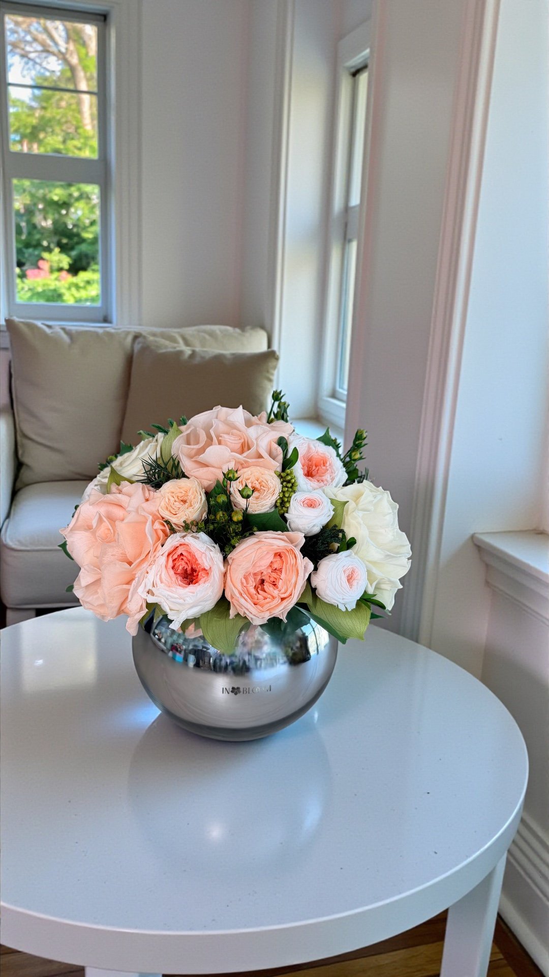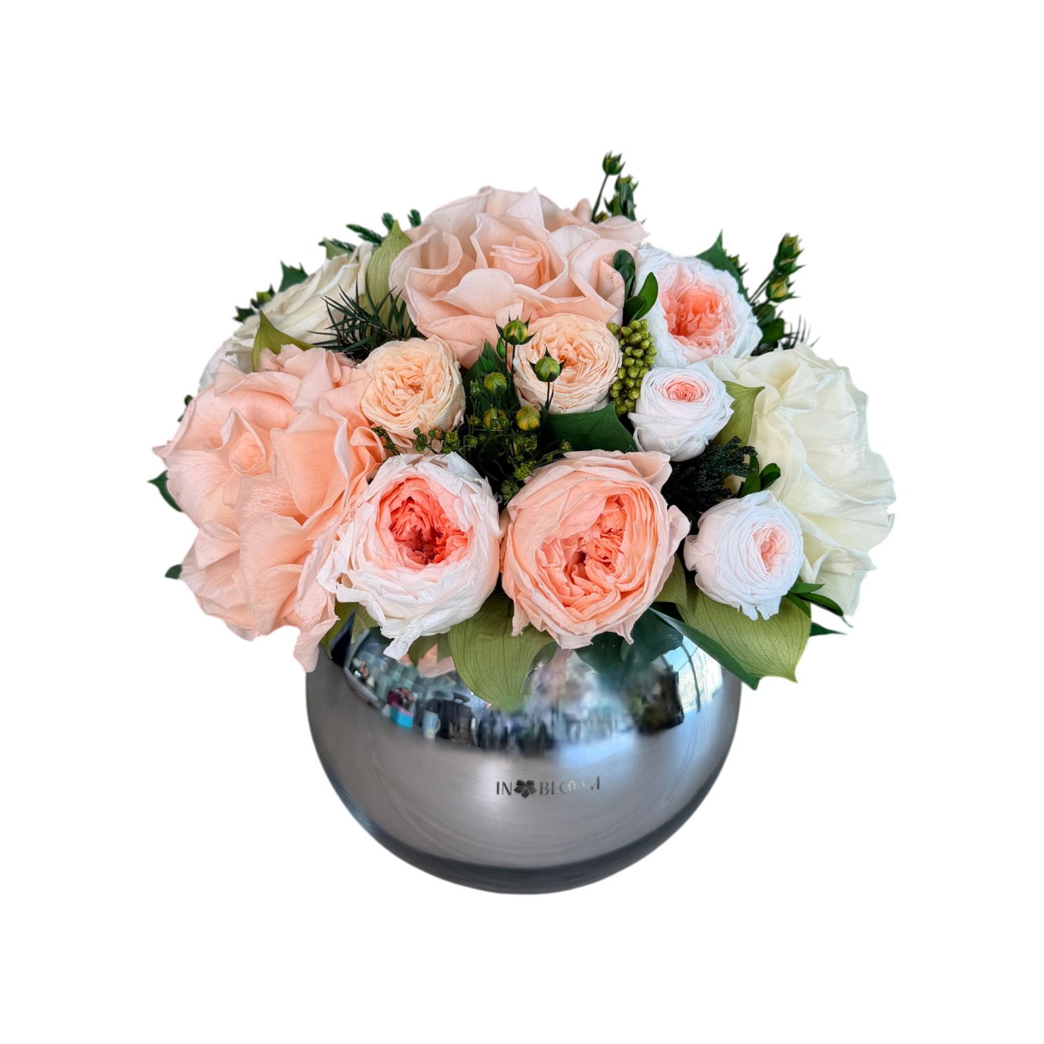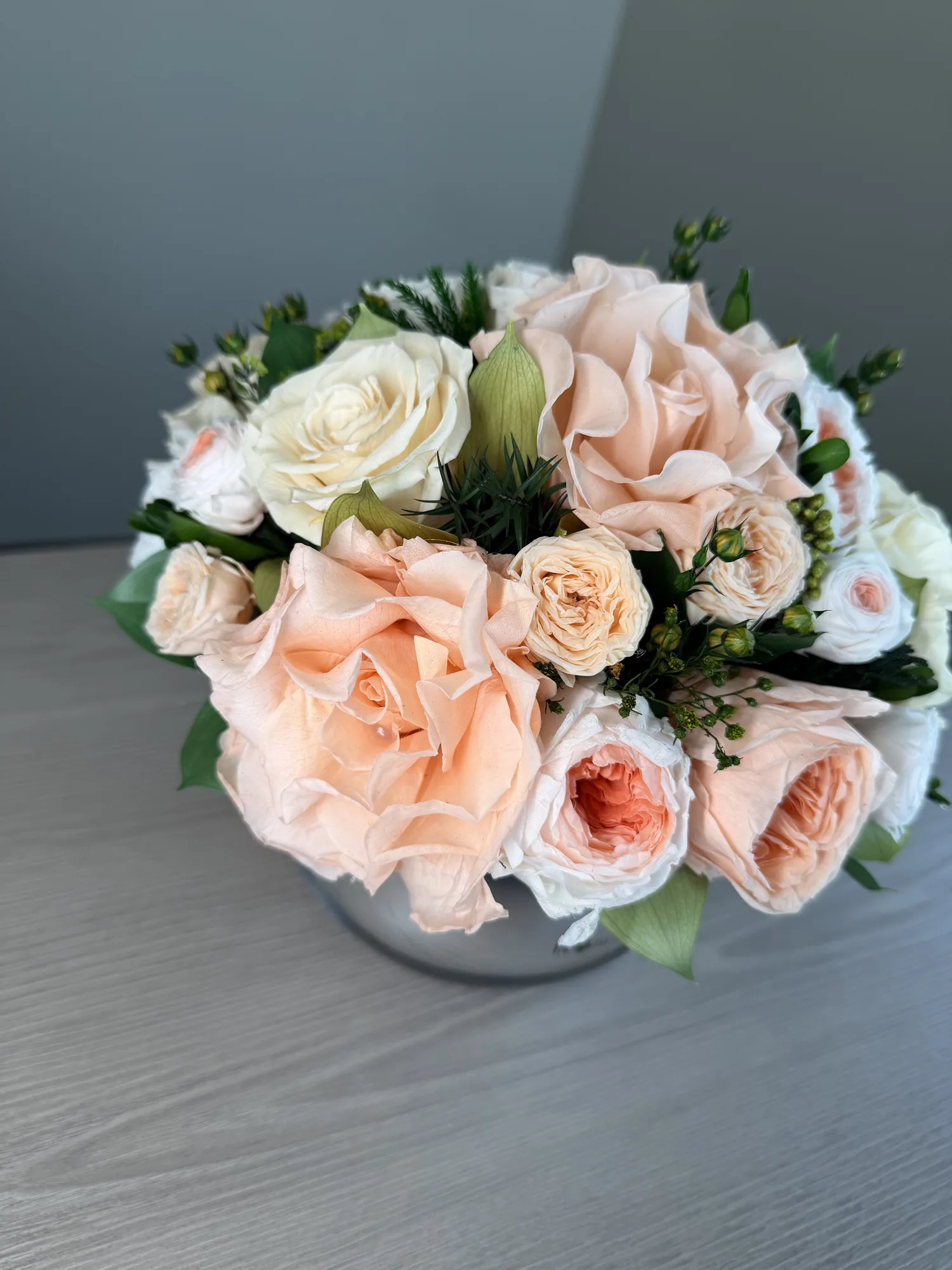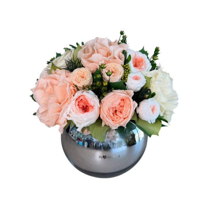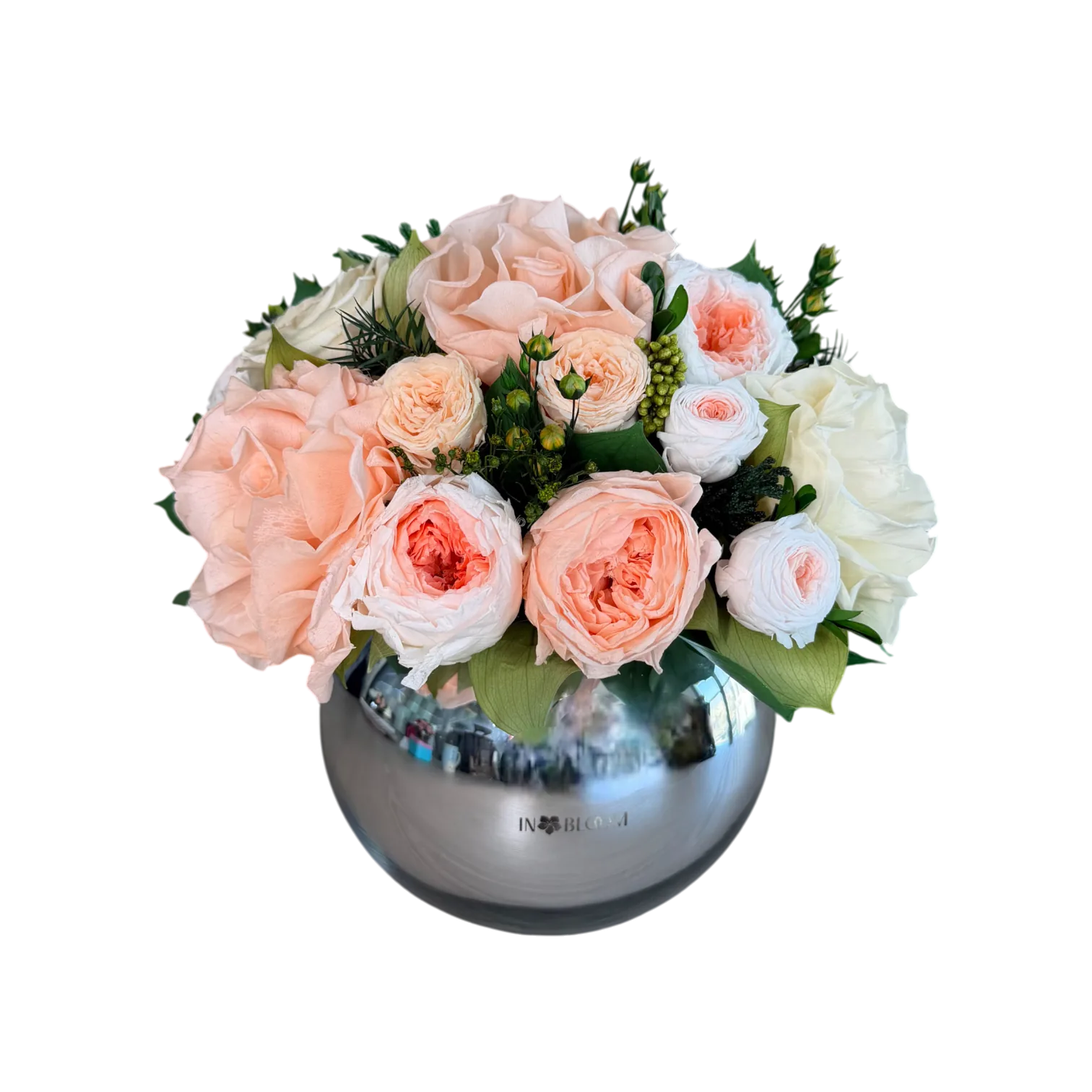 Featuring off white and peach classic, French and garden roses this bouquet is a celebration of sweet tenderness. Arranged in mirrored sphere vase, Loulou Pink & White is perfect for expressing affection and warmth.