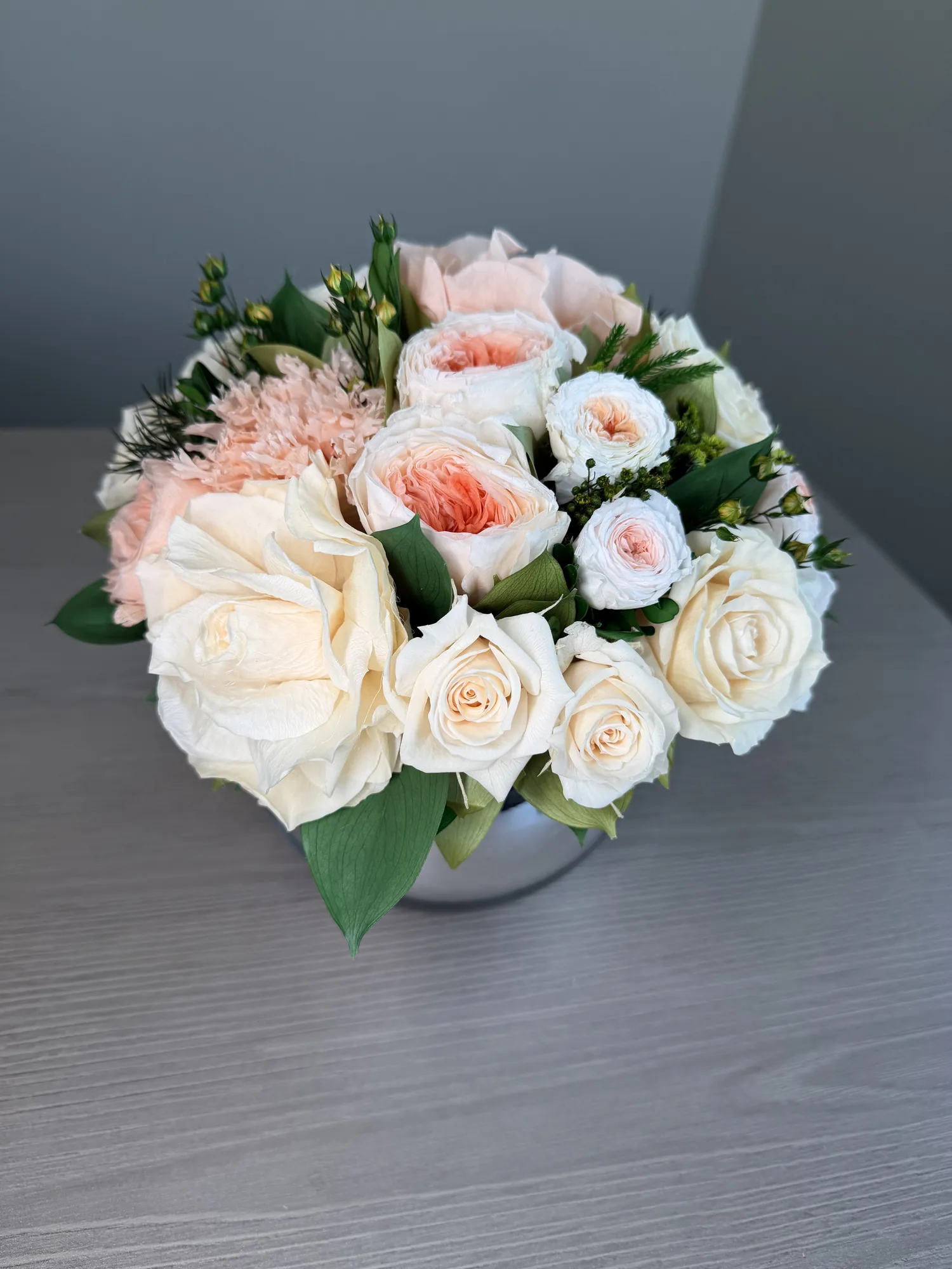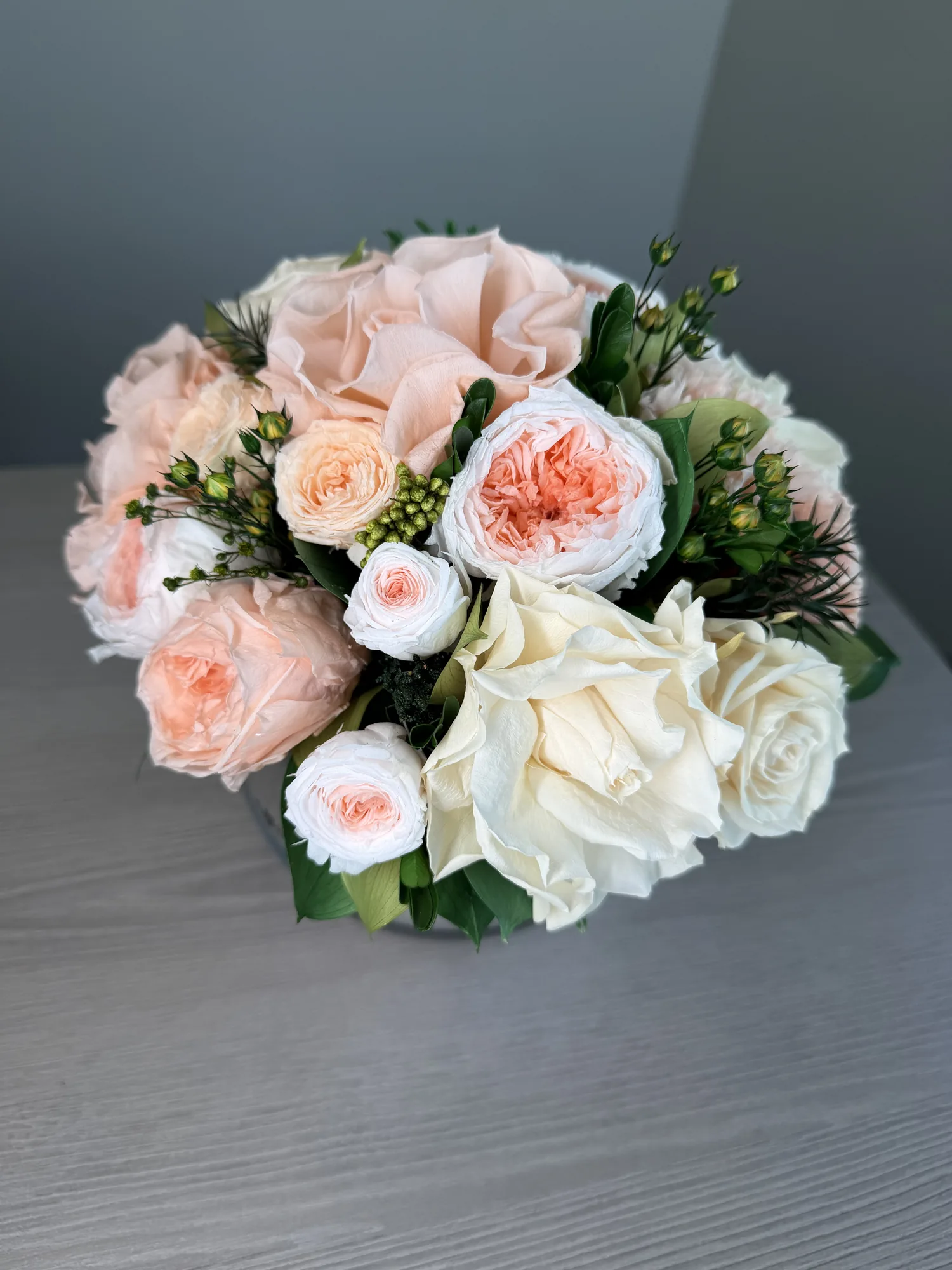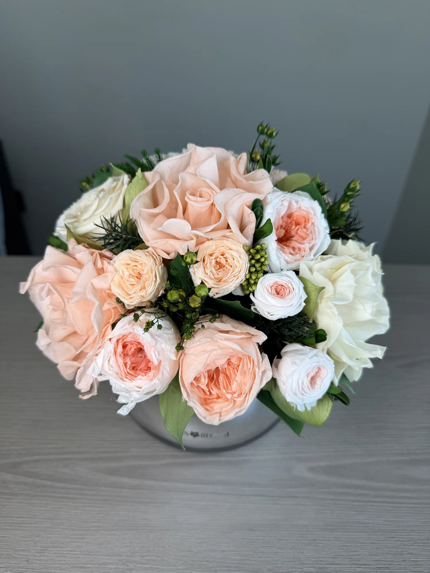 This piece is crafted exclusively from 100% natural flowers that have been bio-preserved to last up to one year without the need for water or maintenance. Please note that each arrangement is uniquely designed by our in-house florists, so natural variations in color, shape, and composition are to be expected.