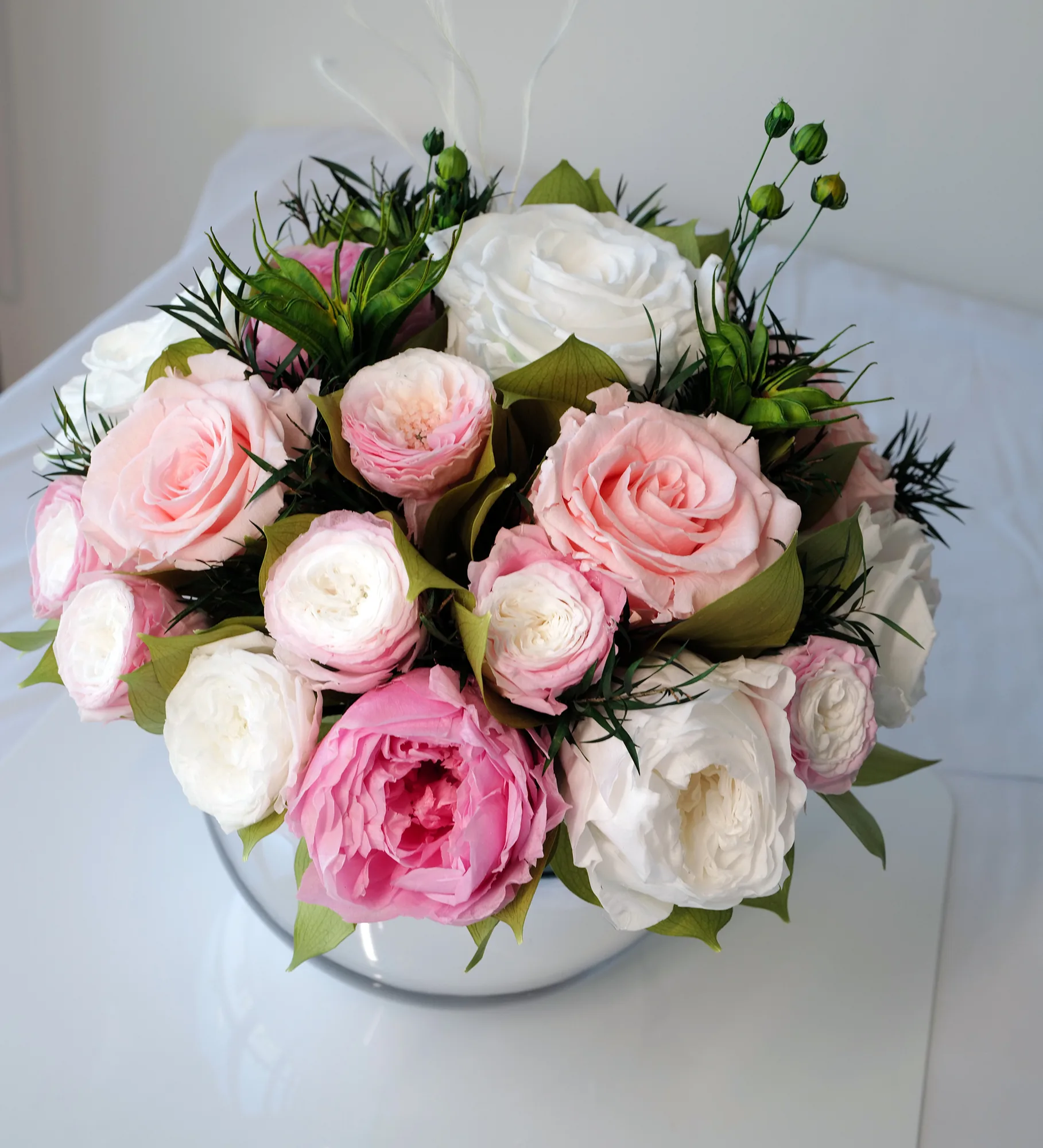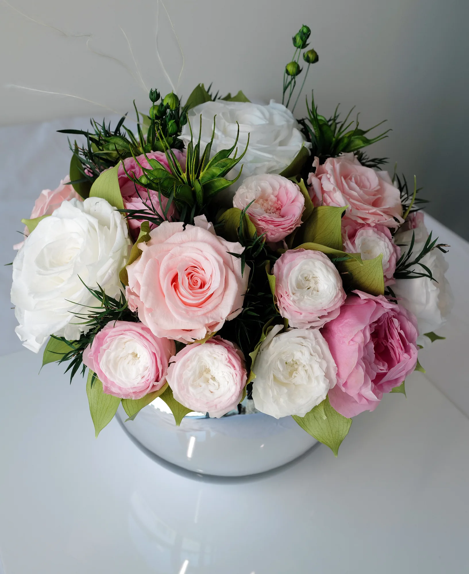 Loulou (M) Pink&White is a long-lasting preserved vase arrangement for Dubai interiors, offices, hotels, restaurants, yachts and private spaces, designed to stay elegant for over a year without water or daily care.