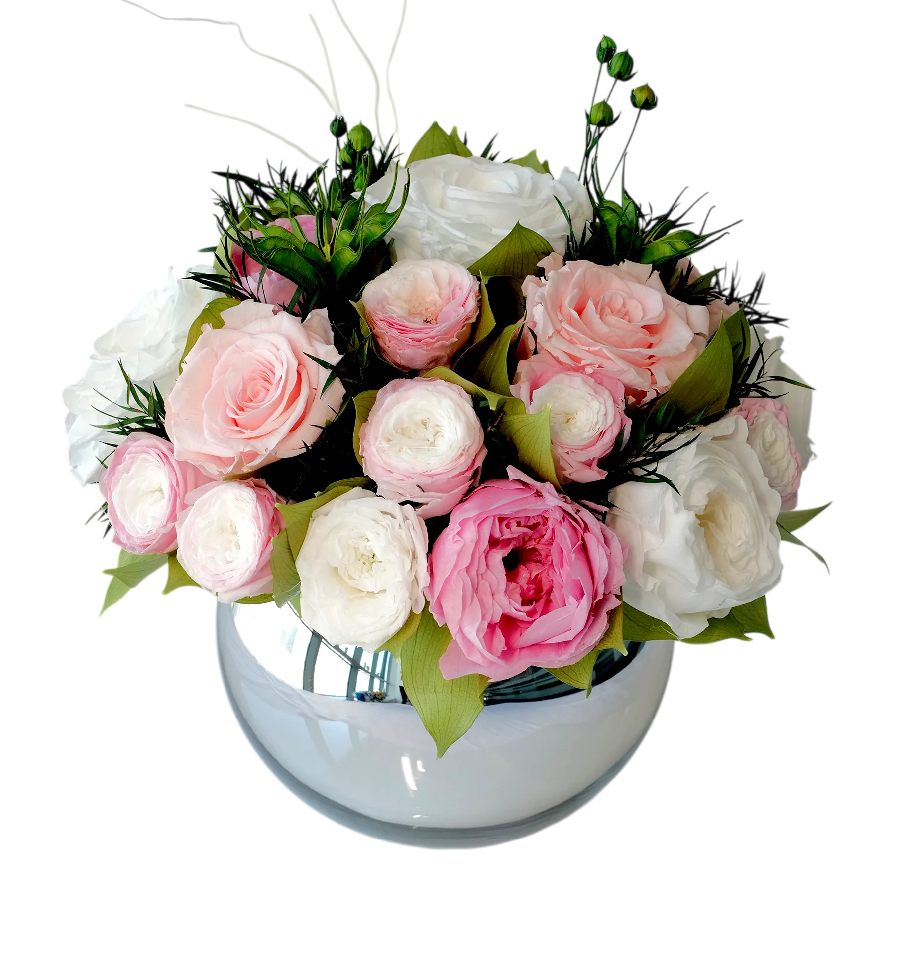 Featuring off white and pink classic and garden rose this bouquet is a celebration of sweet tenderness. Arranged in mirrored sphere vase, Loulou Pink & White is perfect for expressing affection and warmth.