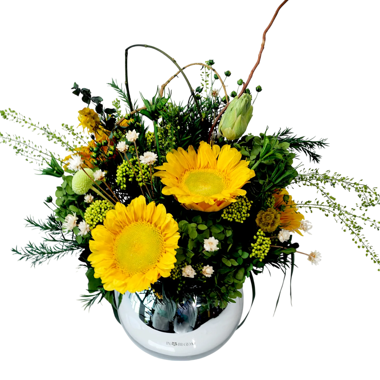 Loulou (M) Sunflowers is a preserved vase bouquet with a bright, joyful character for interiors and gifting. The sunflower tones, artichoke, dry flowers and greens add warmth to offices, restaurants, lounges, yacht spaces and home decor in Dubai. The arrangement is ready to display in its mirrored vase and keeps its decorative look for more than a year without water or daily care.