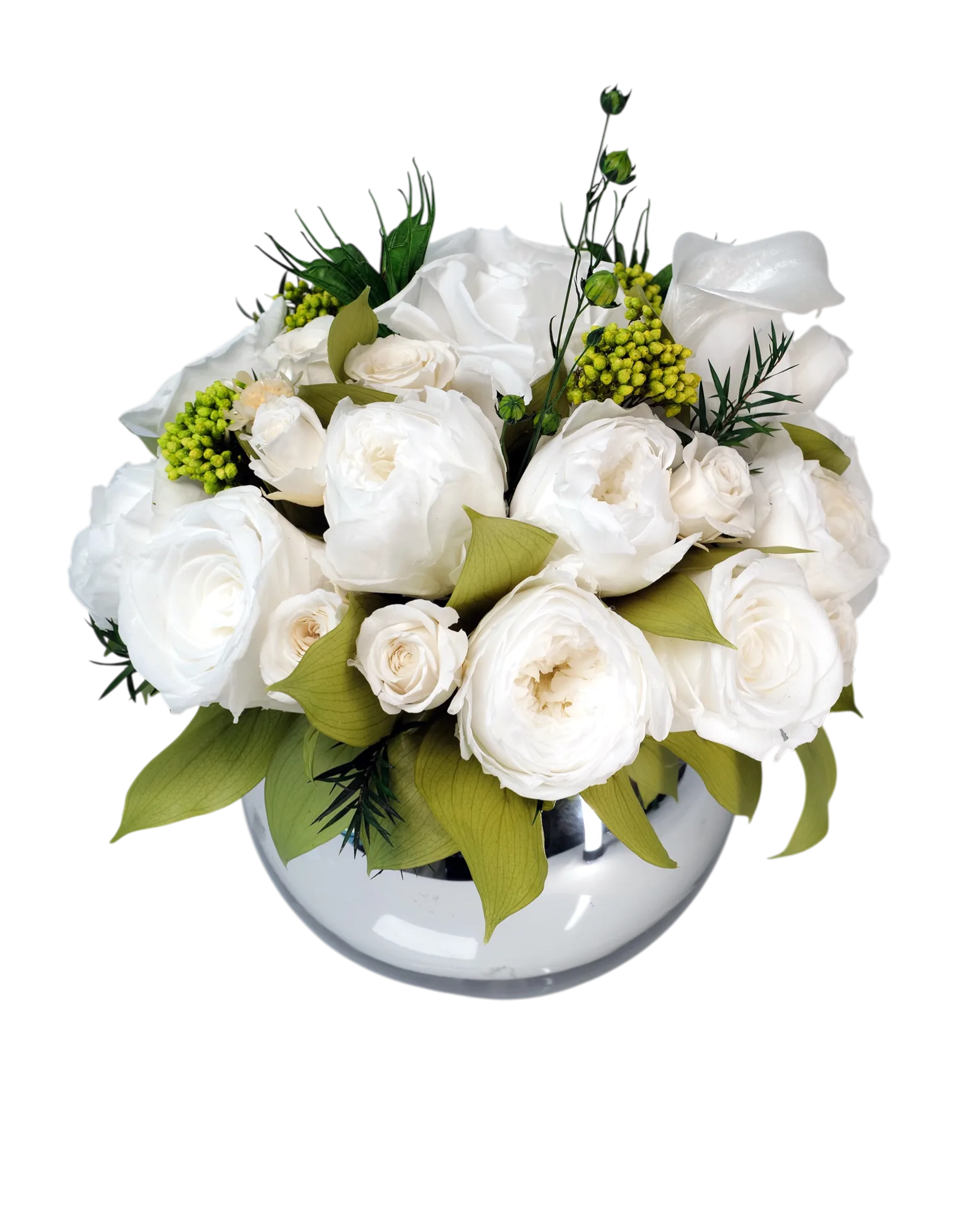 Loulou (M) Blanc is a medium preserved vase bouquet with a quiet white palette for refined interiors. The mirrored sphere vase gives it enough presence for reception desks, lounge tables, hotel suites, yacht cabins and private homes. Its preserved roses are selected for long-lasting beauty in Dubai, keeping a fresh floral impression for more than a year without water or daily care.