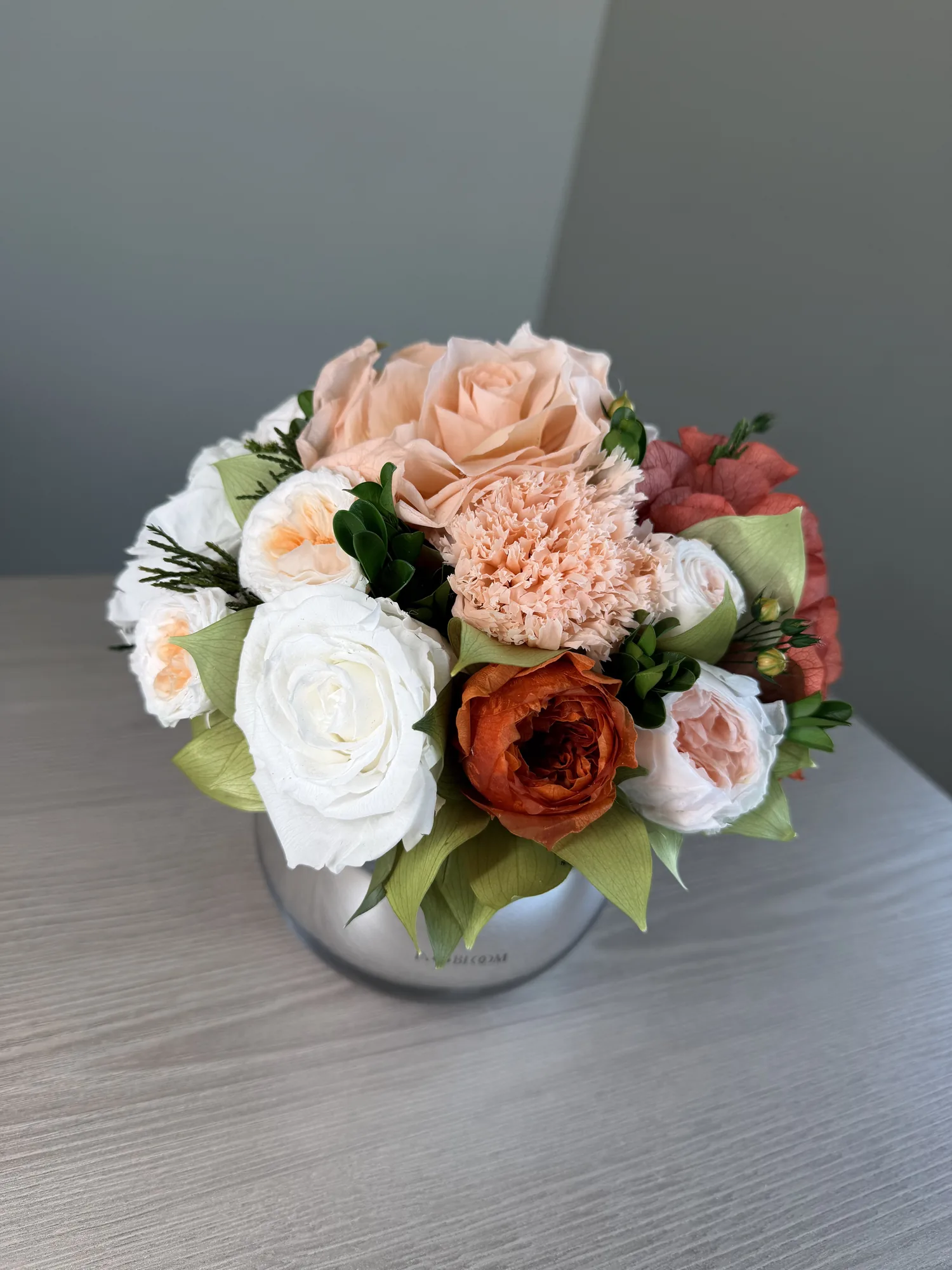 Loulou (S) – Peach Aurelia is a long-lasting preserved vase arrangement for Dubai interiors, offices, hotels, restaurants, yachts and private spaces, designed to stay elegant for over a year without water or daily care.