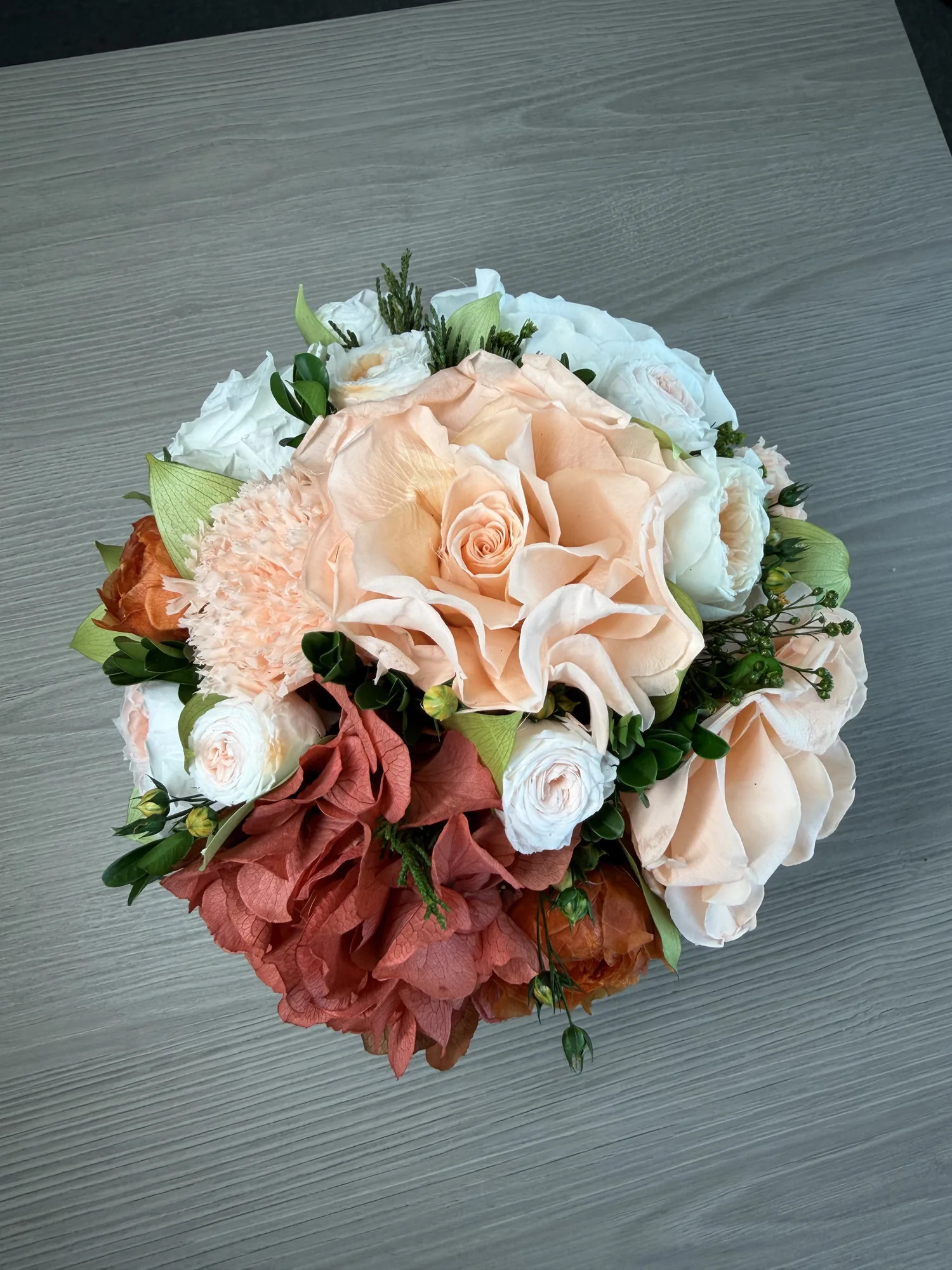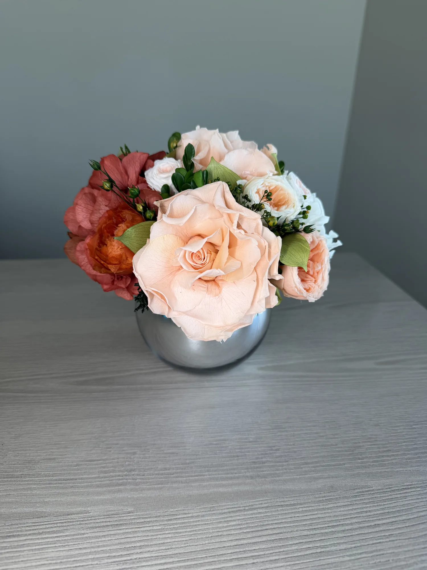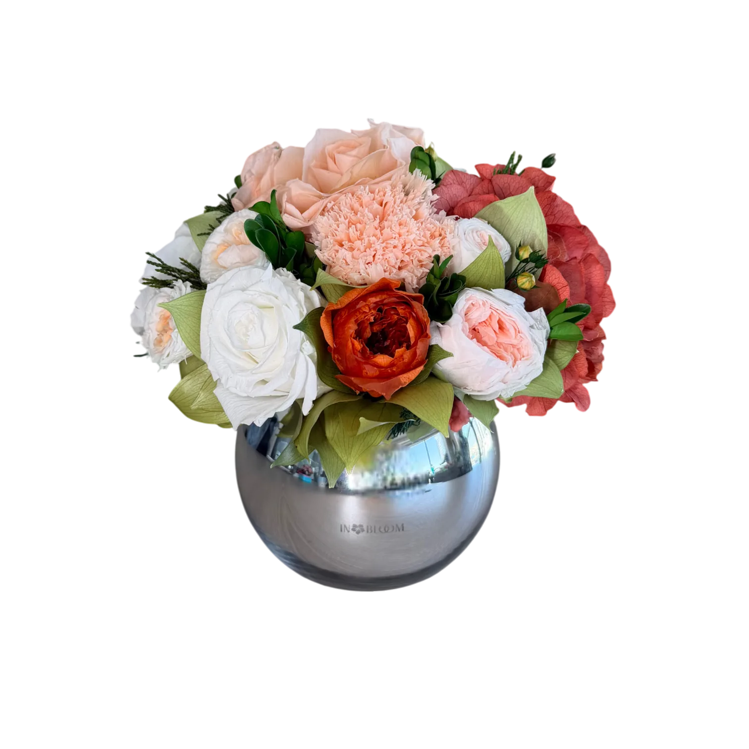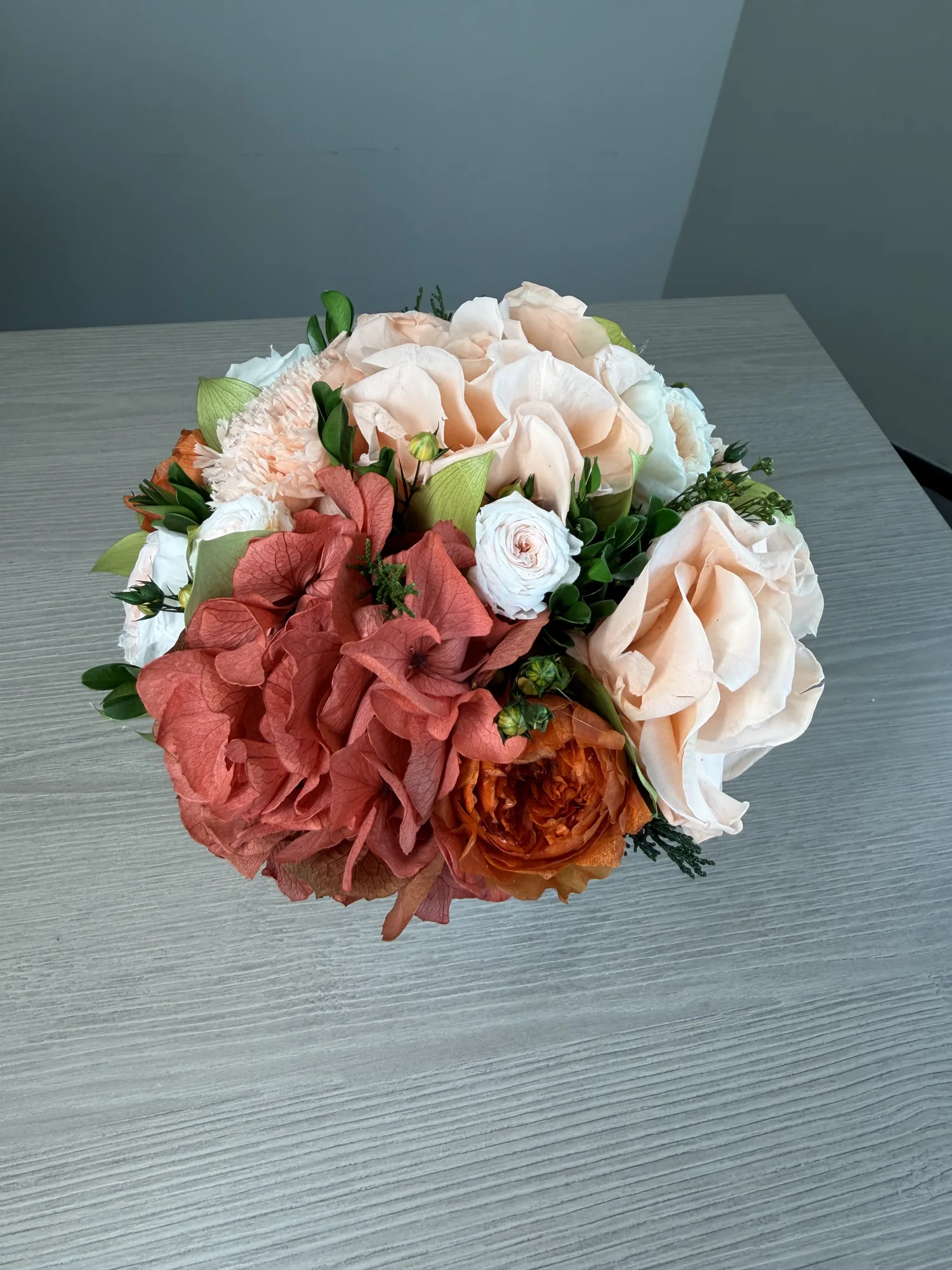 This piece is crafted exclusively from 100% natural flowers that have been bio-preserved to last up to one year without the need for water or maintenance. Please note that each arrangement is uniquely designed by our in-house florists, so natural variations in color, shape, and composition are to be expected.