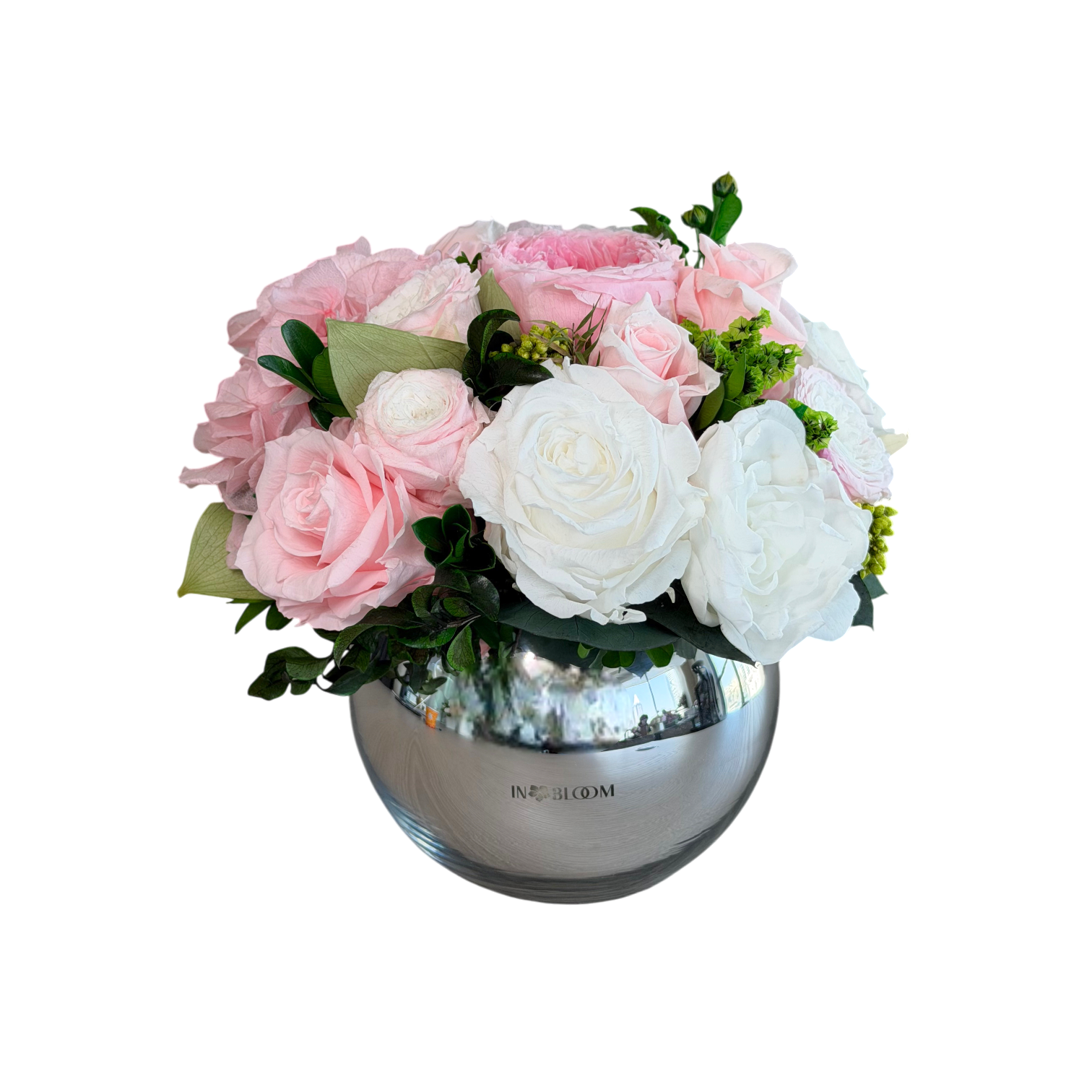 Featuring white and baby pink garden and classic roses, light pink hydrangeas this bouquet offers a rich and layered look. Arranged in mirrored sphere vase, Loulou (S) will add perfect touch of bright elegance to any area.