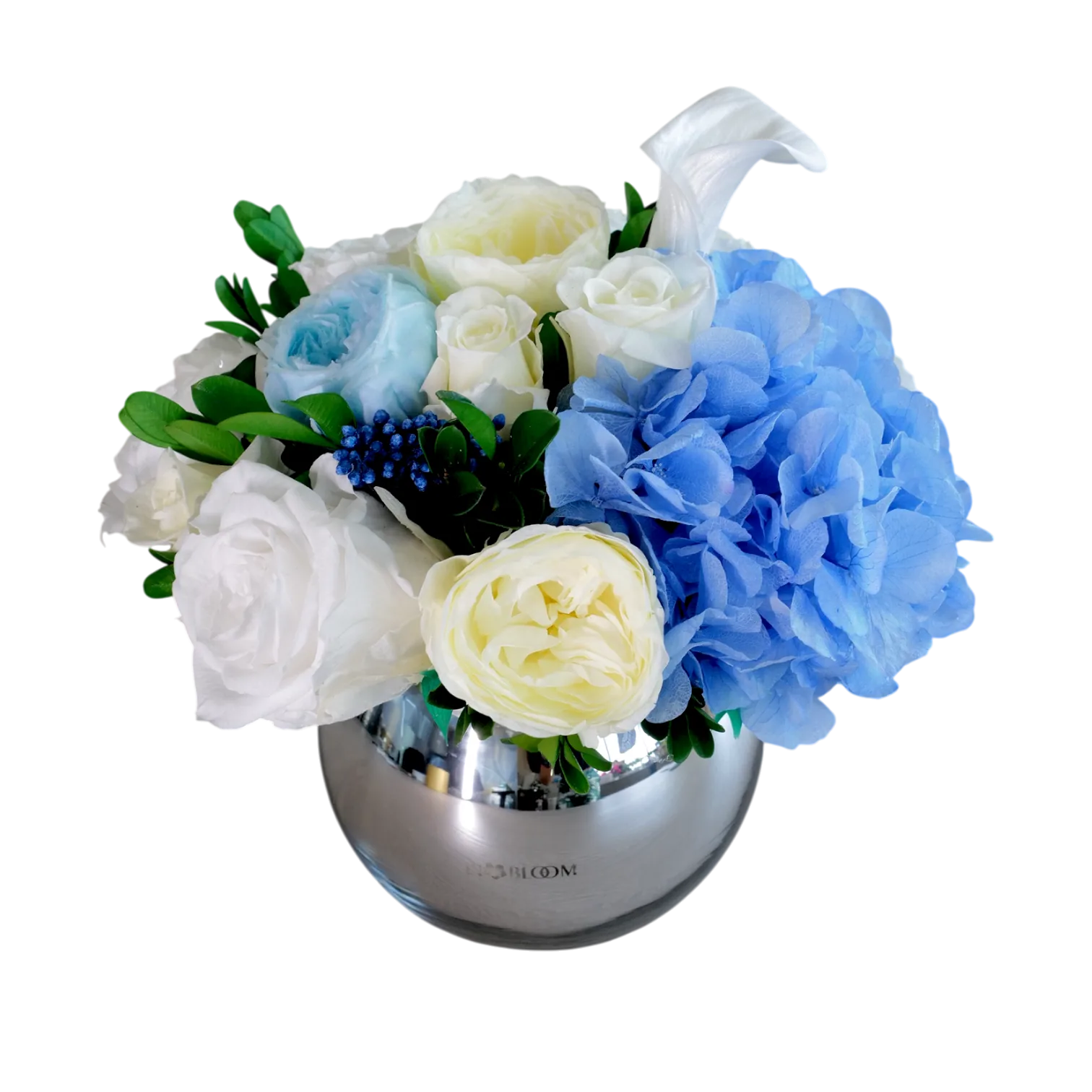 Featuring baby blue romantic roses and white classic roses, this bouquet offers a rich and layered look. Arranged in mirrored sphere vase, Loulou (S) will add perfect touch of bright elegance to any area.