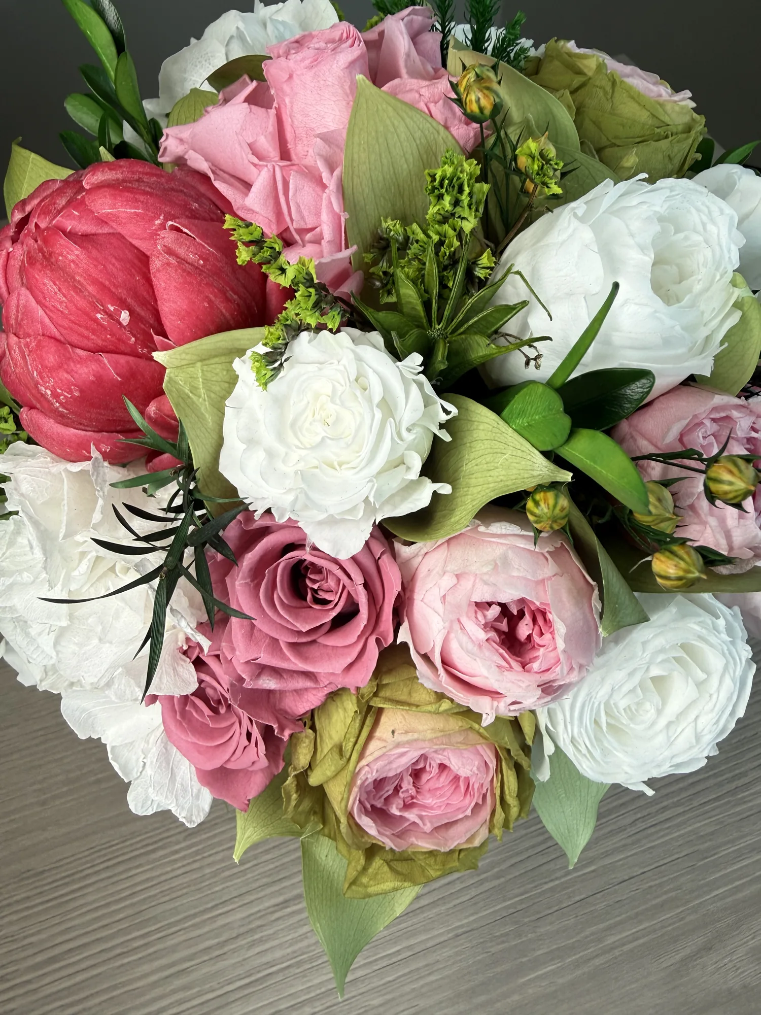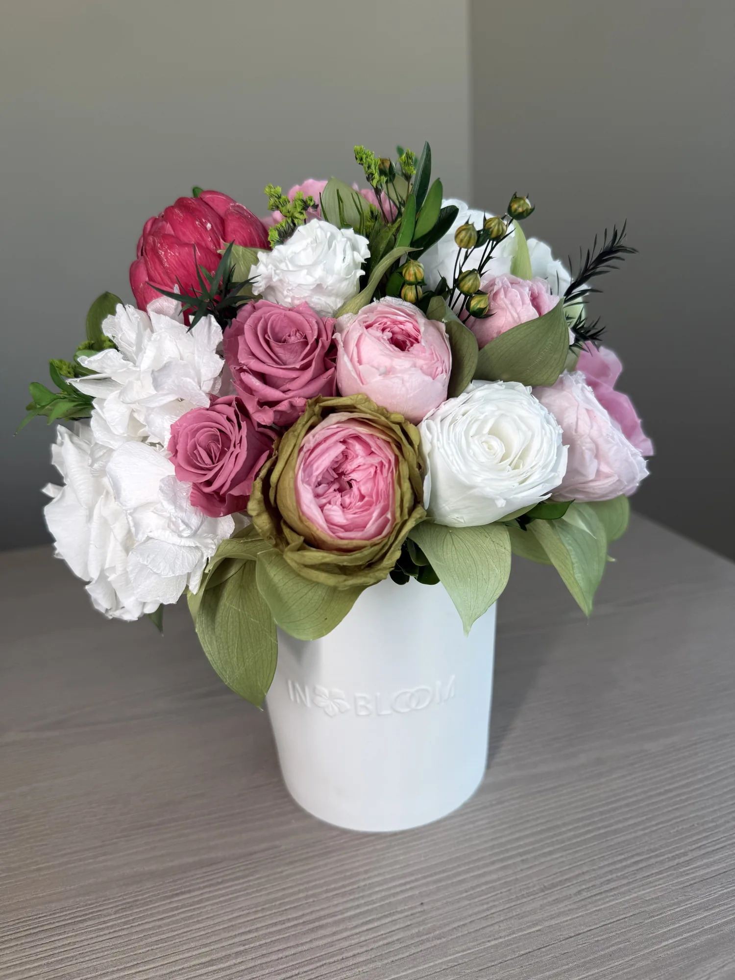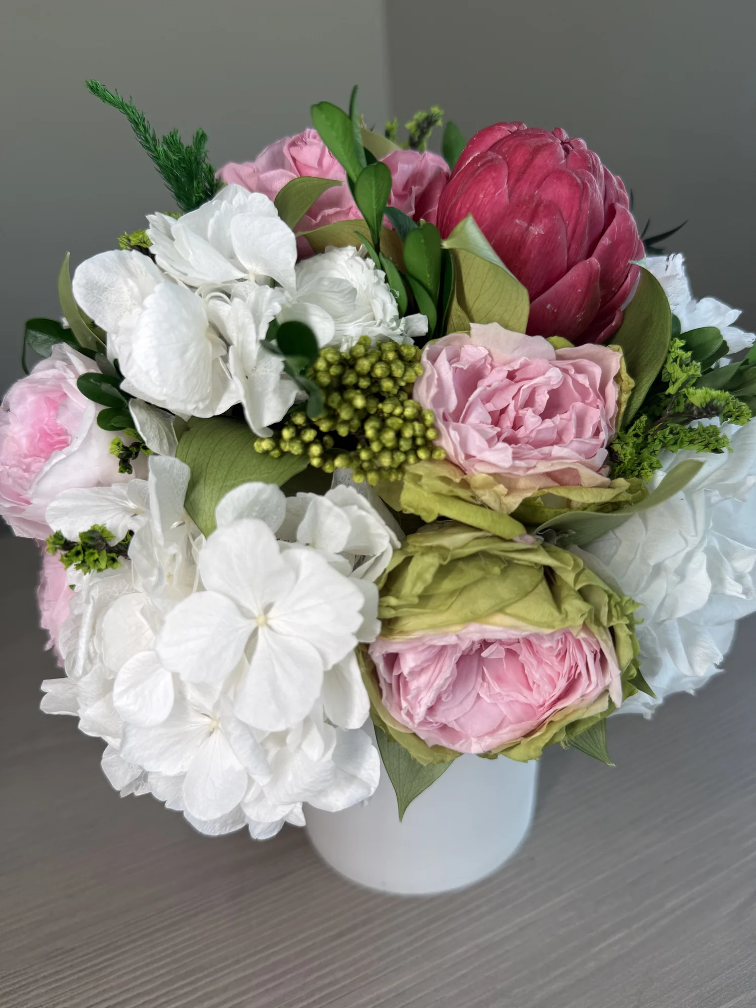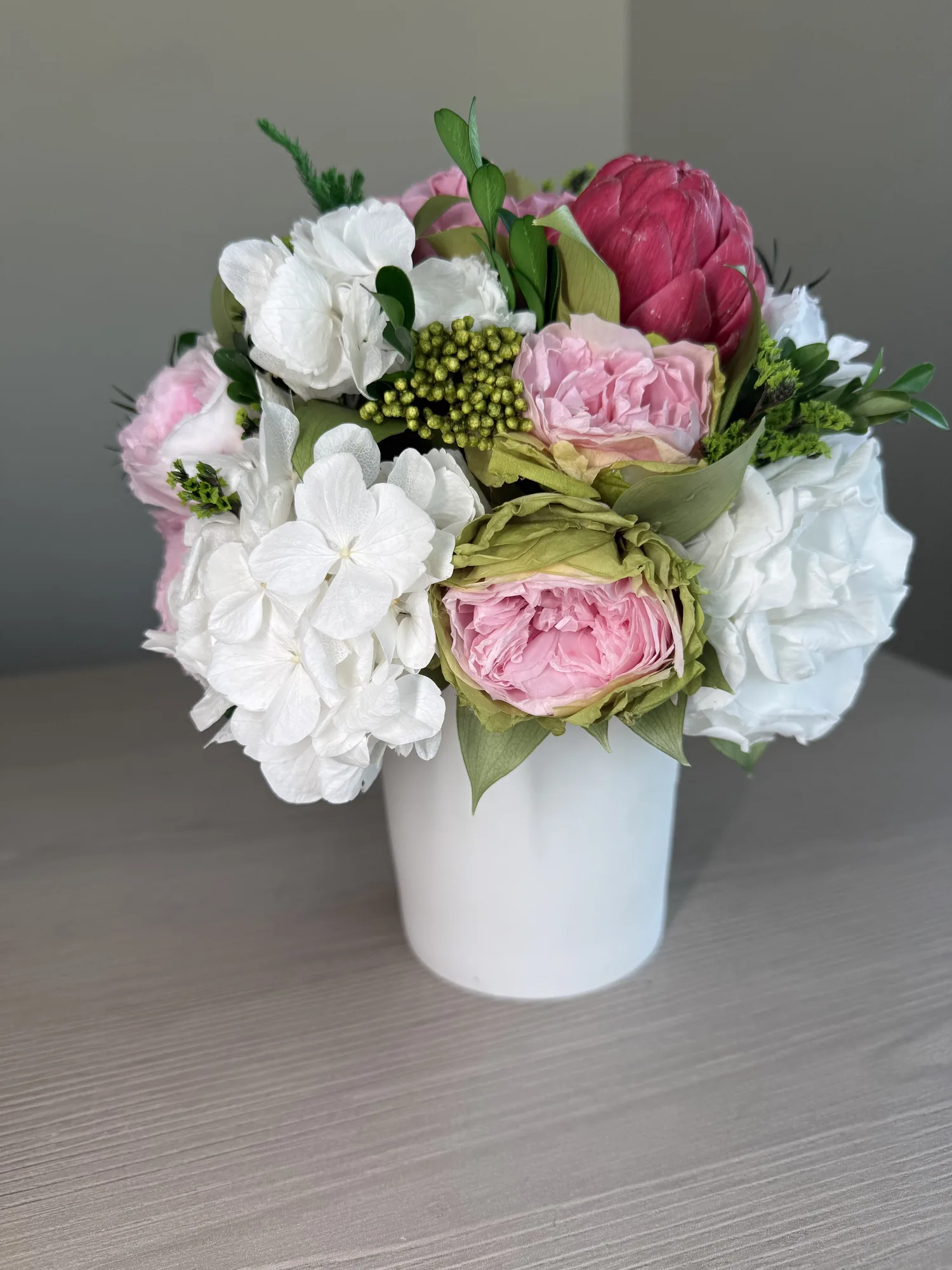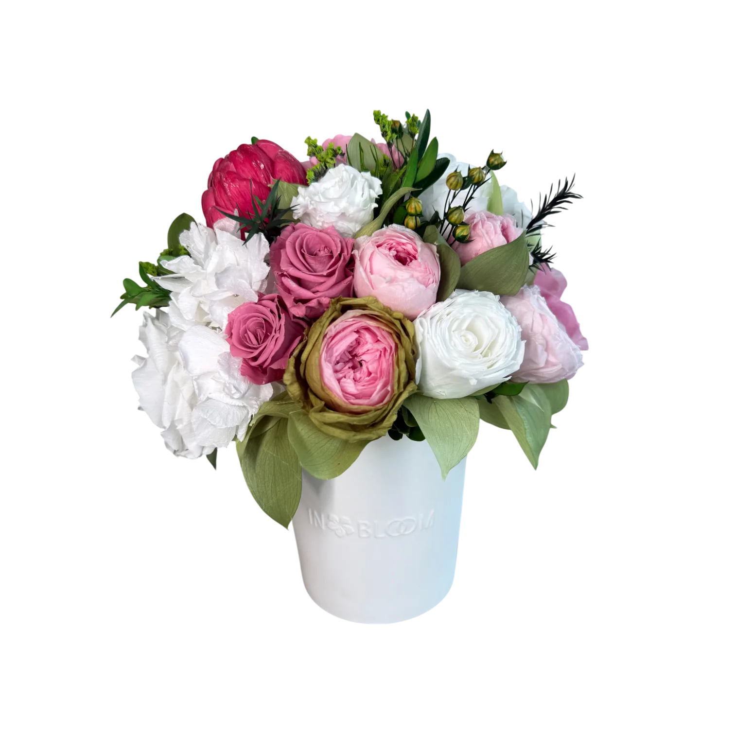 Luna is a poetic expression of natural beauty, evoking the softness of a gentle breeze through a blooming garden. This exquisite arrangement features bio-preserved white Classic & Garden roses, Hydrangeas, Artichoke and mix greens.