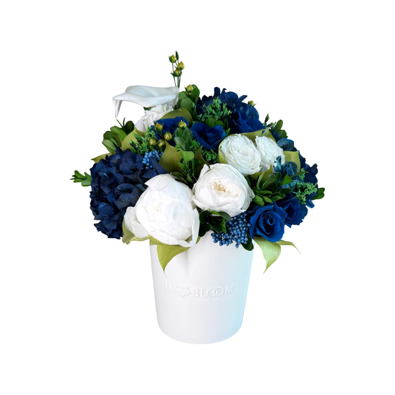 Luna is a poetic expression of natural beauty, evoking the softness of a gentle breeze through a blooming garden. This exquisite arrangement features bio-preserved white Classic & Garden roses, Peonie, Hydrangeas and greens.