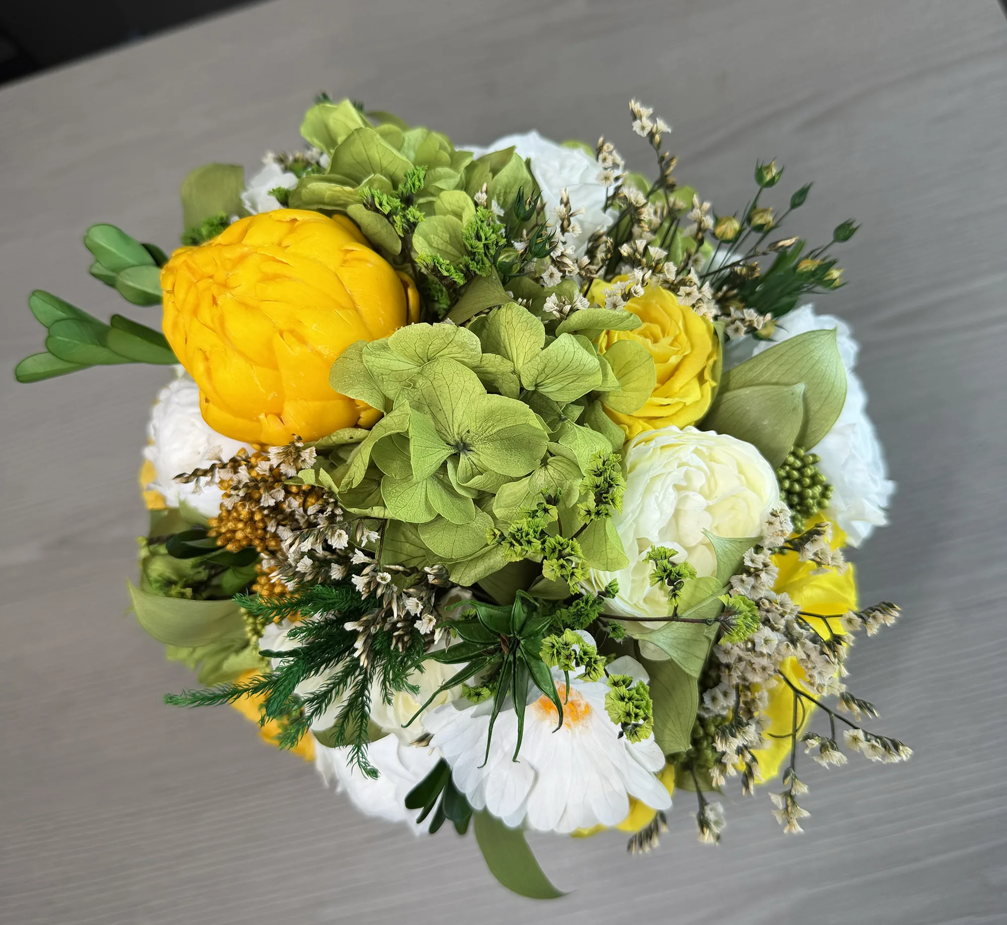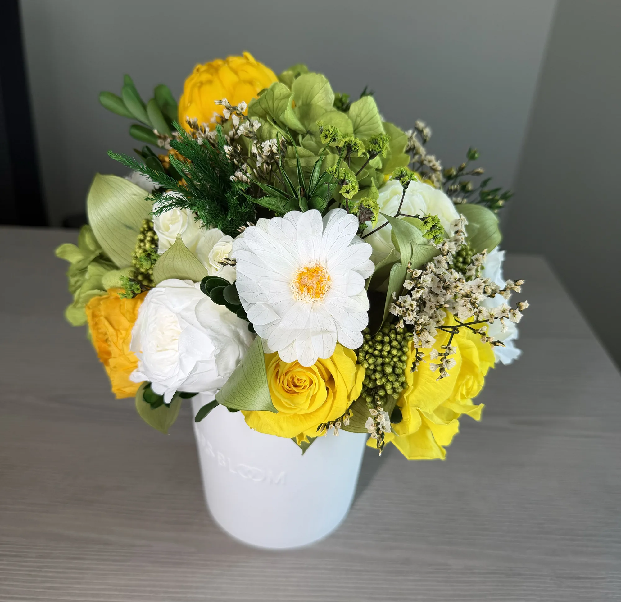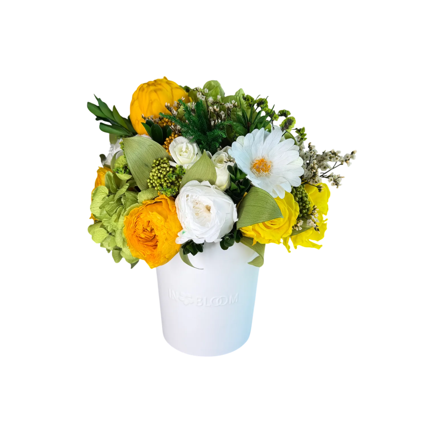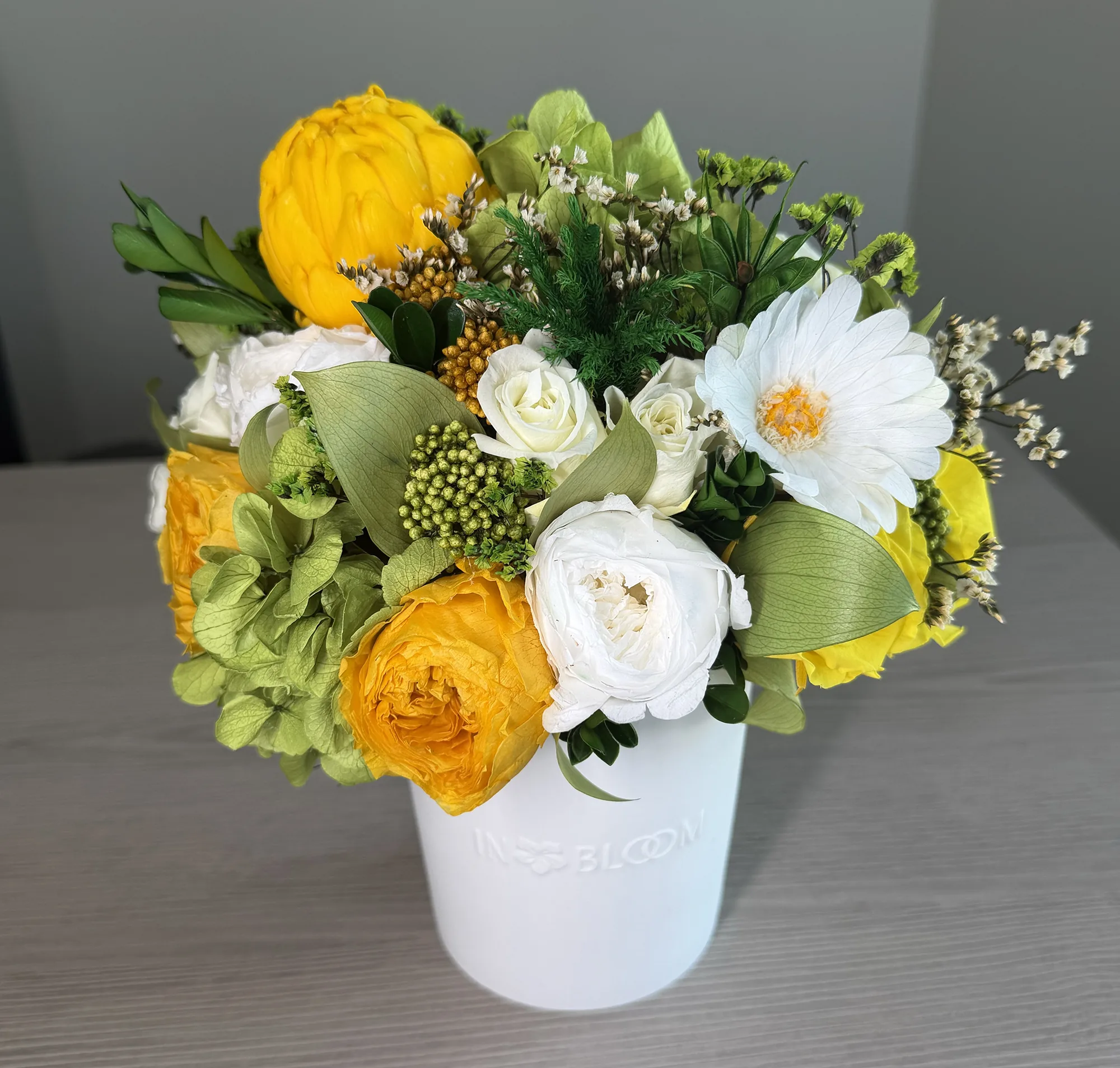 Luna is a poetic expression of natural beauty, evoking the softness of a gentle breeze through a blooming garden. This exquisite arrangement features bio-preserved white Classic & Garden roses, Daisy & Artchichoke, Hydrangeas and greens.
