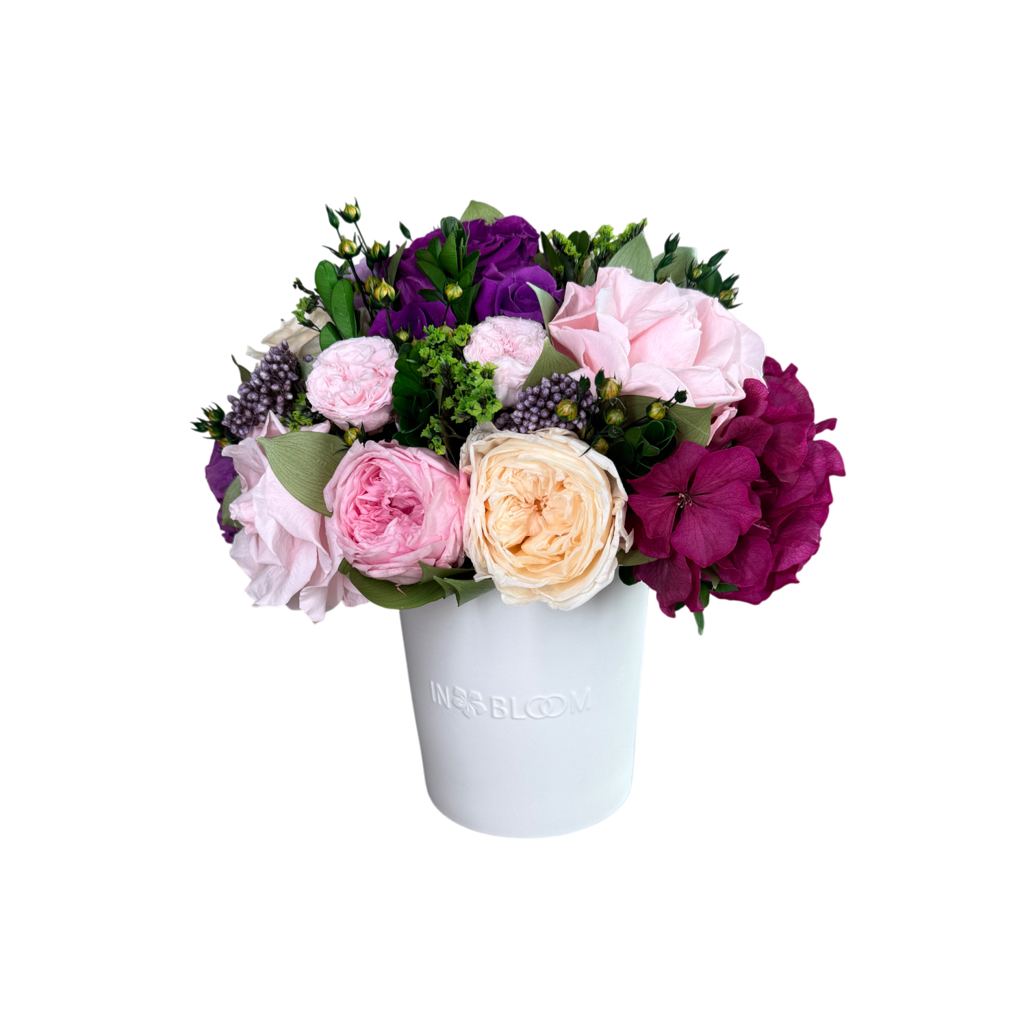 Luna is a poetic expression of natural beauty, evoking the softness of a gentle breeze through a blooming garden. This exquisite arrangement features bio-preserved white Classic & Garden roses, Hydrangeas and mix greens.