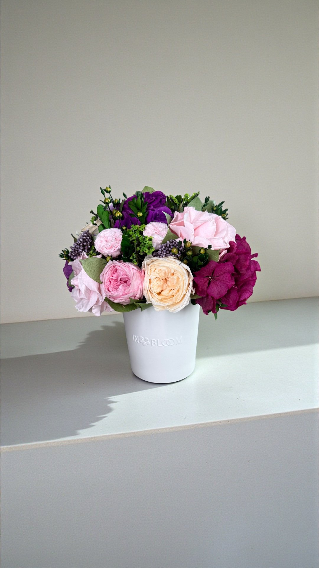 This piece is crafted exclusively from 100% natural flowers that have been bio-preserved to last up to one year without the need for water or maintenance. Please note that each arrangement is uniquely designed by our in-house florists, so natural variations in color, shape, and composition are to be expected.