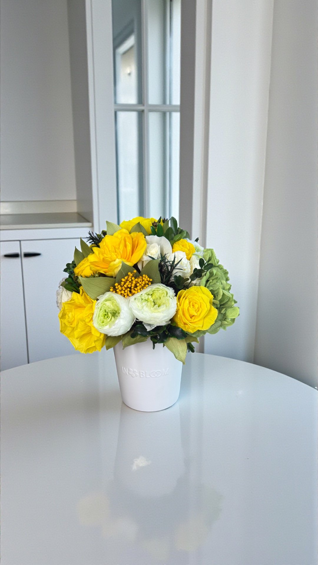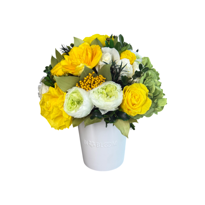 This piece is crafted exclusively from 100% natural flowers that have been bio-preserved to last up to one year without the need for water or maintenance. Please note that each arrangement is uniquely designed by our in-house florists, so natural variations in color, shape, and composition are to be expected.