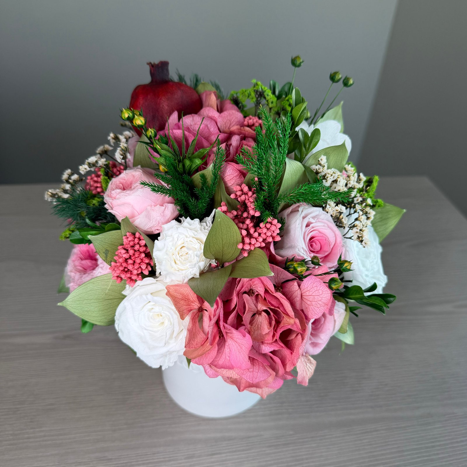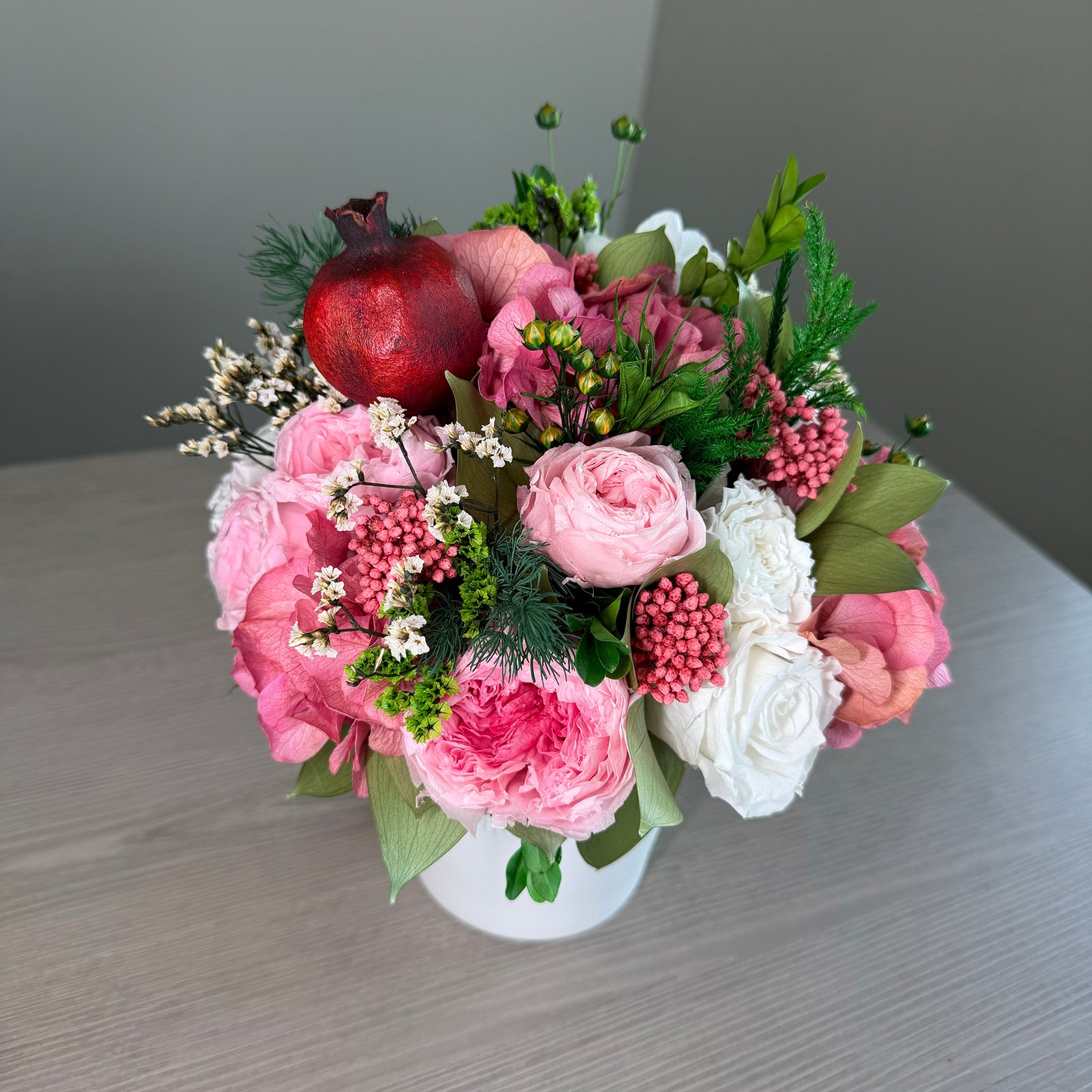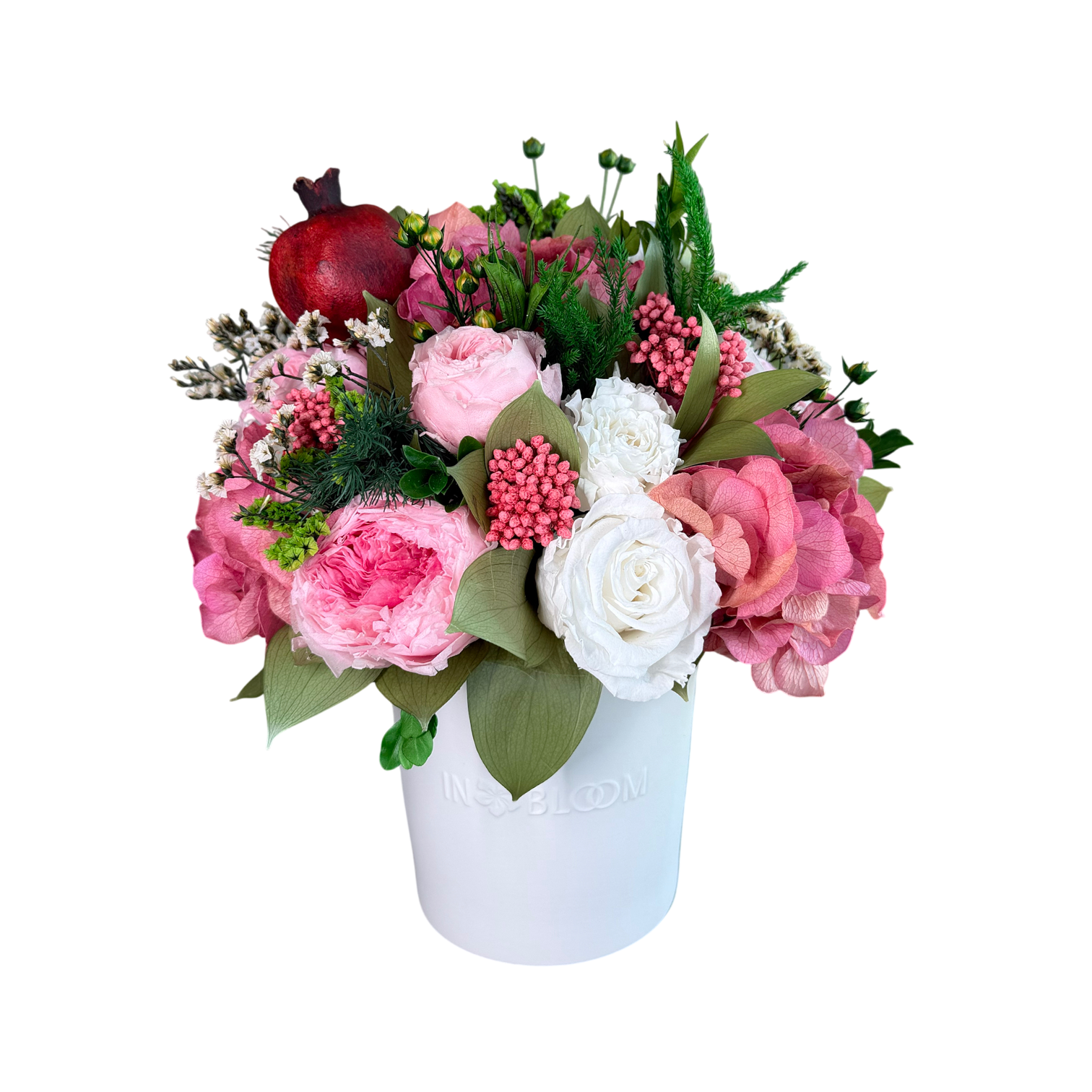 Luna is a poetic expression of natural beauty, evoking the softness of a gentle breeze through a blooming garden. This exquisite arrangement features bio-preserved white Classic & Garden roses, Hydrangeas and Dries Pomegranate with greens.