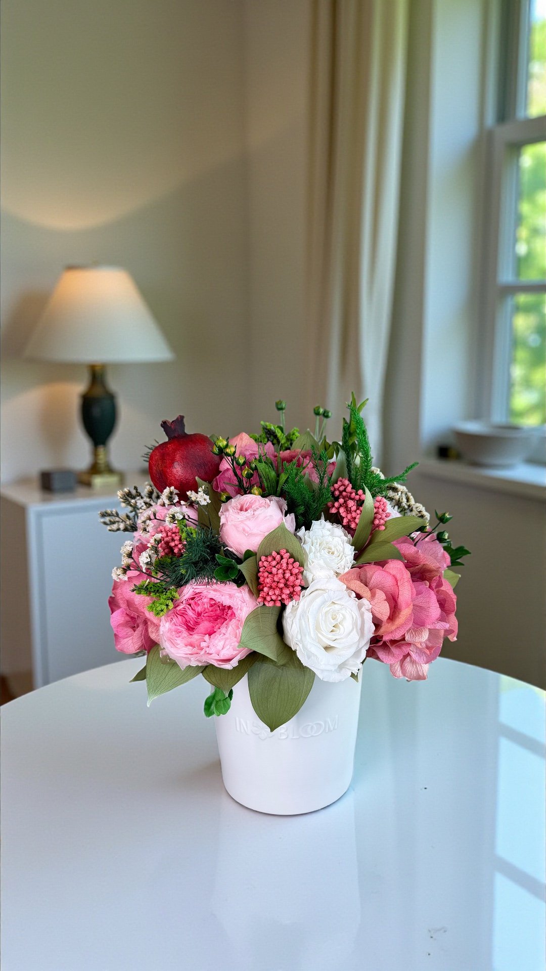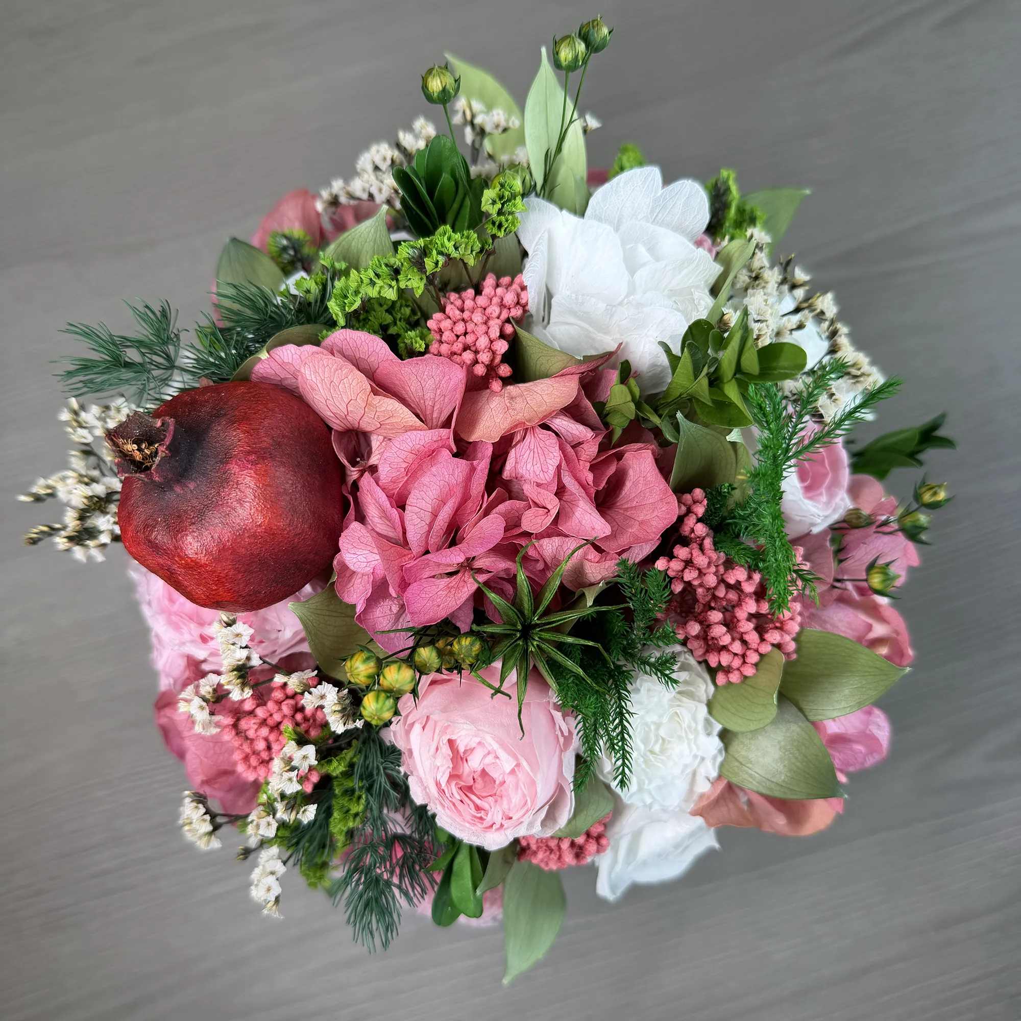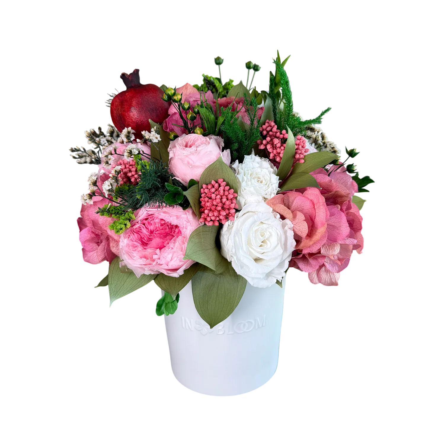 Luna is a poetic expression of natural beauty, evoking the softness of a gentle breeze through a blooming garden. This exquisite arrangement features bio-preserved white Classic & Garden roses, Hydrangeas and Dries Pomegranate with greens.