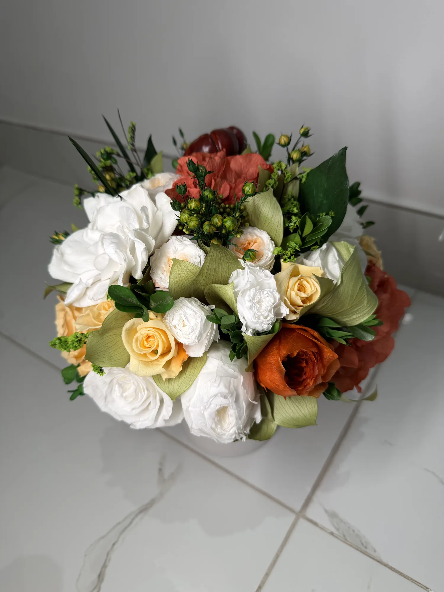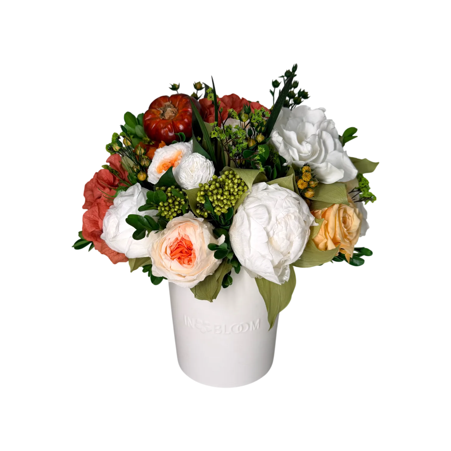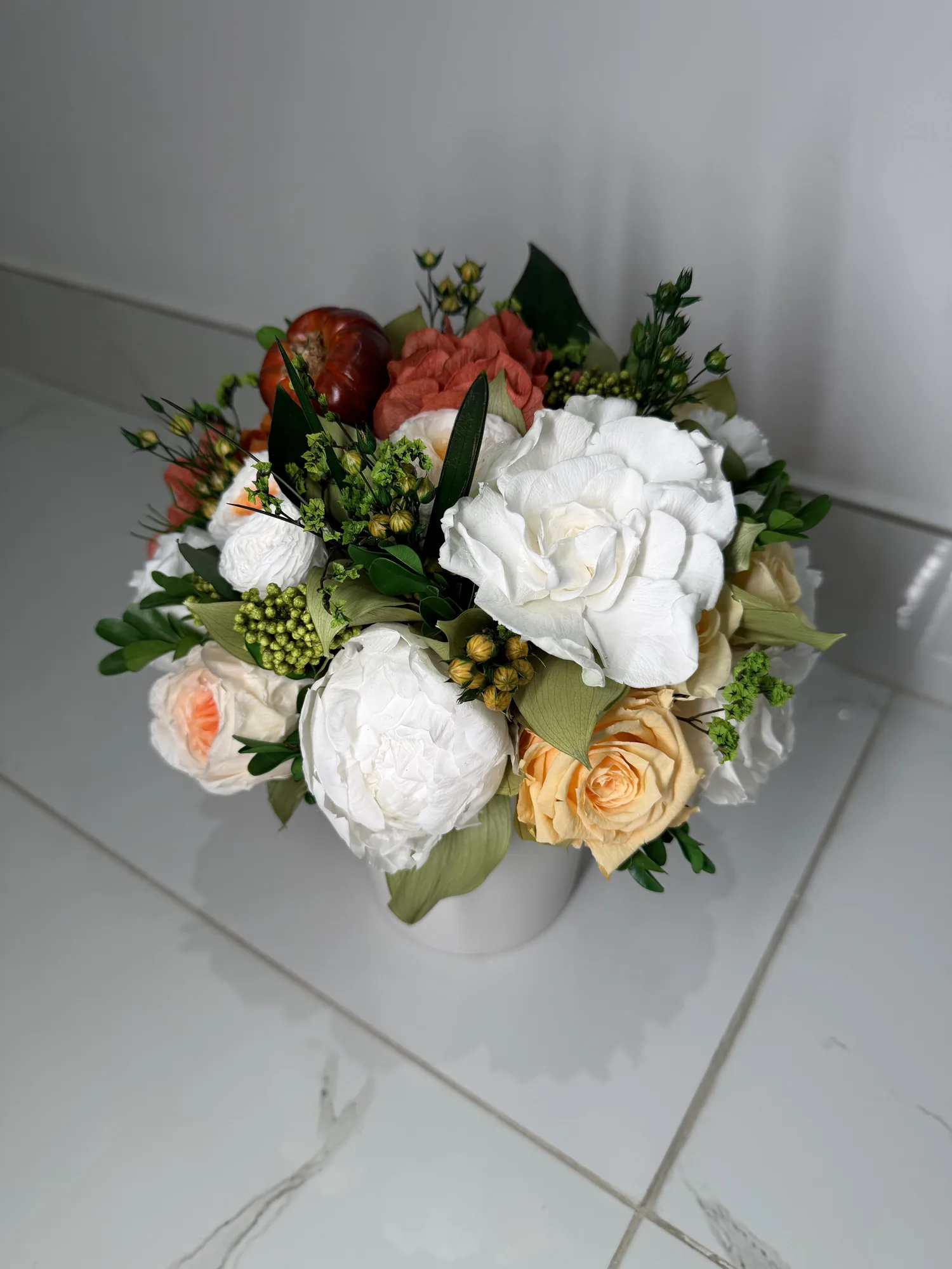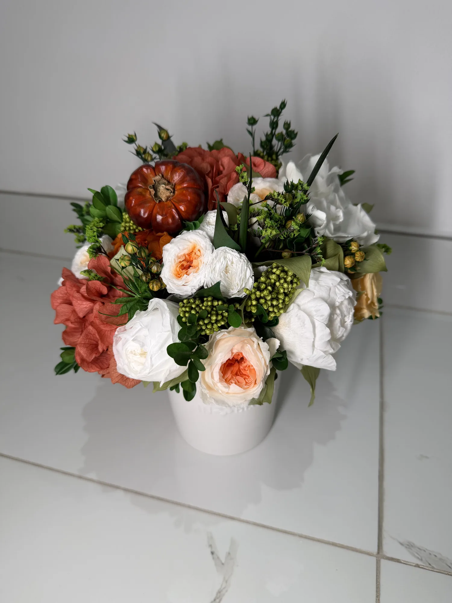 This piece is crafted exclusively from 100% natural flowers that have been bio-preserved to last up to one year without the need for water or maintenance. Please note that each arrangement is uniquely designed by our in-house florists, so natural variations in color, shape, and composition are to be expected.