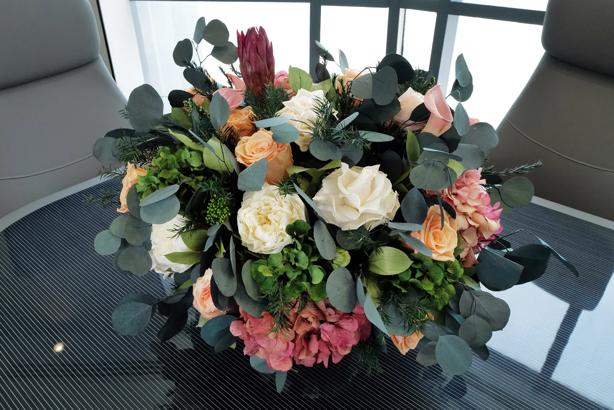 Sonrisa is a long-lasting preserved vase arrangement for Dubai interiors, offices, hotels, restaurants, yachts and private spaces, designed to stay elegant for over a year without water or daily care.