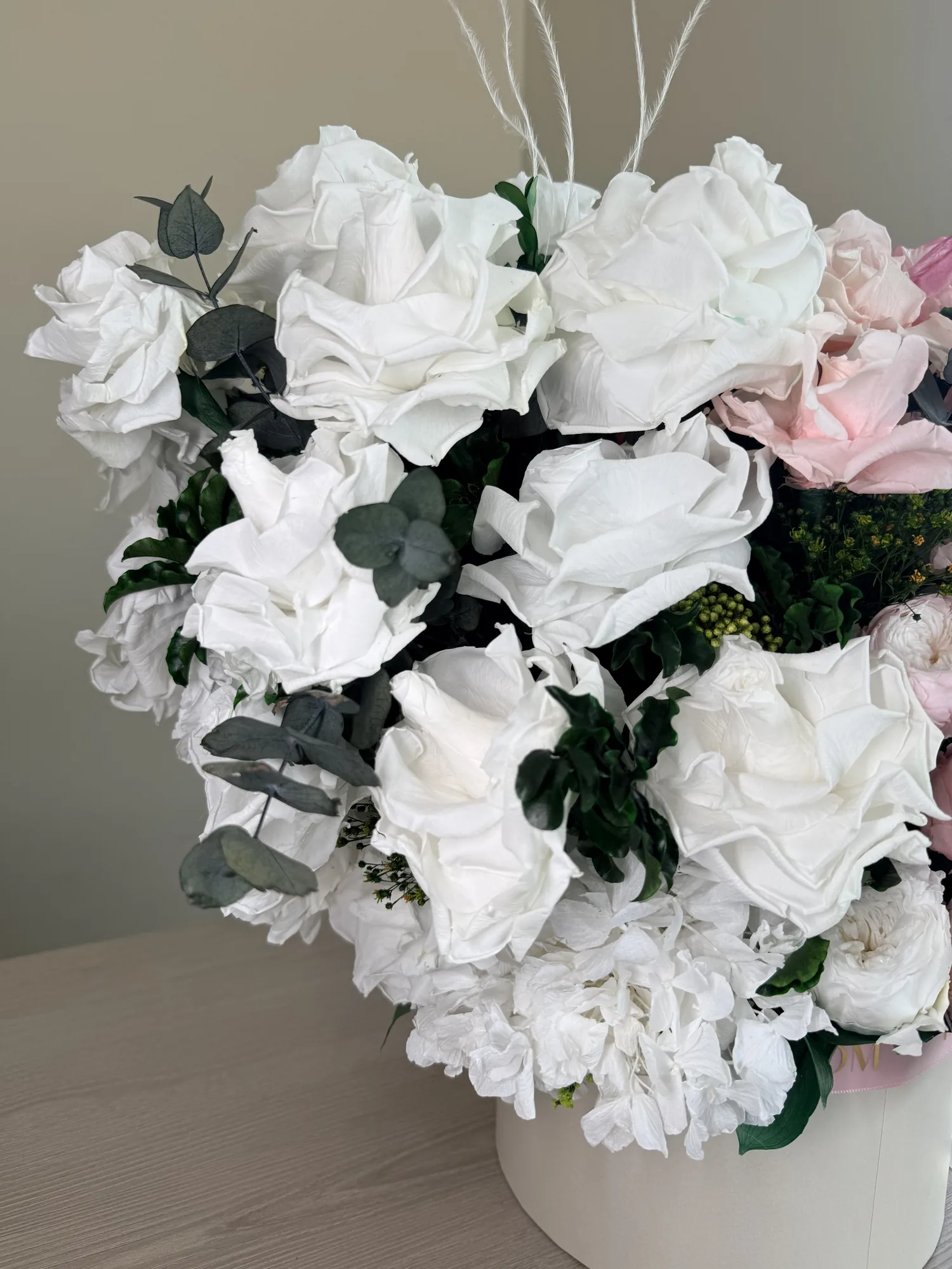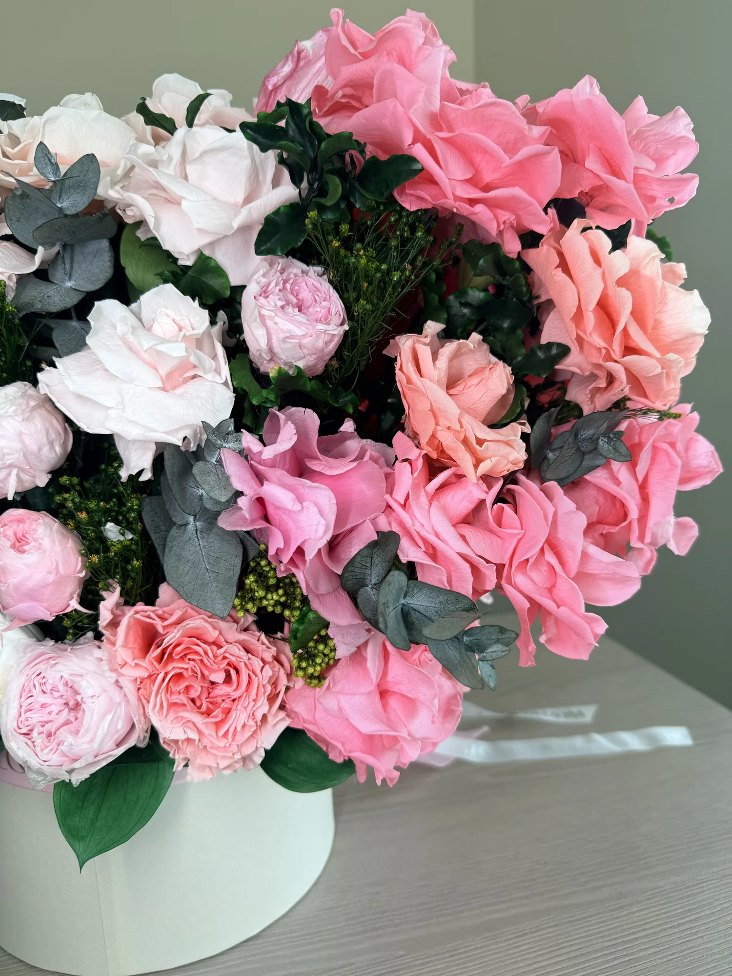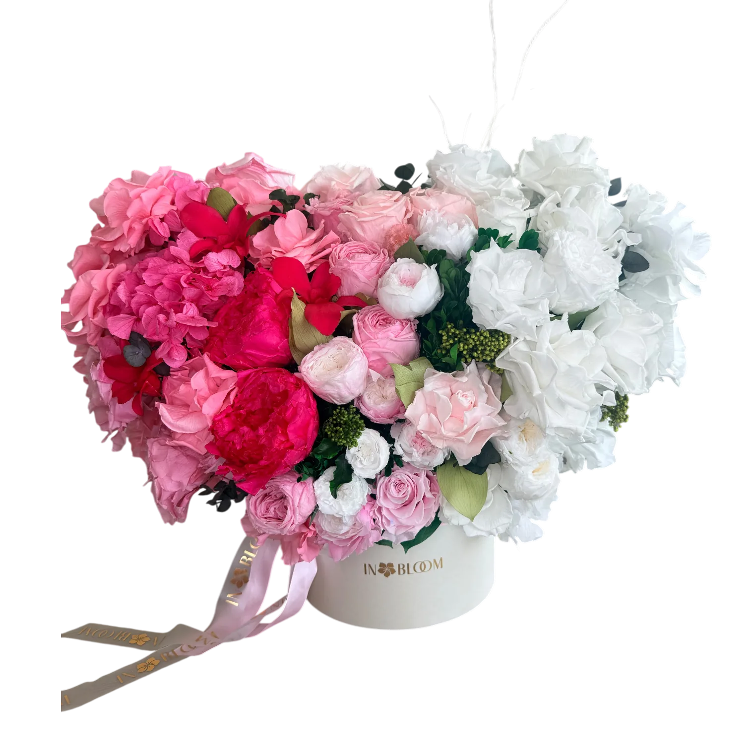 Audrey Hot Pink & White is a long-lasting preserved flower gift box for Dubai celebrations, romantic gifting and premium home display, designed to stay elegant for over a year without water or daily care.