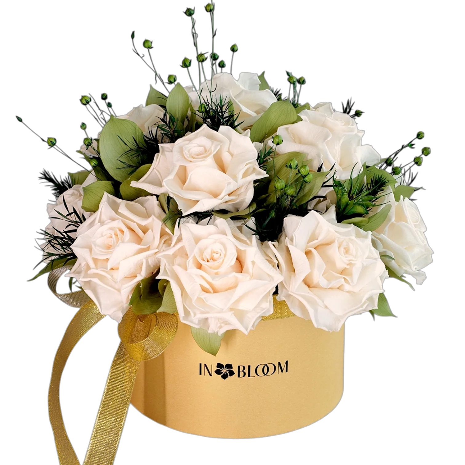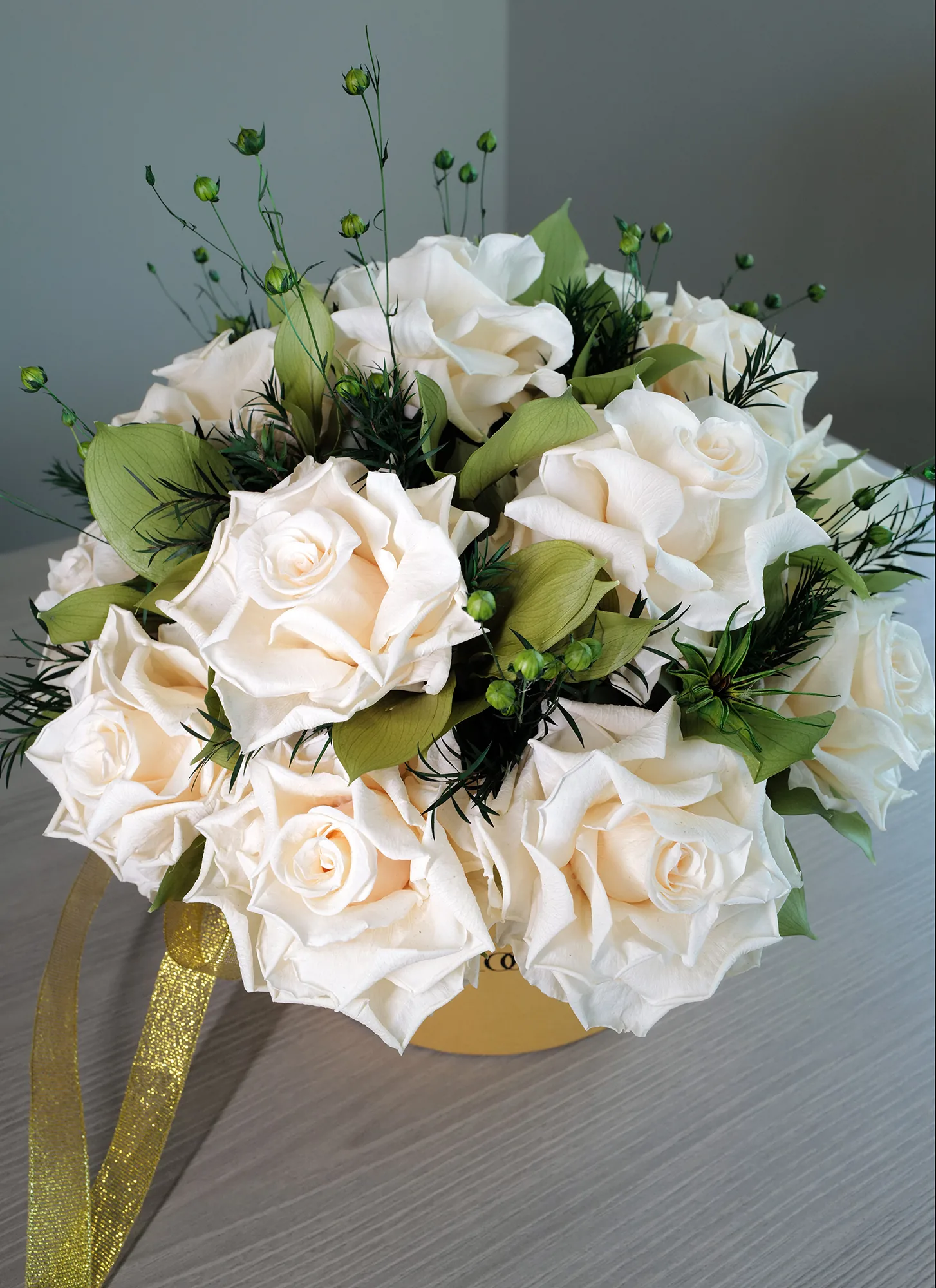 Olivia is big gold color flower box of long-lasting blooms featuring fresh and stunning beige french roses combined with green orange leaves and accented with dried flax. A perfect WOW-effect gift for various occasions that will make your loved ones happy for entire Year.