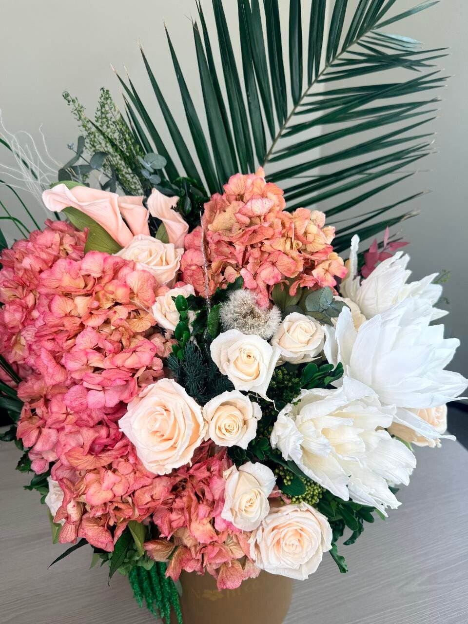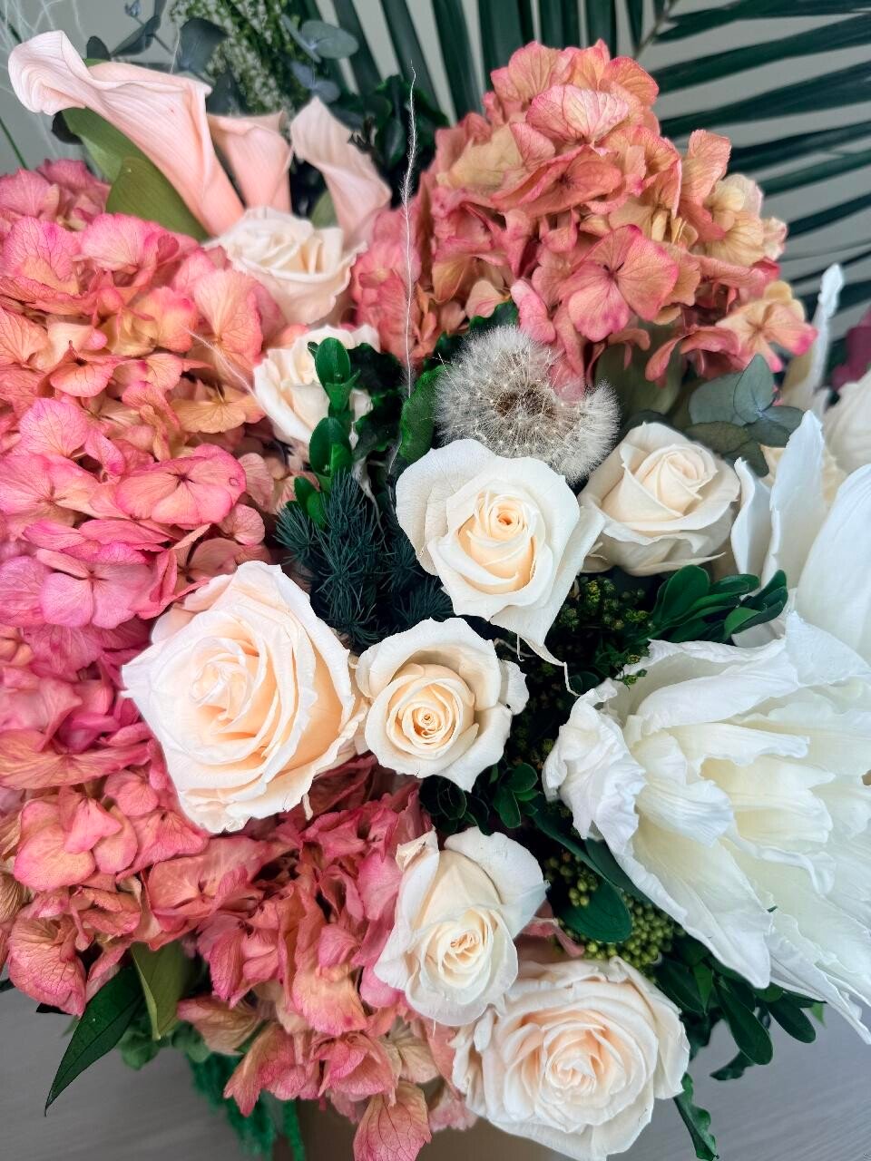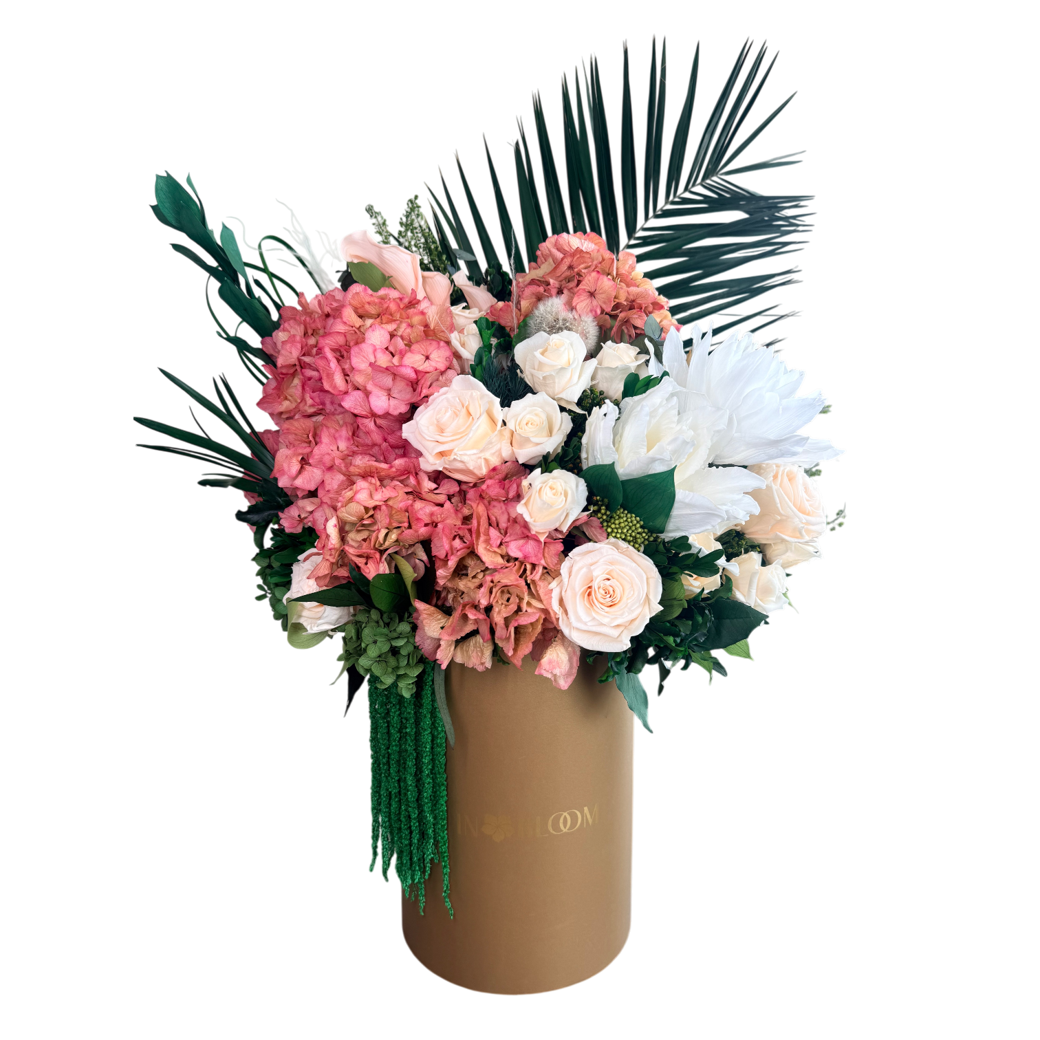 | Flower TypeExplore Our Premium Floral Selection The Flower Type attribute allows you to browse our exquisite collection based on the specific flowers used in each arrangement. From timeless roses and elegant orchids to lush peonies and vibrant dahlias, our curated selection ensures you find the perfect blooms for any occasion. Each flower type is carefully chosen for its beauty, longevity, and sophistication, offering both fresh and bio-preserved options. Whether you\'re looking for classic bouquets, statement floral pieces, or sustainable arrangements, our diverse range of flowers guarantees elegance that lasts. Find the perfect floral arrangement tailored to your taste and style. | Calla Lily, Hydrangeas, Lily, Roses |