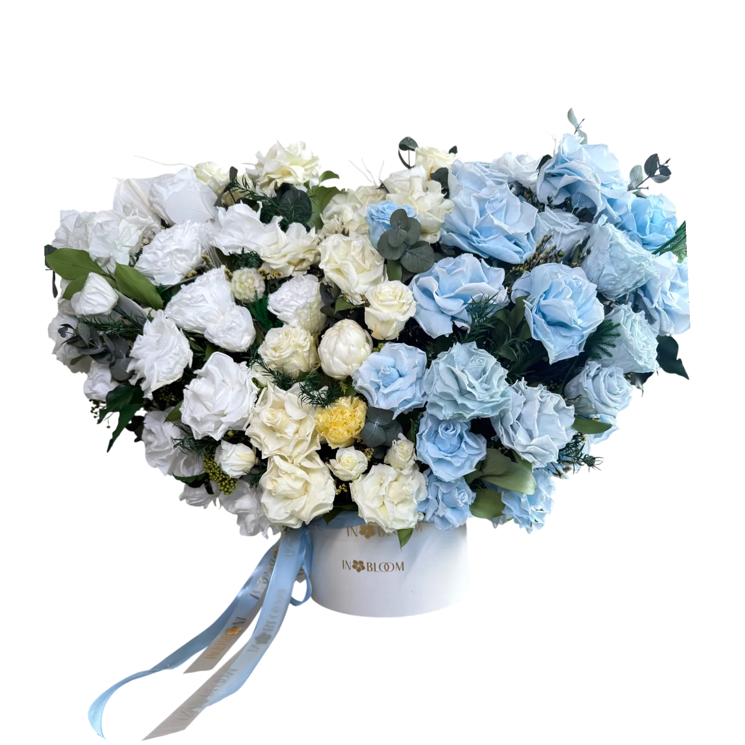 A giant heart-shaped preserved flower arrangement in a premium pearlescent white box, featuring a delicate mix of romantic and garden roses with fresh green accents. This stunning composition brings elegance and harmony to any space — a luxurious gift with a guaranteed wow-effect.