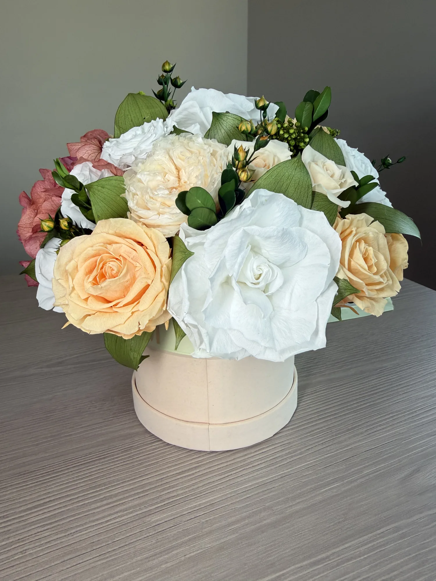Elis, our petite flower box, is a whimsical arrangement featuring a delightful mix of bio-preserved garden and classic roses and hydrangeas – a perfect gift for various occasions. Long-lasting happiness guaranteed!