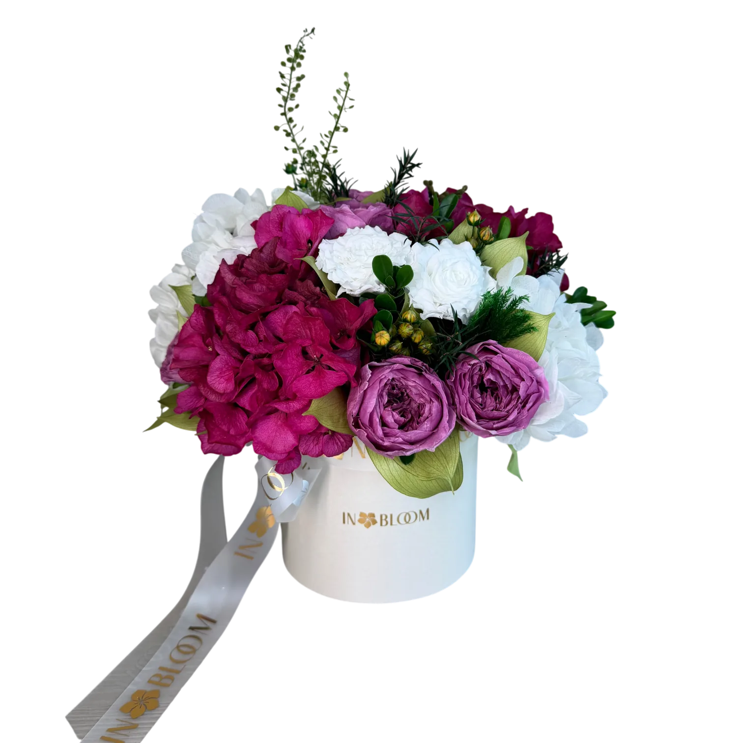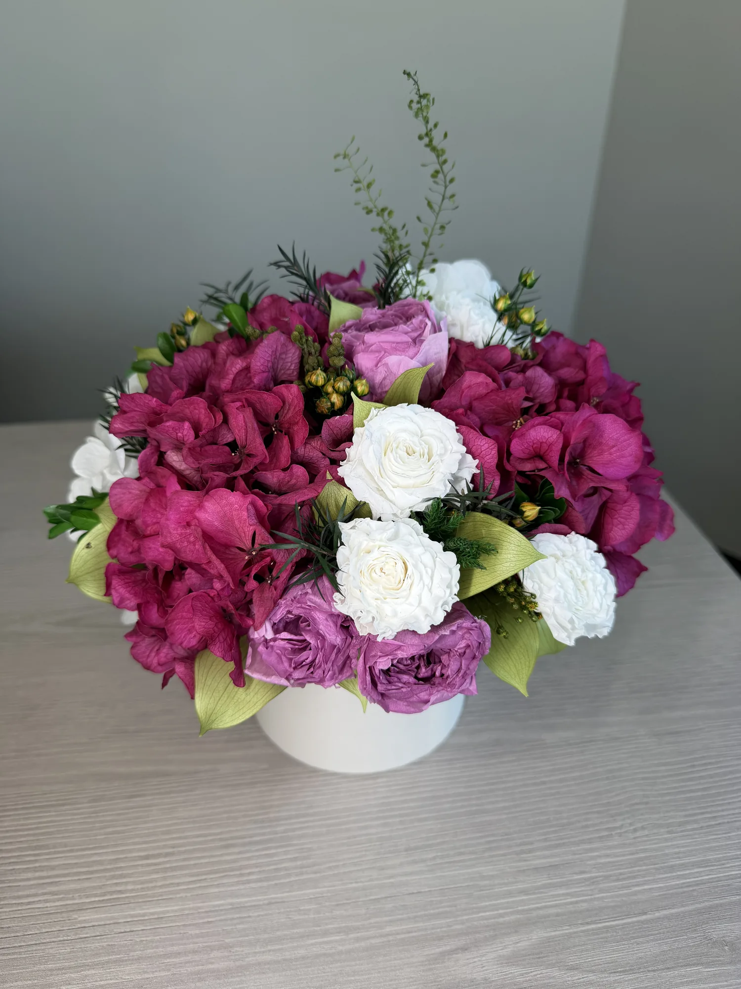 Elis, the petite flower box, is a whimsical arrangement featuring stunning purple and white hydrangeas and garden rose and white romantic rose with green orange leaves and accented with dried flax.