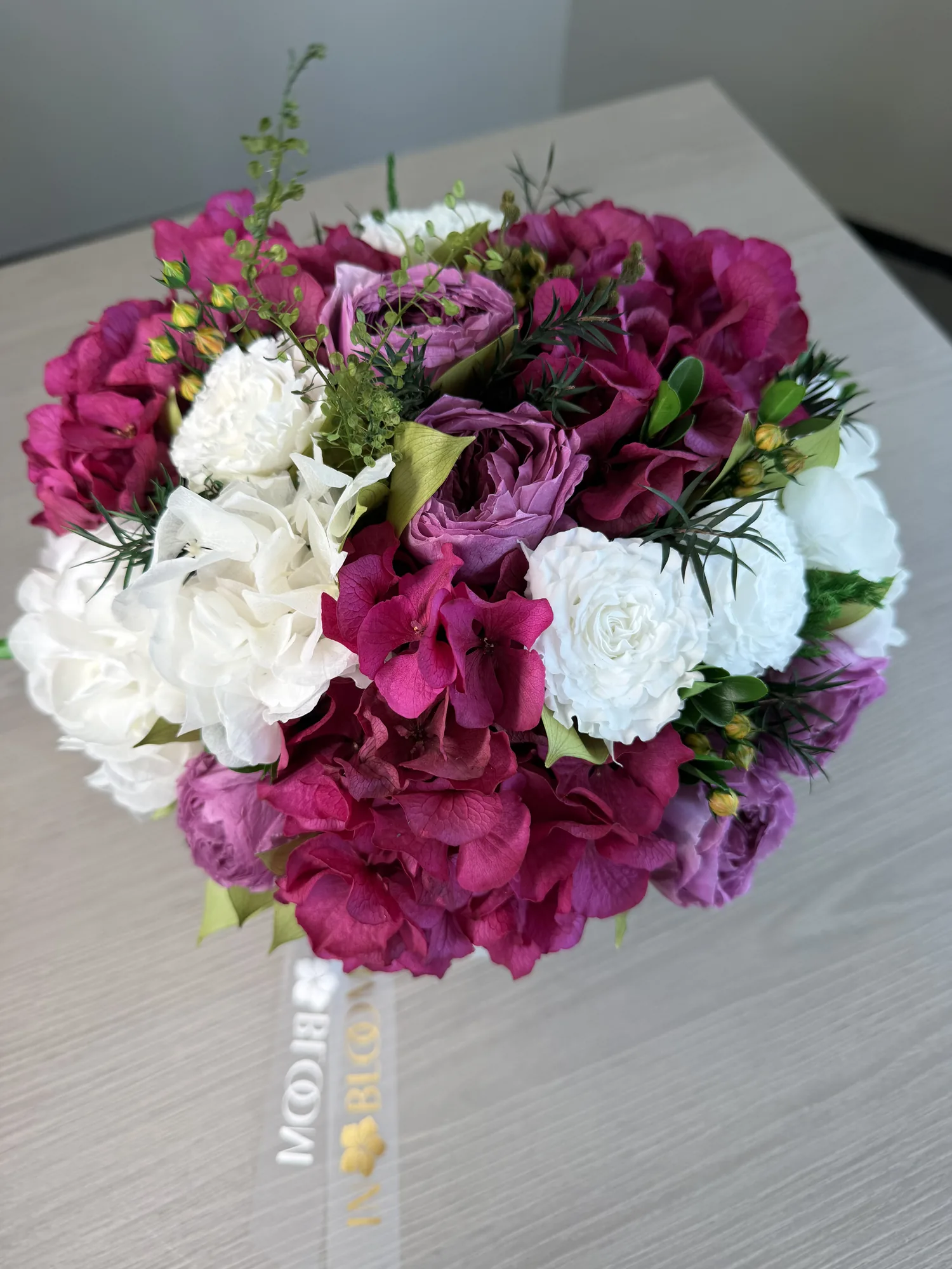 This piece is crafted exclusively from 100% natural flowers that have been bio-preserved to last up to one year without the need for water or maintenance. Please note that each arrangement is uniquely designed by our in-house florists, so natural variations in color, shape, and composition are to be expected.