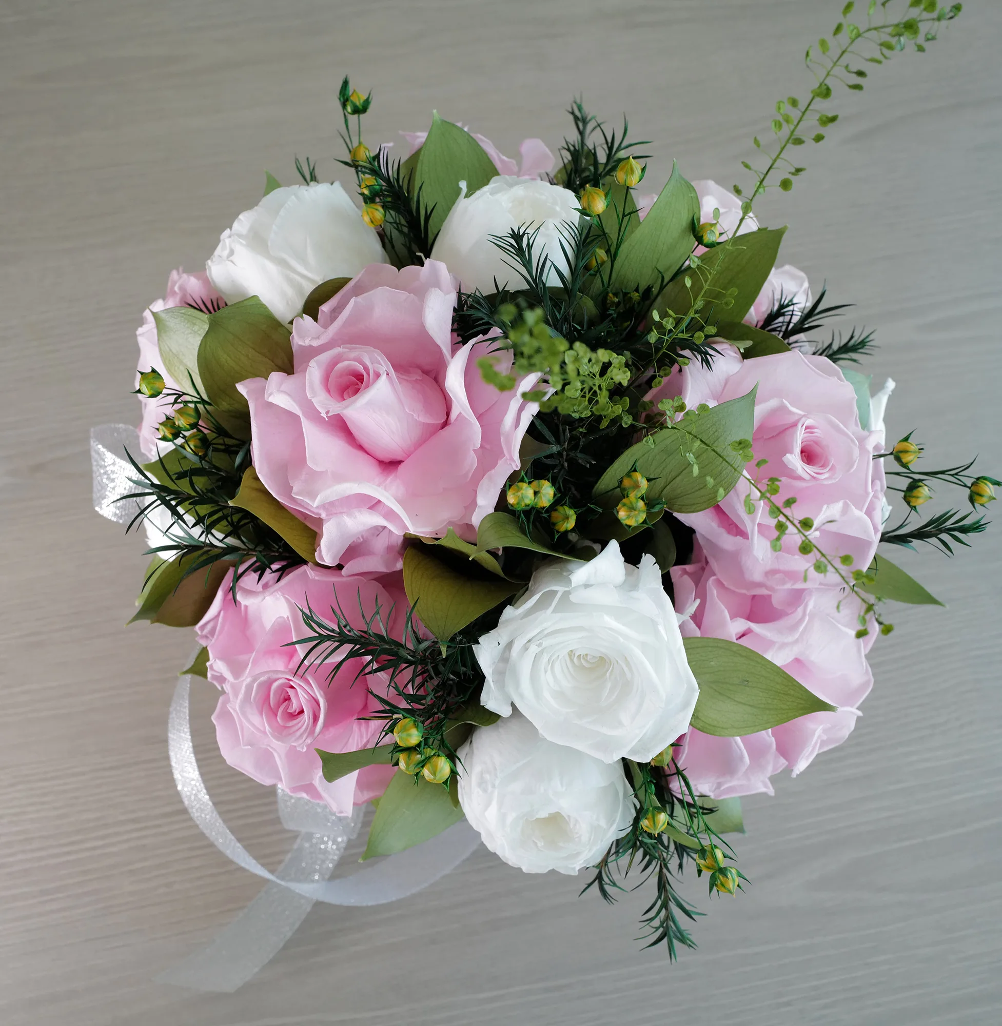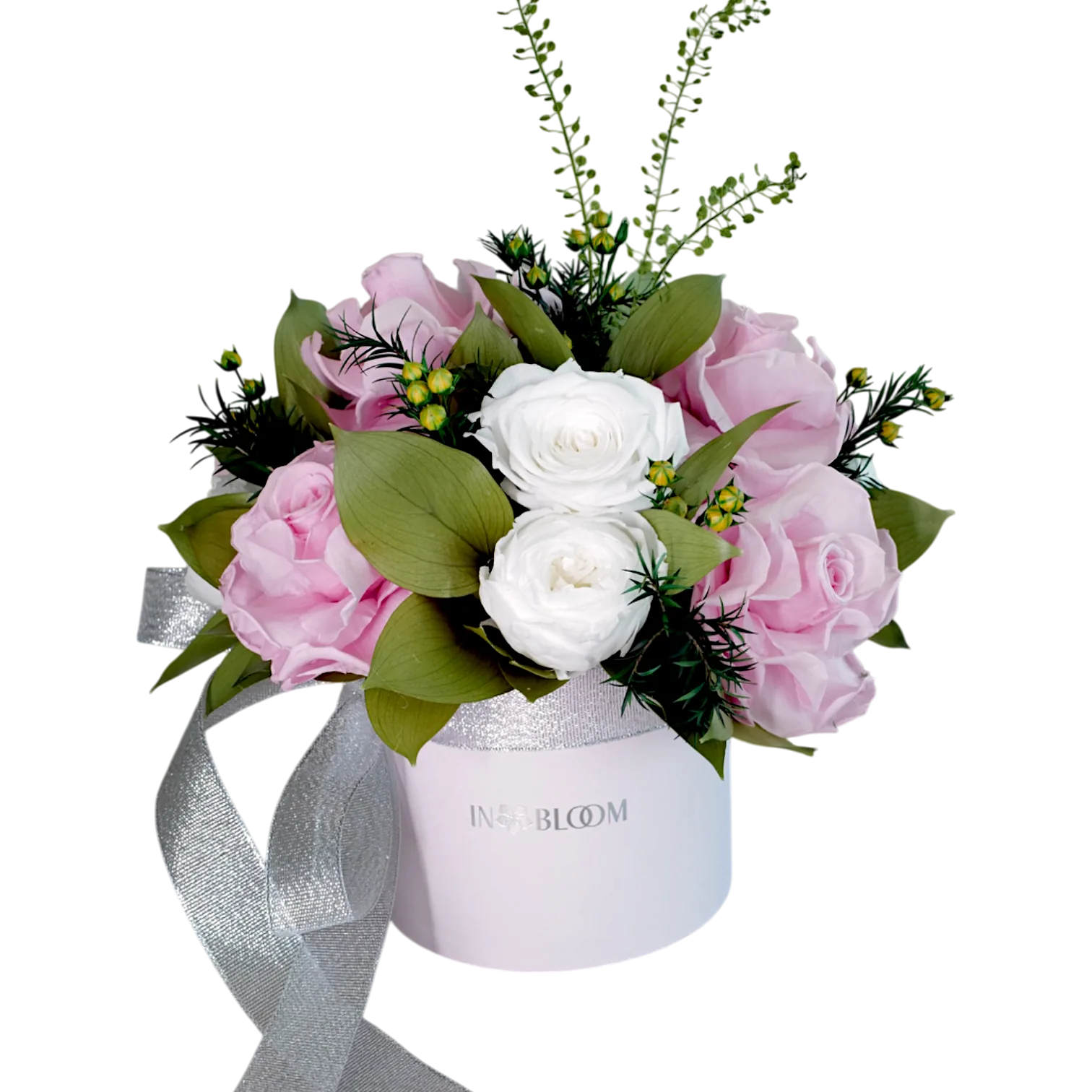 Elis, the petite flower box, is a whimsical arrangement featuring a delightful mix of white and light pink French roses perfect for various occasions. Long-lasting happiness guaranteed!
