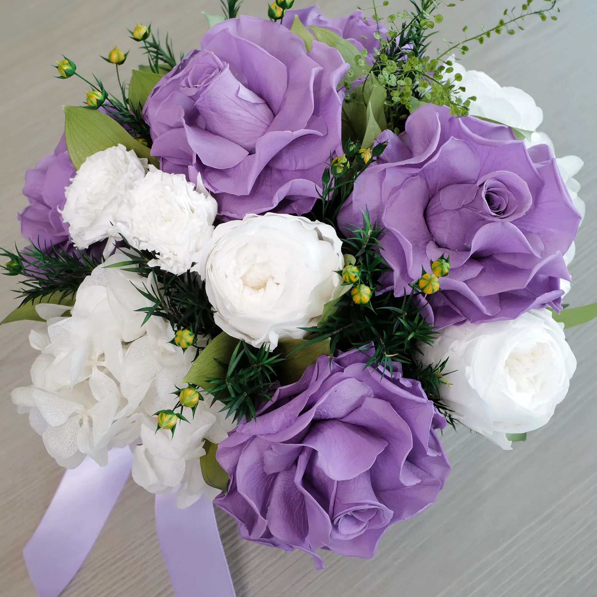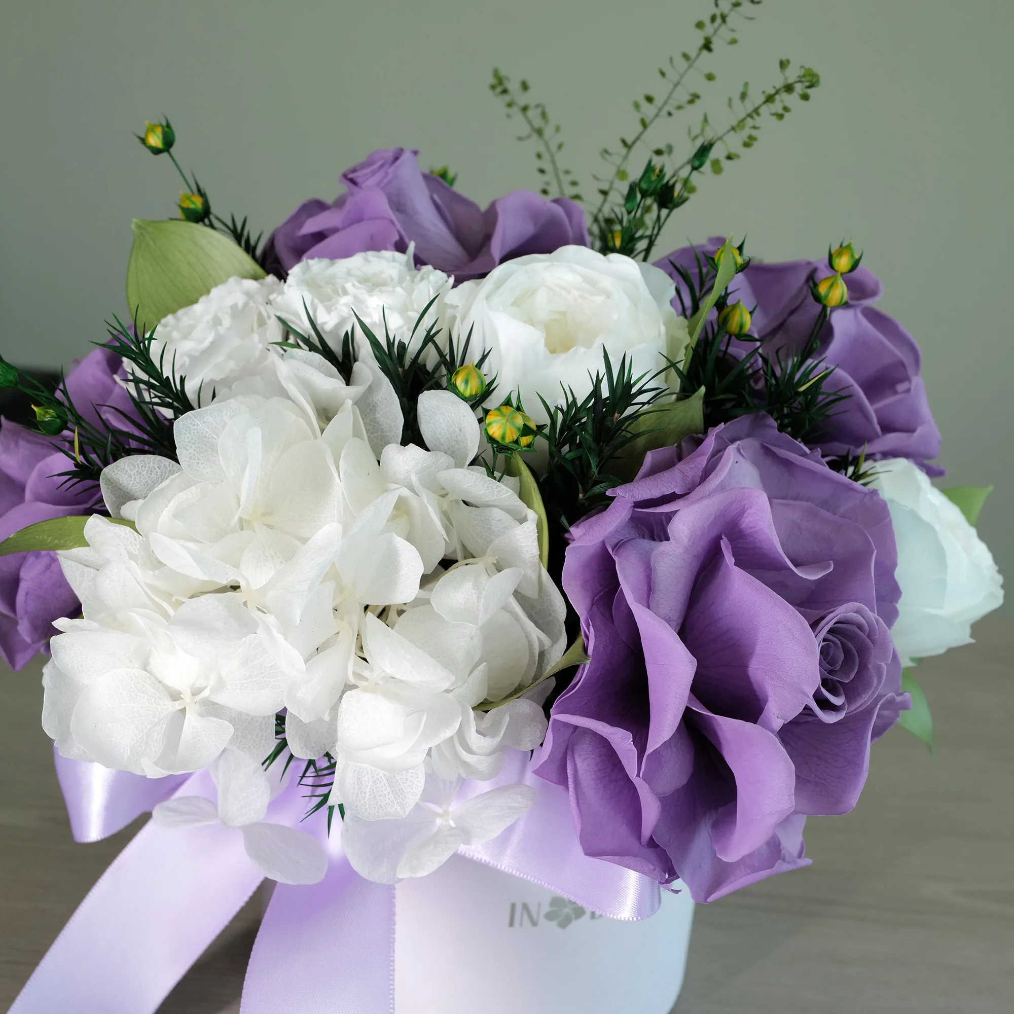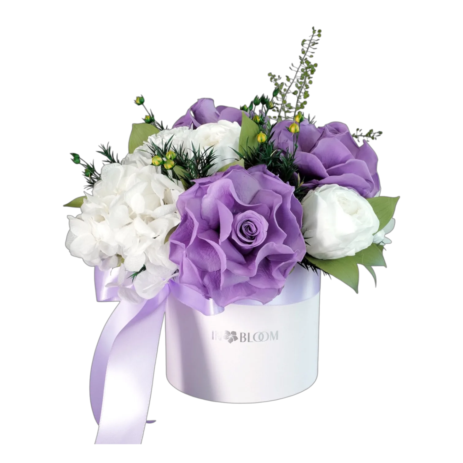 Elis, the petite flower box, is a whimsical arrangement featuring a delightful mix of white and purple French roses perfect for various occasions. Long-lasting happiness guaranteed!