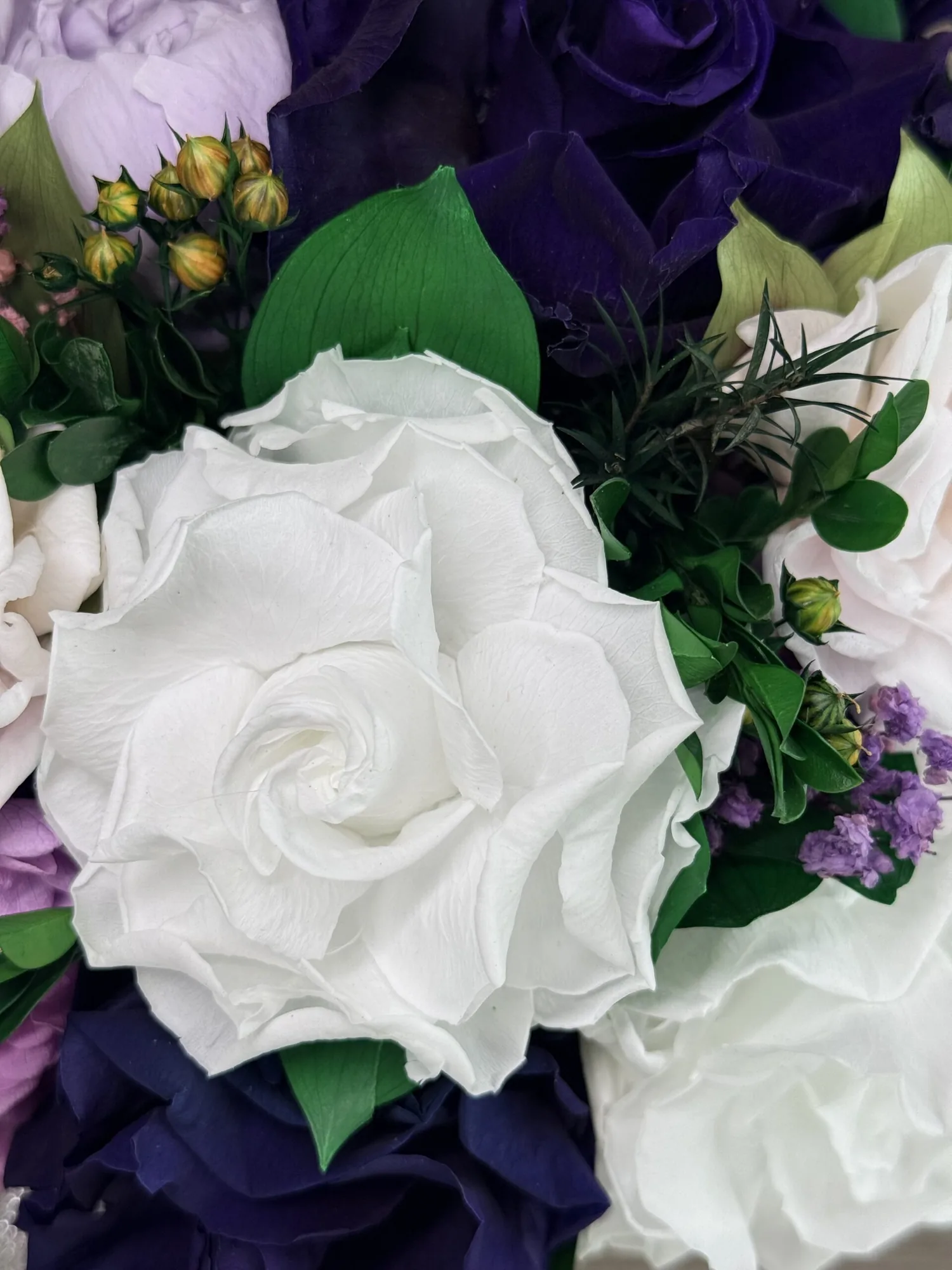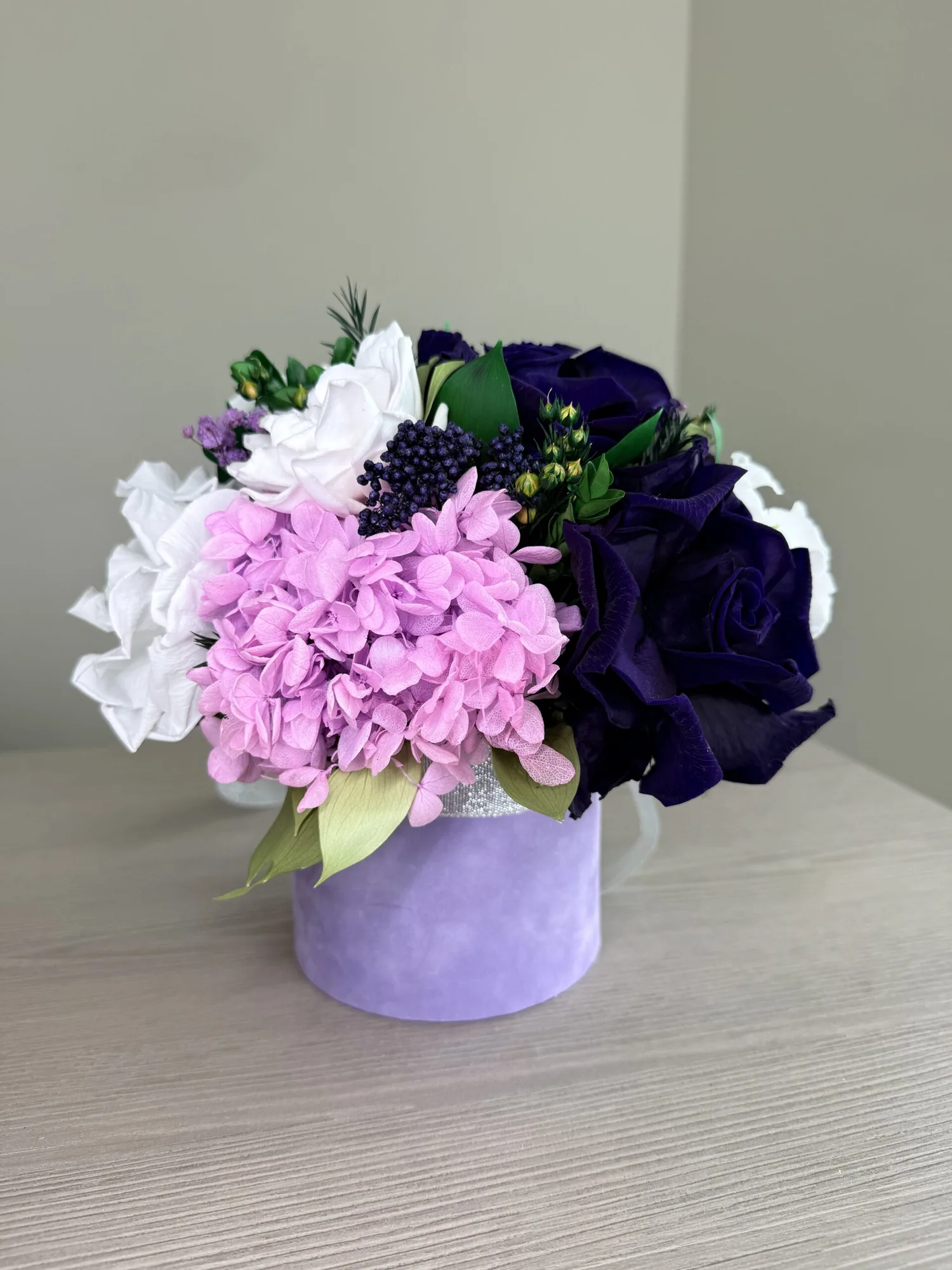 Ellis – Royal Serenity is a luxury preserved flower gift box created for elegant gifting and decorative display. The composition combines rich royal tones with soft preserved botanicals, giving the arrangement a polished, ceremonial character without requiring water, vase changes or daily care.