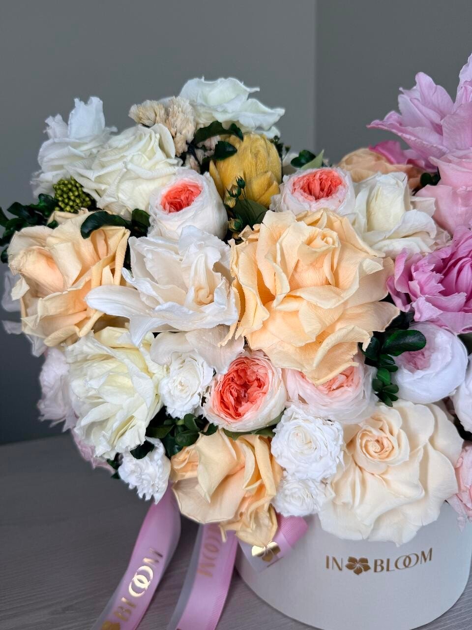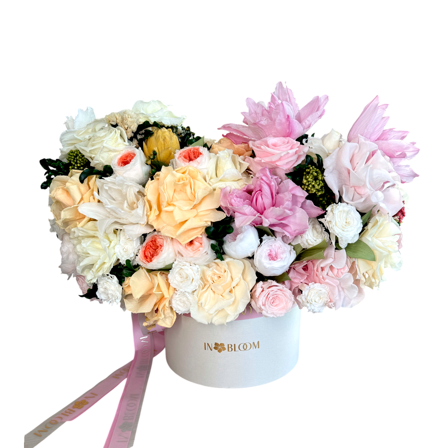 This piece is crafted exclusively from 100% natural flowers that have been bio-preserved to last up to one year without the need for water or maintenance. Please note that each arrangement is uniquely designed by our in-house florists, so natural variations in color, shape, and composition are to be expected.